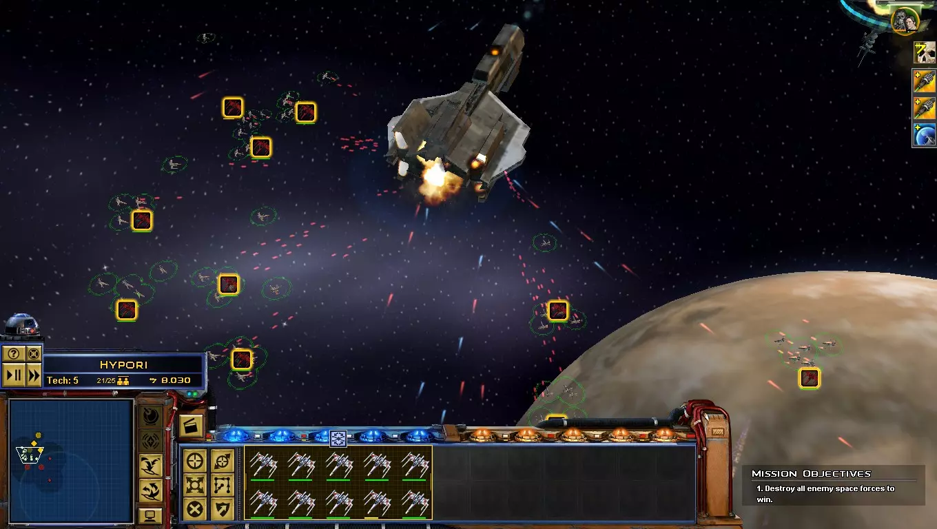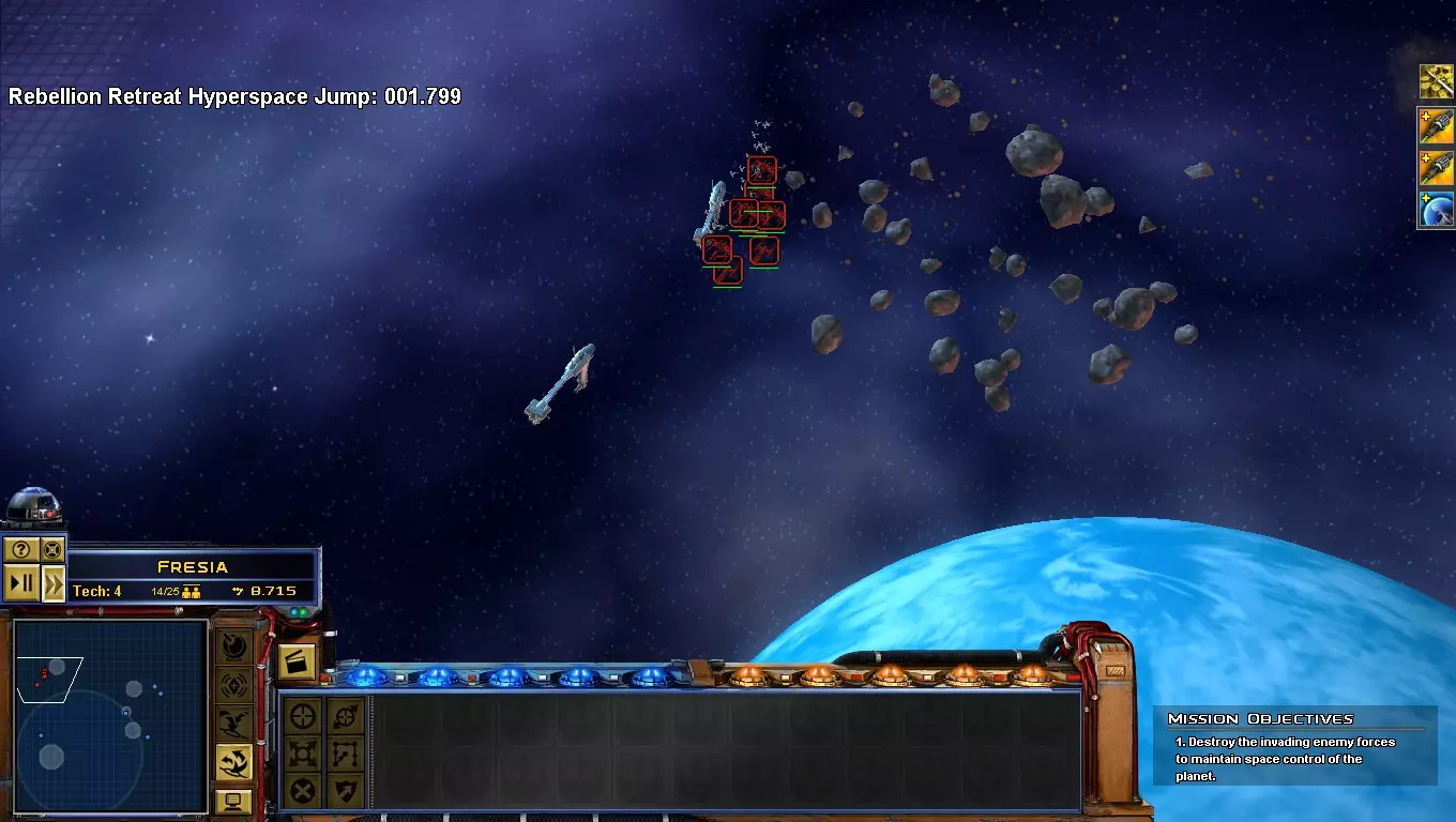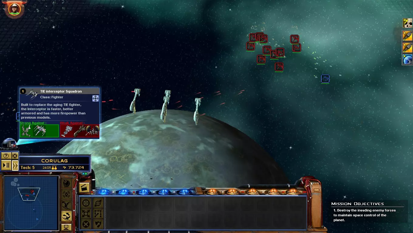 说明:叛军依靠星际战斗机的大规模突击来赢得太空战斗,如果你在战斗中没有战斗机,建议撤退。-用星际战斗机攻击敌方主力舰,它们在游戏初期效率更高。