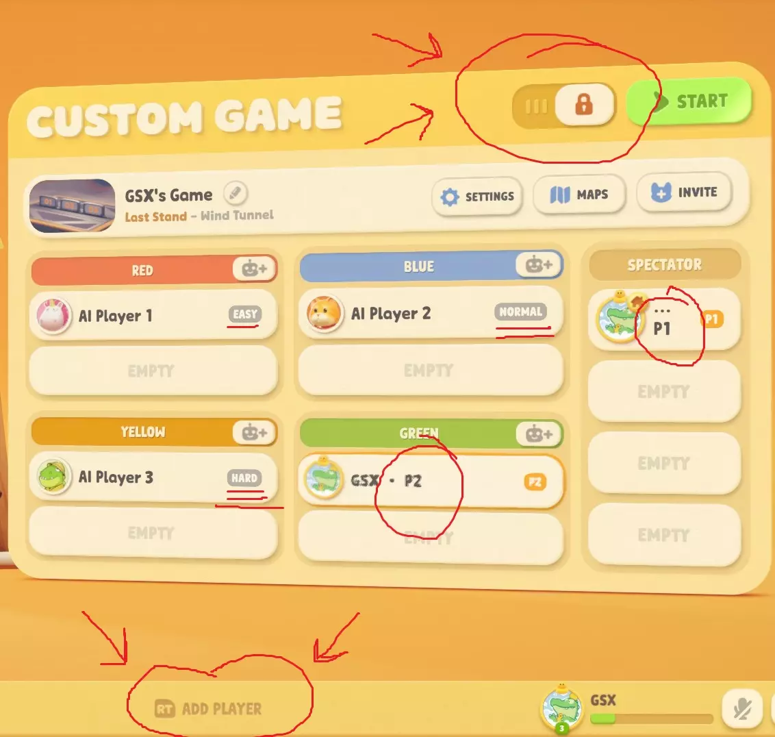 步骤1 - 进入【自定义游戏】 步骤2 - 选择顶部的【创建】 步骤3 - 选择你的模式和地图 步骤4 - 现在你将进入玩家槽位选择界面。 如果你不希望随机玩家加入,切换屏幕顶部的锁定按钮。数字无关紧要,除非你希望特定的在线好友加入。 按任意控制器上的右扳机键添加本地合作玩家。出于明显原因,不支持键盘合作。 点击空白槽位添加AI,然后再次点击该AI可修改其难度 结束。开发者本应在主菜单中添加离线合作模式,但我猜这太麻烦了。他们更专注于为一款儿童游戏加入微交易。 步骤1 进入【自定义游戏】