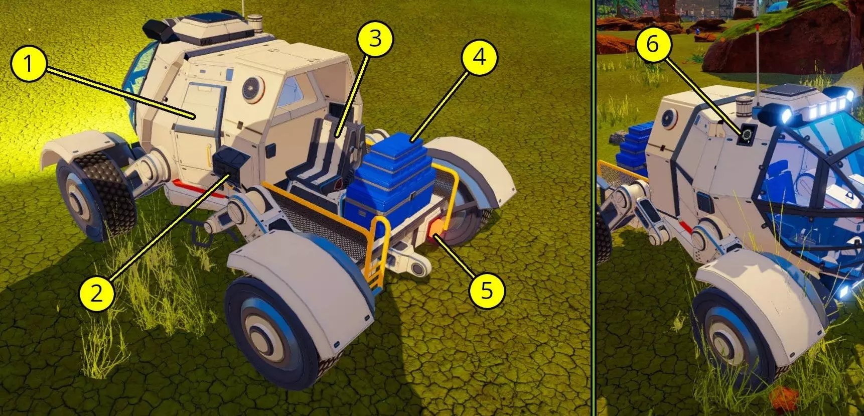 If it wasn't for the guide by techraptor[techraptor.net] I would not have found how to put upgrades on the vehicle Drone Priority setting The Priority setting: When delivering to Demanding inventories, drones will deliver to eligible containers with higher priority settings first, only delivering to lower-priority containers after the higher-priority containers are full. For example, if a Supply container contains Iron and there are two Iron-demanding containers, one with priority 5 and another with priority 3, drones will deliver to the priority 5 container (unless it is full, or about to be full from deliveries). The Priority setting does not affect Supplying containers. Equipment to Survive Let's go over what equipment can be used to help you get through the game. Backpacks Holds more goods - Tier 1 to Tier 6 Oxygen tanks More oxygen capacity - Tier 1 to Tier 4 Microchips Tools to help do stuff around the world: Construction - Allows you to construct buildings - No Tier Deconstruction - This lets you deconstruct buildings - Tier 1 to Tier 3 Torch - Used for exploring crashed ships - Tier 1 to Tier 3 Compass - Allows you to see what direction you are facing - No Tier Mining Speed - Speeds up the process of mining minerals from the floor - Tier 1 to Tier 4 Map - Grants you access to a map but needs a rocket sent into space - No Tier Blueprint Pinning - Allows you to pin blueprints to see what is needed to construct it - Tier 1 to Tier 3 Exoskeleton Holds more equipment - Tier 1 to Tier 3 Agility Boots Walk faster - Tier 1 to Tier 3 Jet Pack Fly and movement speed - Tier 1 to Tier 4 Water Filter You can drink from any water source - No Tier Air Filter Oxygen usage goes down slower - No Tier Ore + Coordinates SulfurCoordinates: 980:16:1427 (past the Iridium Cave) Alternative Entrances via Ice Caves: Iridium Cave and near Ship Wreck Ore Extractor gives about 4-7 Sulfur per full box Ore Extractor T2 gives about 8-16 Sulfur per full box Ore Extractor T3 Full Box Choose the Ore you want to source Alternatives to Sulfur Fields: * Handful in the Ice Caves: Ice Cave 1 Big Ship Wreck Coordinates: 390:142:979 Ice Cave 2 Spires Coordinates: 335:4:180 Ice Cave 3 Sand Falls Coordinates: 630:60:1813 Ice Cave 4 Dunes Coordinates: 1860:14:592 / Grand Rift Coordinates: 1940:2:433 Ice Cave 5 Desert Coordinates: 970:44:964 AluminumCoordinates: 920:29:320 Ore Extractor gives about 4-6 Aluminum per full box Ore Extractor T2 gives about 5-16 Aluminum per full box Ore Extractor T3 Full Box Choose the Ore you want to source Alternatives to Aluminium Field: * Small amount in the Iridium Cave (940:36:910), Sulfur Fields (980:16:1427), bottom of Maze area (1170:16:626) * Chests (mostly inside wrecks) * Very rare from meteor showers IridiumCoordinates: 940:36:910 Ore Extractor gives about 4-6 Iridium per full box Ore Extractor T2 gives about 5-16 Iridium per full box Ore Extractor T3 Full Box Choose the Ore you want to source Alternatives to Iridium Cave: * (Requires Launch Platform) Launching the Magnetic Field Protection ROCKET causes an meteor shower that spawns Iridium * (Requires the Ice to melt first) Handful in Spires Ice Cave (335:4:180) shortcut to the Uranium Cave (582:36:660) * Can be found in chests * Rare to deconstruct Heaters in wrecks UraniumCoordinates: 582:36:-660 (nearby chest hints at entrance) Ore Extractor NOTHING Ore Extractor T2 gives about 6 - 15 per full box Ore Extractor T3 Full Box Choose the Ore you want to source Alternatives to Uranium Cave: * (Requires Launch Platform) Launching the Asteroids Attraction ROCKET causes an meteor shower that spawns Uranium * Mostly found in chests inside wrecks Super AlloyCoordinates: 1050:64:1696 (N past the Iridium Cave, along the rock wall past the opening to Sulfur field) Ore Extractor NOTHING Ore Extractor T2 gives about 5-16 Super Alloy per full box Ore Extractor T3 Full Box Choose the Ore you want to source Alternatives to Super Alloy Cave: * Quite alot found on the ground ABOVE the maze area (1170:16:626) * Wall of sand past Sulfur fields (630:60:1813) * Sometimes found in chests mostly inside wrecks * Deconstruct the hidden Gold chests * Rare meteor showers OsmiumIce Cave 1 Big Ship Wreck (near Lake area) Coordinates: 390:142:979 Ice Cave 2 Spires Coordinates: 335:4:180 Ice Cave 3 Sand Falls Coordinates: 630:60:1813 Ice Cave 4 Dunes Coordinates: 1860:14:592 / Grand Rift Coordinates: 1940:2:433 Ice Cave 5 Desert (South of Stargate) Coordinates: 970:44:964 Ore Extractor NOTHING Ore Extractor T2 gives about 6 - 15 per full box Ore Extractor T3 Full Box Choose the Ore you want to source Alternatives to Ice Caves: * Rare meteor showers ZeoliteAppears more clearly at 600 MTI (can be hidden behind the root before reaching that Terra forming score). It's the same score as unlocking Pulsar Quartz which requires this resource. They are scattered around the map. Finite resource, doesn't re-spawn. Coordinates: 371:79:1288 Arch's Entry Coordinates: 340 : 158 : 1800 Meteor Crater Entry Coordinates: 10 : 188 : 1440 Ice Cave #2 Entry Coordinates: 385 : 80 : 1260 (47.5 µk (47,500 nK) (little jumping over required)) Ore Extractor NOTHING Ore Extractor T2 gives about 5-16 Zeolite per full box Ore Extractor T3 Full Box Choose the Ore you want to source Alternatives to Zeolite Cave: * Loose Zeolite scattered around the map * Found in crates Obsidian 1. Lava Biome Coordinates: -1045 : 165 : -270 Ore Extractor ???? Ore Extractor T2 gives about ???? Obsidian per full box Ore Extractor T3 Full Box Choose the Ore you want to source Alternatives to Lava Biome: * Crates you come across exploring * Pickups from the ground in the Lava Biome Pulsar Quartz (Pink) 1. Arches Coordinates: 10 : 147 : 1930 2. Left path Arches Coordinates: 130 : 165 : 2050 3. Meteor Crater Coordinates: -130 : 162 : 1710 4. Ice Cave Orange Desert Coordinates: 970 : 44 : -970 5. Rainbow Caves Coordinates: Ore Extractor ???? Ore Extractor T2 gives about ???? Pulsar Quartz per full box Ore Extractor T