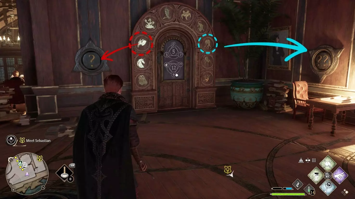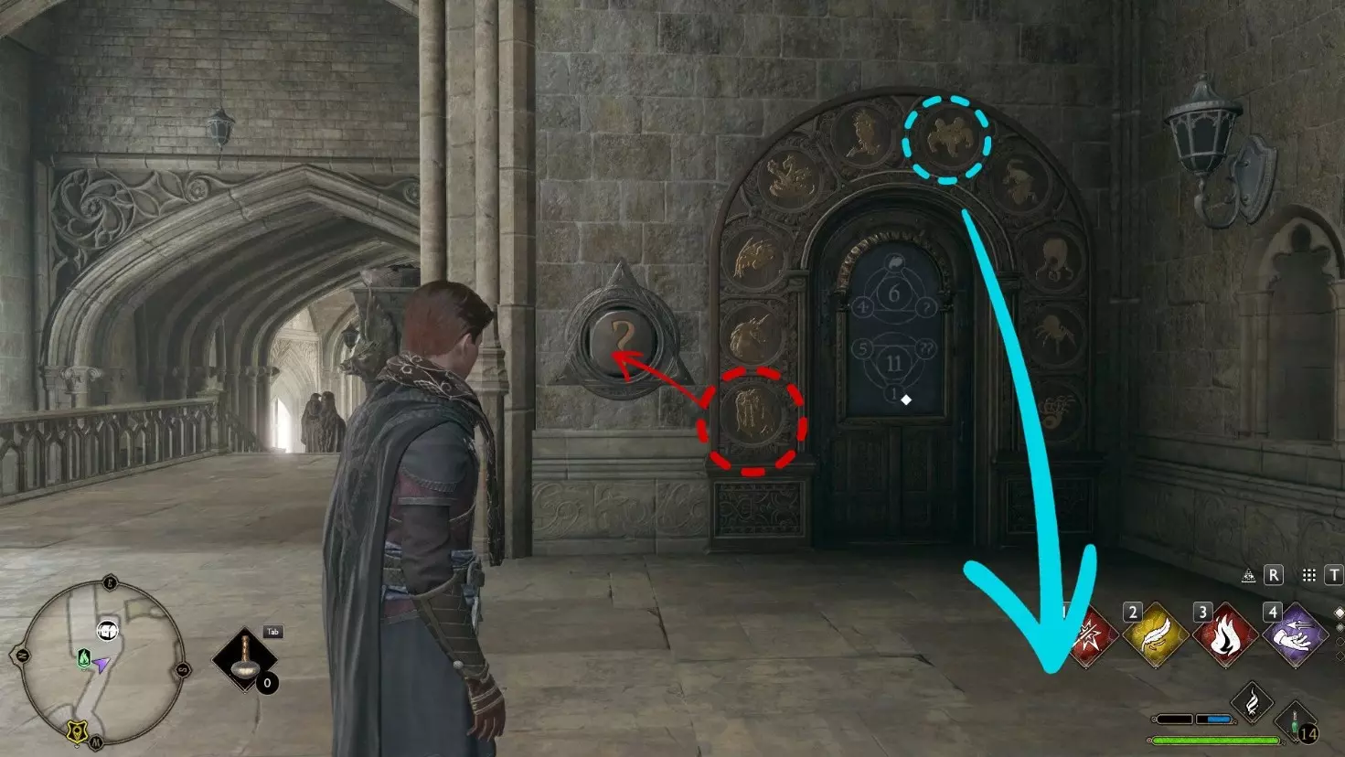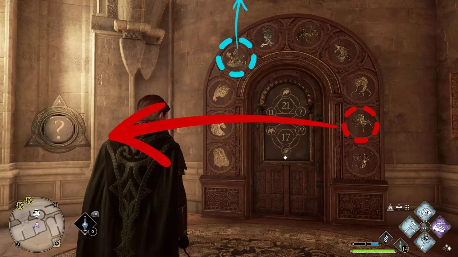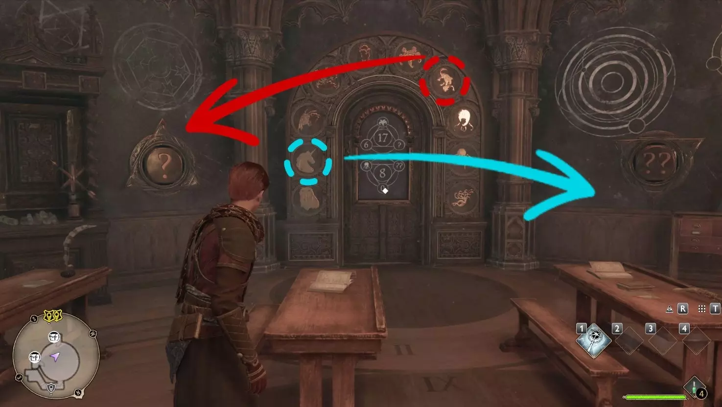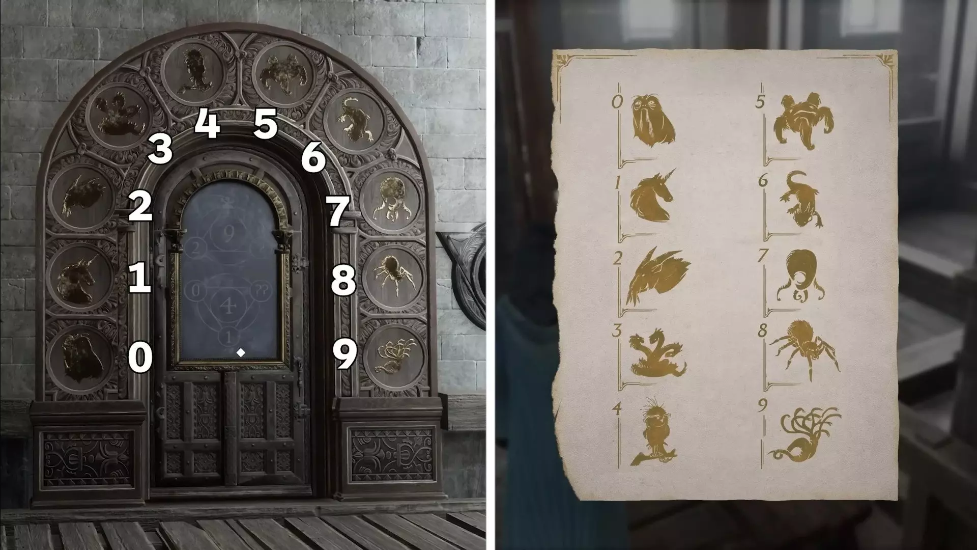 数字“0”——半兽人面具 数字“1”——独角兽 数字“2”——马形水怪 数字“3”——九头蛇 数字“4”——鸟蛇 数字“5”——五足怪 数字“6”——蛇怪 数字“7”——炸尾螺 数字“8”——八眼巨蛛 数字“9”——巨型鱿鱼 如何打开《霍格沃茨之遗》中的门 要打开这样的门,需要在谜题左右两侧的两个面板(左侧为【?】,右侧为【??】)上正确设置符号。你会看到两道数字谜题,它们是数学算式。中间的数字是周围三个数字的总和: 11 + 海妖(Кельпи) + ? = 21 海怪(Пятиног) + 巨型鱿鱼(Гиганский кальмар) + ??这是一些相当简单的方程:要找到问号下的数字,需要用中心数字减去两个已知数。但主要难点在于弄清楚哪些动物对应哪些数字。你可以通过上方的提示得知,或者通过逻辑推理得出:它们在门上按0到9的顺序排列。知道这一点后,就可以简化例题,然后解出答案并在面板上设置相应的数值。如果一切操作正确,门会自动打开。 位置 谜题 符号 数字学办公室