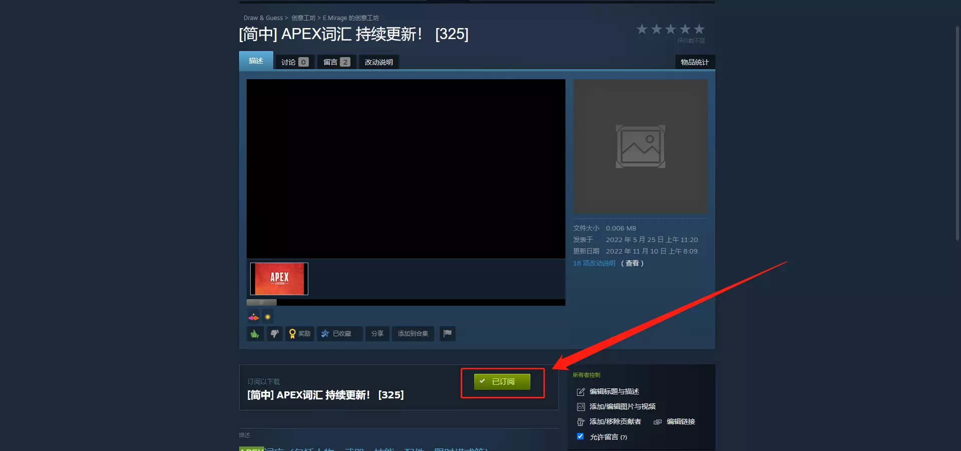 第二步 订阅一些你喜欢或你想玩的创意工坊。以我自己的创意工坊举例,很简单点一下就行,没啥教的必要。