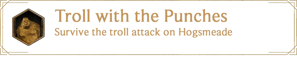 当你完成在霍格莫德的所有事务后,两只巨怪会袭击村庄。你将不得不与其中一只战斗。完成主线任务7:欢迎来到霍格莫德,以解锁成就。成就名称:The Auror’s Apprentice/The Gryffindor in the Graveyard/The Wise Owl/The Toast of the Town