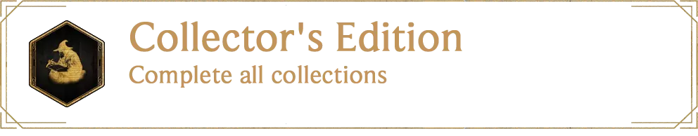 按Esc键打开进度菜单,在左下角选择【收集】板块。 在这里可以查看解锁该成就所需的所有收集品类型: 10个工具、69个敌人、89种外观、150张 Revelio 书页、13种野兽、75个特性、42个魔杖柄、140个召唤物、16种材料、13把扫帚 游戏中有超过一千个收集品。因此,我制作了额外的指南来展示如何获取解锁该成就所需的所有物品。查看该成就的特定板块以了解解锁方法。