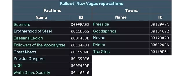 雪球 ID: 0015DB3D - 赌城大道 ID: 0015DB3C - 内利斯 ID: 0015DB3B - 试验场 ID: 0015DB3A - 清泉镇 ID: 0015DB39 - 胡佛水坝 ID: 0015DB38 - 查尔斯顿山 ID: 0015DB37 - 摩门堡