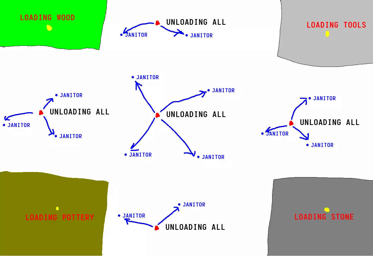 你为不同资源(木材、石材、陶器、工具)的大型生产中心设置了独立的装载站。所有5个卸载站都能接收每种资源(我省略了箭头,因为画出来会很混乱)。这样一来,所有消耗者(清洁工)都可以直接获取所需资源,无需走遍整个地图。 当你将卸载站建得更大,为清洁工集中导入所有物资、所有食物和家具到一个站点时,这种方式效果很好。所有人都可以直接从这里获取物资,不需要仓库,除非你想在这个位置储存更多数量的物资。需要注意的是,卸载站不像仓库那样有减少腐烂的效果,添加仓库并不会减少腐烂。卸货站会一直尝试被填满,并且上面总会有正在衰减的资源,所以只有在确实需要缓冲的情况下才添加一个。另一种情况可能是,当你需要将大量资源运输到很远的地方,达到每天数百甚至数千单位时——比如你需要将大量煤炭运输到冶炼和锻造区域。在游戏早期效率很低,但在人口达到约3000人后(如果操作得当,可能更早)会成为物流上的缓解。重要提示:使用车站时,确保它们从中获取资源的仓库是有范围限制的,否则可能会形成循环,即装载站从仓库获取资源,将其发送到卸货站,然后仓库派遣工人穿越半个地图去从卸货站获取资源。军队补给站 这是一种略有不同的后勤建筑,在游戏界面中属于不同类别,但运作规则与其他后勤建筑相同。其功能与仓库完全一致,但对所有玩家锁定,且会定期向全球地图上的己方军队输送资源。 如果需要运输食物、衣物、 armor、武器,这些资源可能存放在不同的仓库中——在这种情况下,最好建造多个专门用于一到两种资源的补给站,而非从整个地图调用资源。 零工 零工和没有可用工作量的受雇市民也会自动分配搬运任务。虽然不应依赖这一点,但如果发现无人值守的仓库被“神奇地”填满了,那就是他们的功劳。它们也会遵守仓库关于取货、范围等方面的规则。 常规工坊/市场 每个物流网络的最后一环都是消费者,而且现实情况是,消费者比较死板,不会听从安排。你无法缩小他们的活动范围,无法强制他们从特定仓库取货,也无法根据当前库存量来设置使用限制。 他们只会直接过来取货。如果距离很远,他们会浪费时间跑去取。如果村里最后一点谷物是用来开垦新田地的,他们也可能会拿去烤面包。你必须通过自己的物流系统来应对他们的这种“任性”行为。 幸运的是,对此还是有一些控制方法的。食品摊位和市场都可以设置为只获取特定资源: