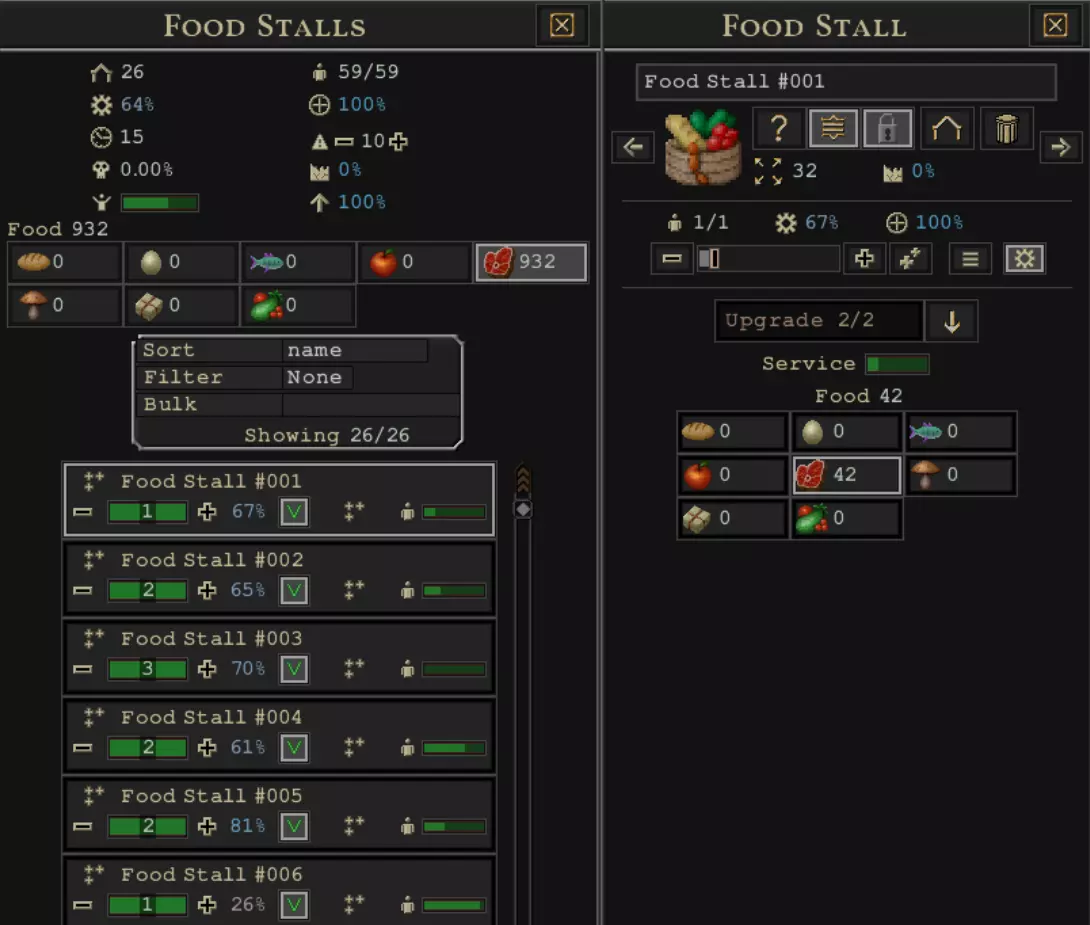 1. RadiusJust limits the range, from where workers are allowed to take resources from. 2. Automate employmentI recommend using it for all warehouses. The game measures current workload and adjusts employment on the fly. It's important to check on busy warehouses from time to time, you might notice that some warehouse automatically employs 50+ workers for example, which indicates a problem. Possibly some farms/workshops producing goods are too far away and fetching these resources is a huge strain. Or perhaps you have two hubs producing food that are far apart with their separate storage. In the first case, you should probably invest in another storage unit for a given resource. Both cases also call for reducing workers radius. Closer storage doesn't guarantee exclusivity, workers might try to fetch far away resources if not limited with radius. Another temporary reason might just be your manual order to cut down half the trees on the map, which will skyrocket wood storage employment, but this is probably what you want when you do it. 3. FetchFetch resources, enabled by default. Allows fetching from several sources: - items on the ground - workshop output storage - import depot - unloading station - hauler You likely want to have it enabled almost always in case of warehouses, unless when you set priority. 4. PrioritizeBy default warehouses are non-prioritized. Setting it to prioritize basically means "this warehouse can take resources from other (non-prioritized) warehouses". You may want it in the following example scenario: 1. You have woodcutters and dedicated wood storage. 2. In another place you have farms and dedicated grain storage. 3. In a third place you want to build a bakery hub, but this is a bit far from the first two. In this case, you build third warehouse, set its resources to wood, grain, possibly bread as an output good of bakeries too. Then you switch it to prioritize and warehouse workers will fetch input goods and collect output goods. Another scenario might be when your city becomes larger and uses wide variety of resources. For example your janitor now needs wood, stone, furniture, iron, tools and so on. Every single part is produced somewhere else. You can throw down a small warehouse with minimal storage for all these resources and set it to prioritize - now they will collect these resources from around the map and nearby janitors will go to them. Note: at some point this role should probably be replaced with loading stations. It can be a good idea to disable fetching when using it - if this is a far away warehouse where you want regular deliveries of wood for example. This will prevent a situation, where hauler goes through the entire map and instead of taking his full capacity of wood from warehouse, he will take just 2 units, because it just so happened, that 2 units were placed at nearby woodcutter output. 5. Auto-set pull sourceThis sets the pull source(6) automatically for up to 4 closest sources. I basically never use it, when I pull stuff I only do it myself. 6. Pull sourceFetch resource from another logistic hub. Normally you'd use it with fetch(3) off, when you want to pull only from a specific target - up to four of those at most per facility. When you click on the icon again after setting a target you can put a % limit for fetch. Setting this to 15% basically means: "fetch from storage X when it is at least 15% filled". You can use it with warehouses, for example when you only want to fetch wood for carpenters warehouse if at least 10% wood is available in main storage. This won't stop carpenters from trying to get it, but it will slow down the rate when supply is short. The main use case is for export depots though. When you sell stuff normally you put them next to a main warehouse for a specific good, set a limit and let it go. 7. Pullers(info-only)Shows the list of facilities that pull from this warehouse. 8. StoringLocks warehouse. Only manual prioritize(4) and pull source(6) from other facilities can take from it, nobody else is allowed to do it. I honestly never had a proper use case for it, but if you want it, it's possible. Warehouse The most basic and essential element in your logistics, used for storage of your resources and probably your default solution to most logistic problems. Use all the features discussed above for: storage, distribution to other parts of the city. Unique: resources in warehouse decay 2 times slower. Export depot Use for trade to sell. Disable fetch(3), disable prioritize(4). Use pull source(6) to set a trade, but remember to set a limit(by default it wants to export everything from target). Normally depots have global % limit for export, but this is problematic. Imagine the following scenario: 1. You have main tools warehouses with 5000 storage. 2. You have 5 distribution centers(for janitors or something) pulling tools from main warehouse, 500 storage each. 3. You set 20% global limit to export depot. What can(and eventually will) happen: since your total storage is 5000 + 5 * 500 = 7500, depot starts exporting at 1500. Three of your distribution centers get 500 tools each, two of them have none and any new production gets sold. In theory you can solve it by setting proper limit. Problem is - whenever you build a new warehouse fetching tools - the ratio shifts and might cause it to reappear. That is why it is important to set it to pull source and disable fetch(so it won't steal from the crafting facility directly). Import depot Use for trade to buy. Set resource, minimum price and it will come. It only accepts shipments that are dropped in its storage. It does not deliver resources anywhere, it has no workers. Other workers are responsible for collecting stuff from its storage and delivering it to their facility. Note: taxes from subjugated cities prioritize going to import depots. Hauler Functionally similar to a warehouse, but limited to a single resource and max 2 pull sources(6). It has 80 storage per empty squ