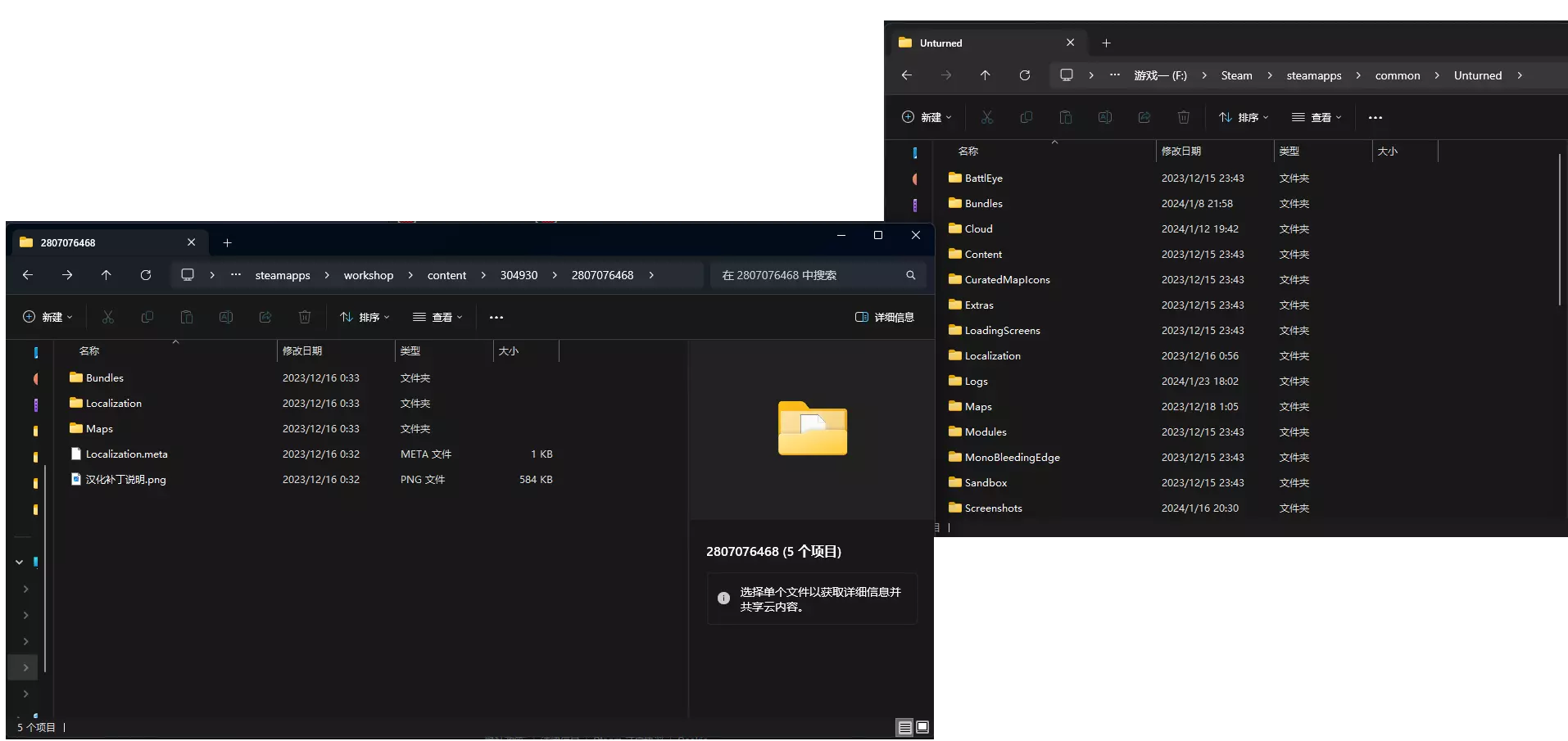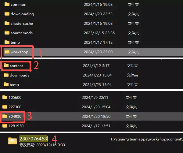 4. 进入创意工坊后,再进入content文件夹,找到【304930】文件夹并进入,然后找到2807076468文件夹。 mod较多时可使用搜索功能。