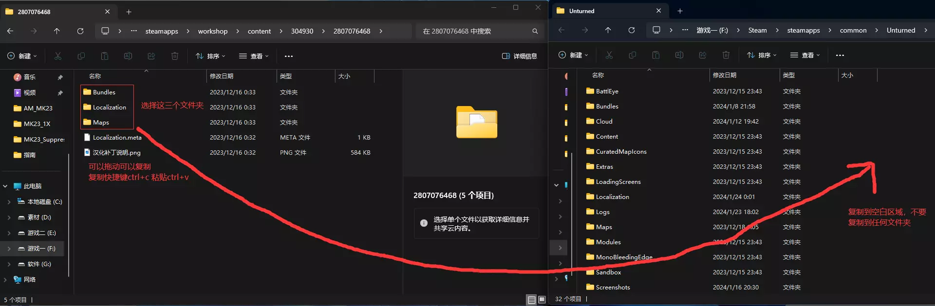 3. 复制汉化的所有文件夹,复制或拖动到游戏根目录(注意:不要拖动到游戏内的任何子文件夹中)。