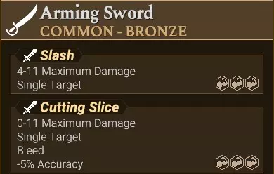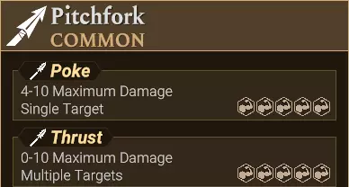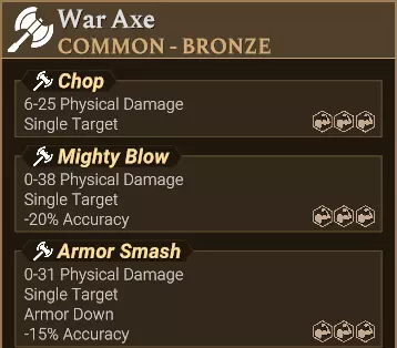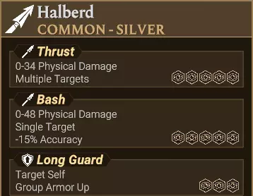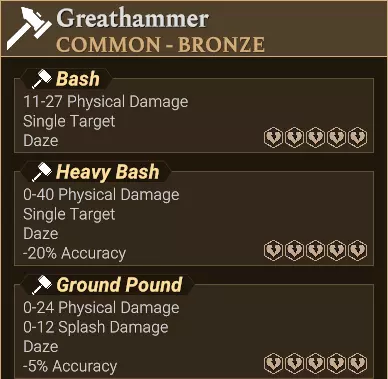 它影响一个2x1的纵列。 它对两个格子造成全额伤害。 它无视前排盾牌的格挡效果,并且仍对后排目标造成全额伤害。 它符合“Multiple Targets”的文本描述。 不过,横排攻击和横扫攻击也使用此文本描述。 它的攻击名称包含关键词“Column”“Penetrating”和“Thrust”。 横排 横排攻击显示为水平绿色双箭头。 不过,横扫攻击也使用相同的图标。