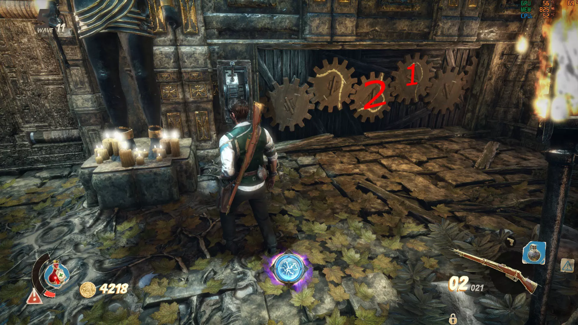 在二楼你会发现一扇需要花费5000金币的门。支付后,门后会出现通往杂草丛生的凉亭的楼梯。解决方法是多次拉动拉杆以获得花朵符号。