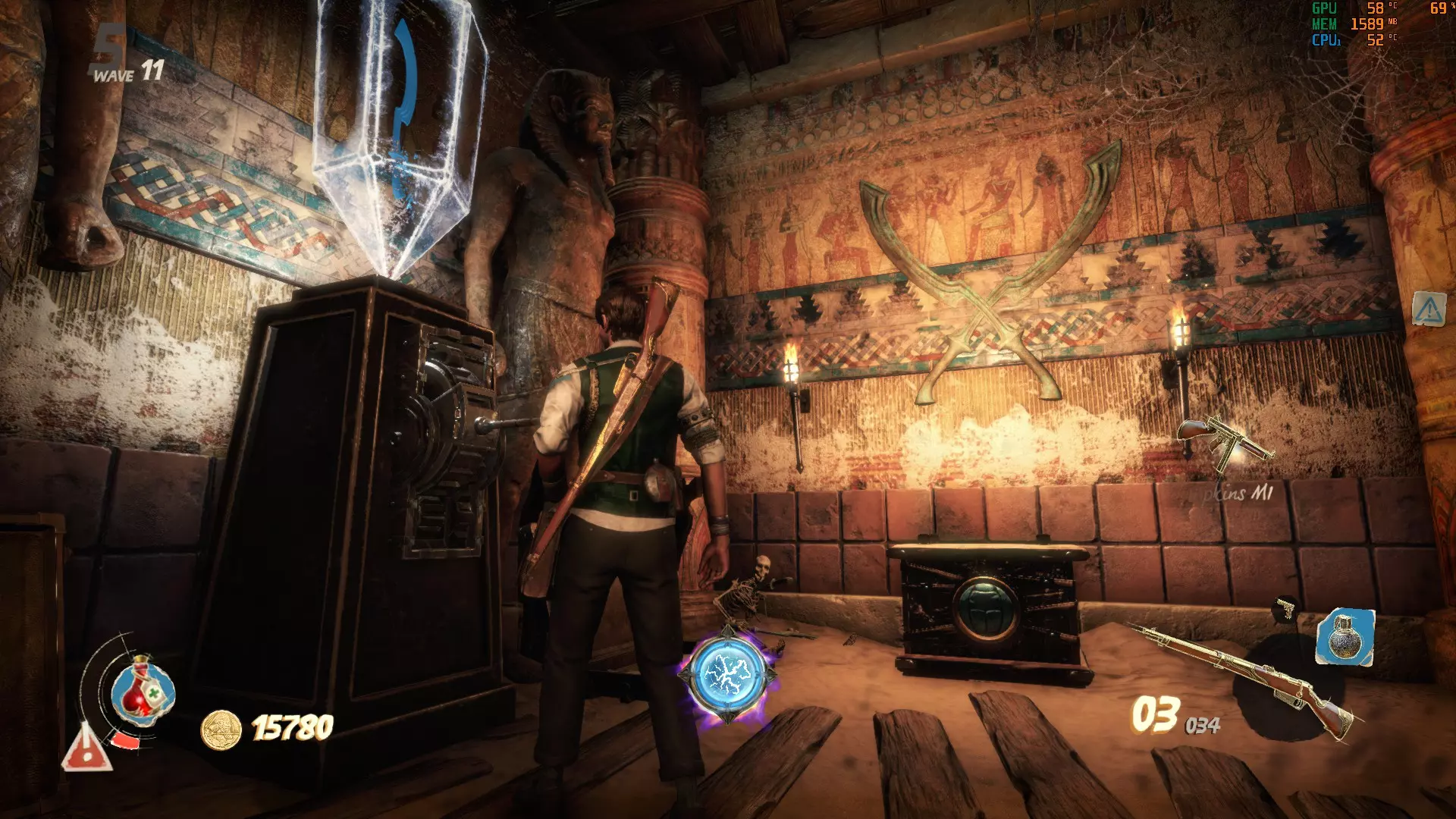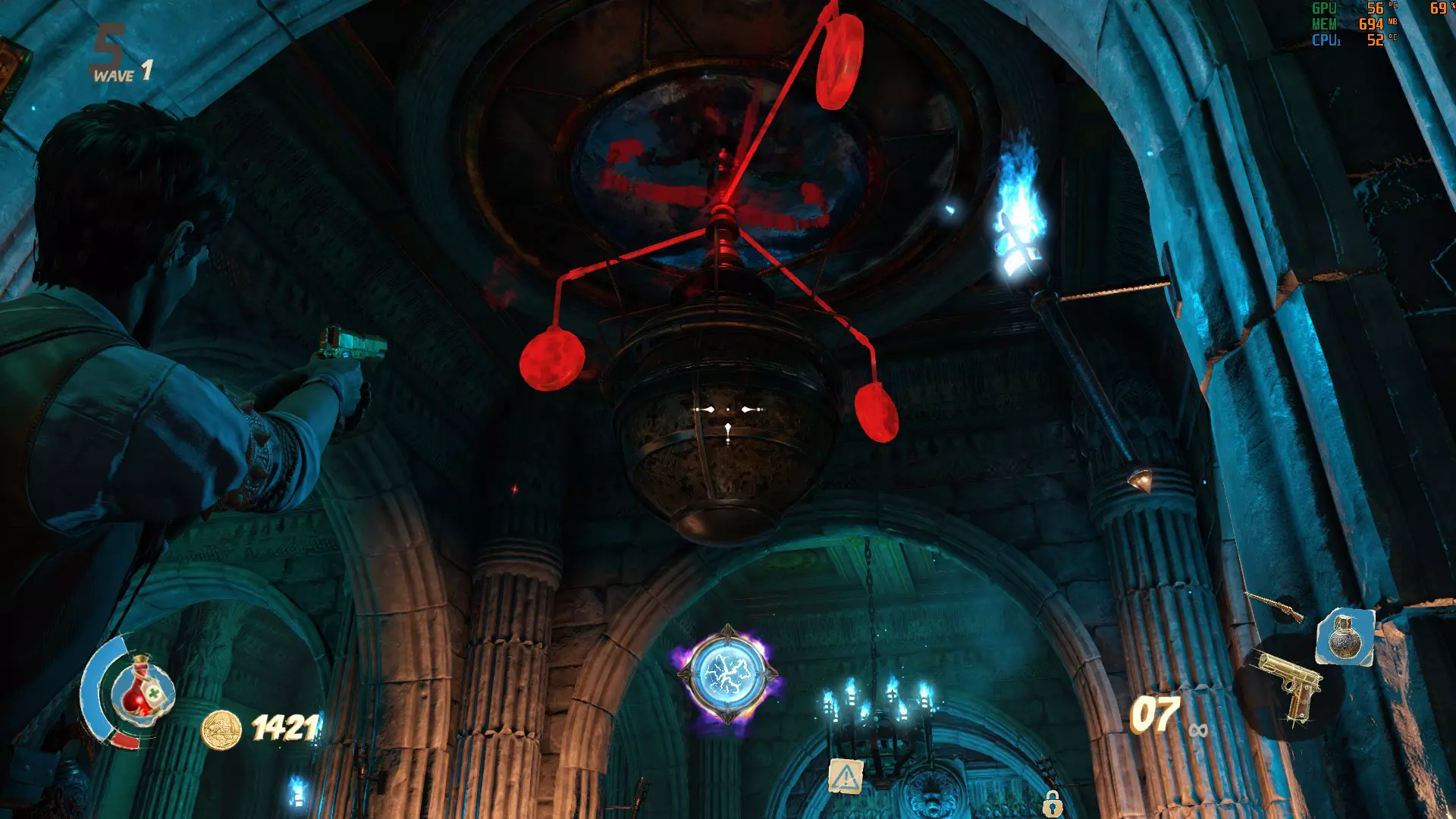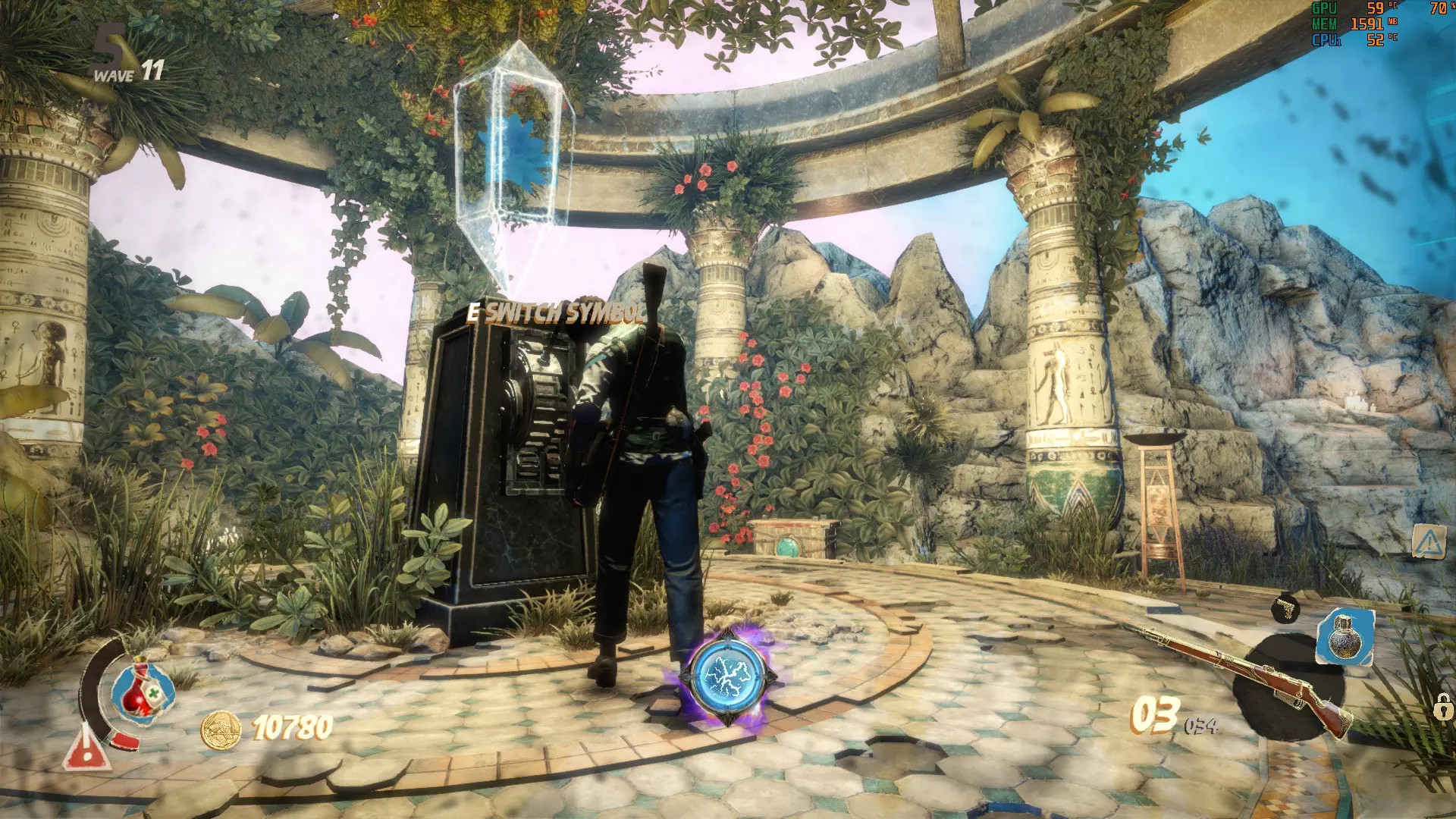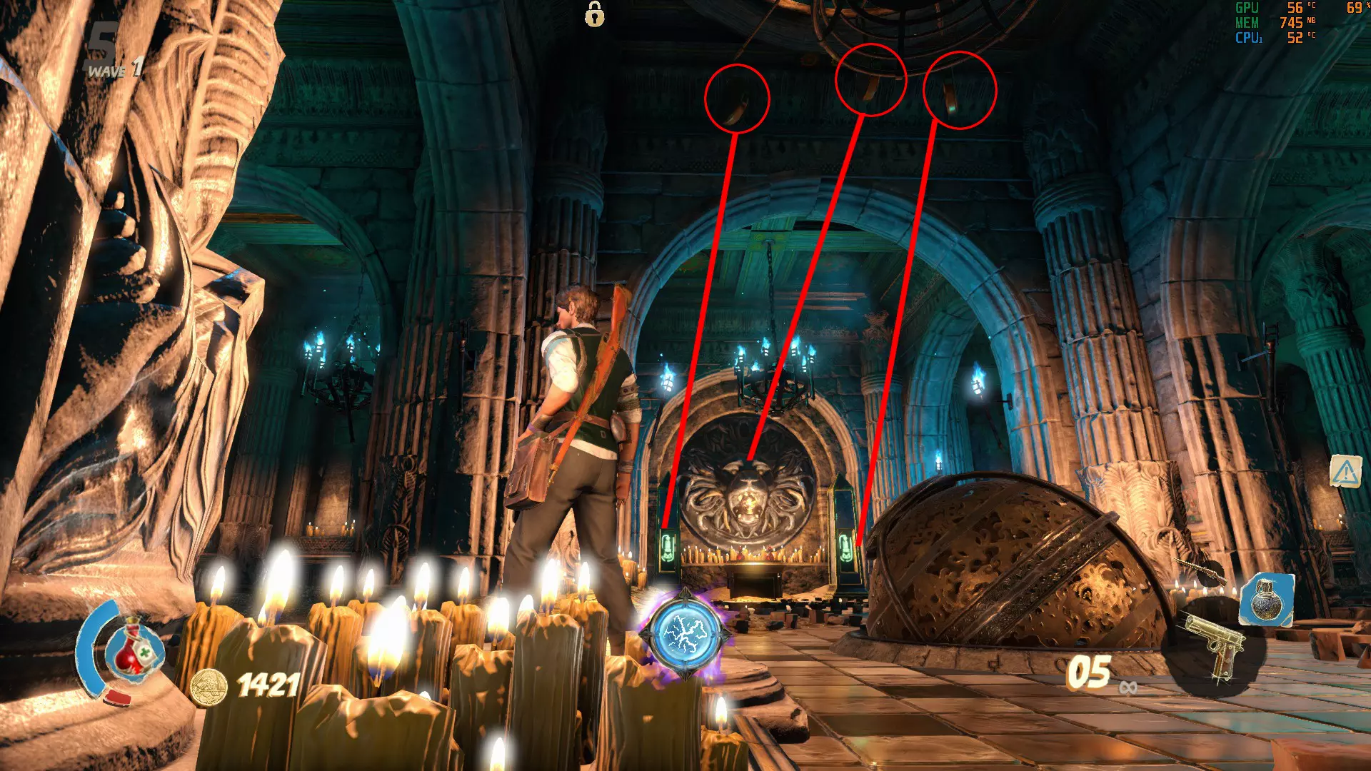 这里的门需要5000金币才能打开。沿着你左边的楼梯下去,就能找到最后一个按钮。记得拉动建筑物内的拉杆来打开后门,这样能更方便地解谜。现在所有门都已打开,你可以开始这场“马拉松”了。【建议只留下一个木乃伊,这样它就不会妨碍你】 我的个人路线: 选择哪条路线当然由你决定,但我发现这条路线最简单。我总是先激活起点的按钮,然后沿着小路跑到前面那栋有5000金币门的房子,激活那里的按钮,接着跑到下一栋房子,最后是河对岸的房子。如果谜题已解开,那扇10000金币的门(也在河对岸)会打开通往奖励的道路。否则会有一道石门挡住你获取奖励的道路。 宫殿 这张地图包含3个这样奇特的谜题,你需要通过射击悬浮在球体上方的3个物体来解开谜题,当你瞄准它们时,这些物体会发出红光。