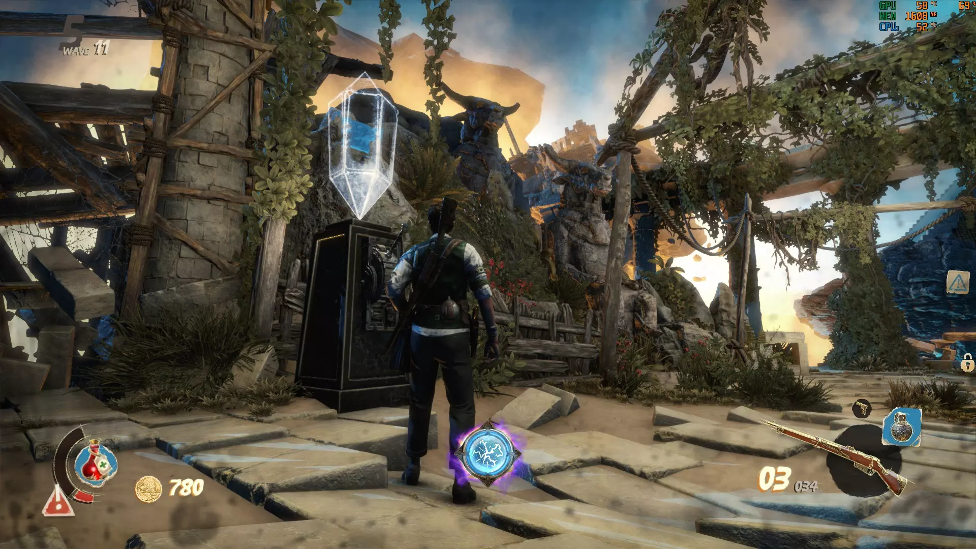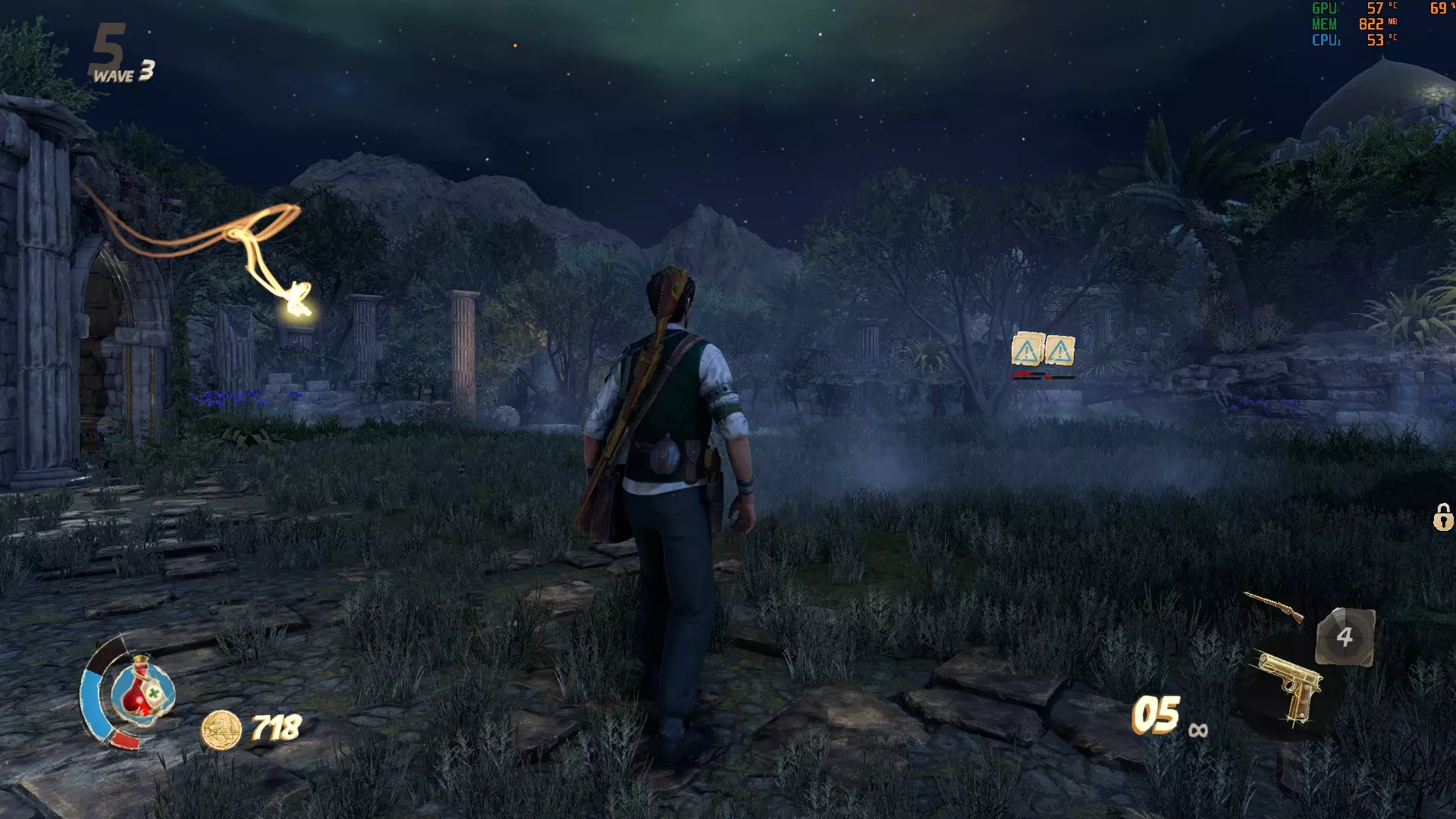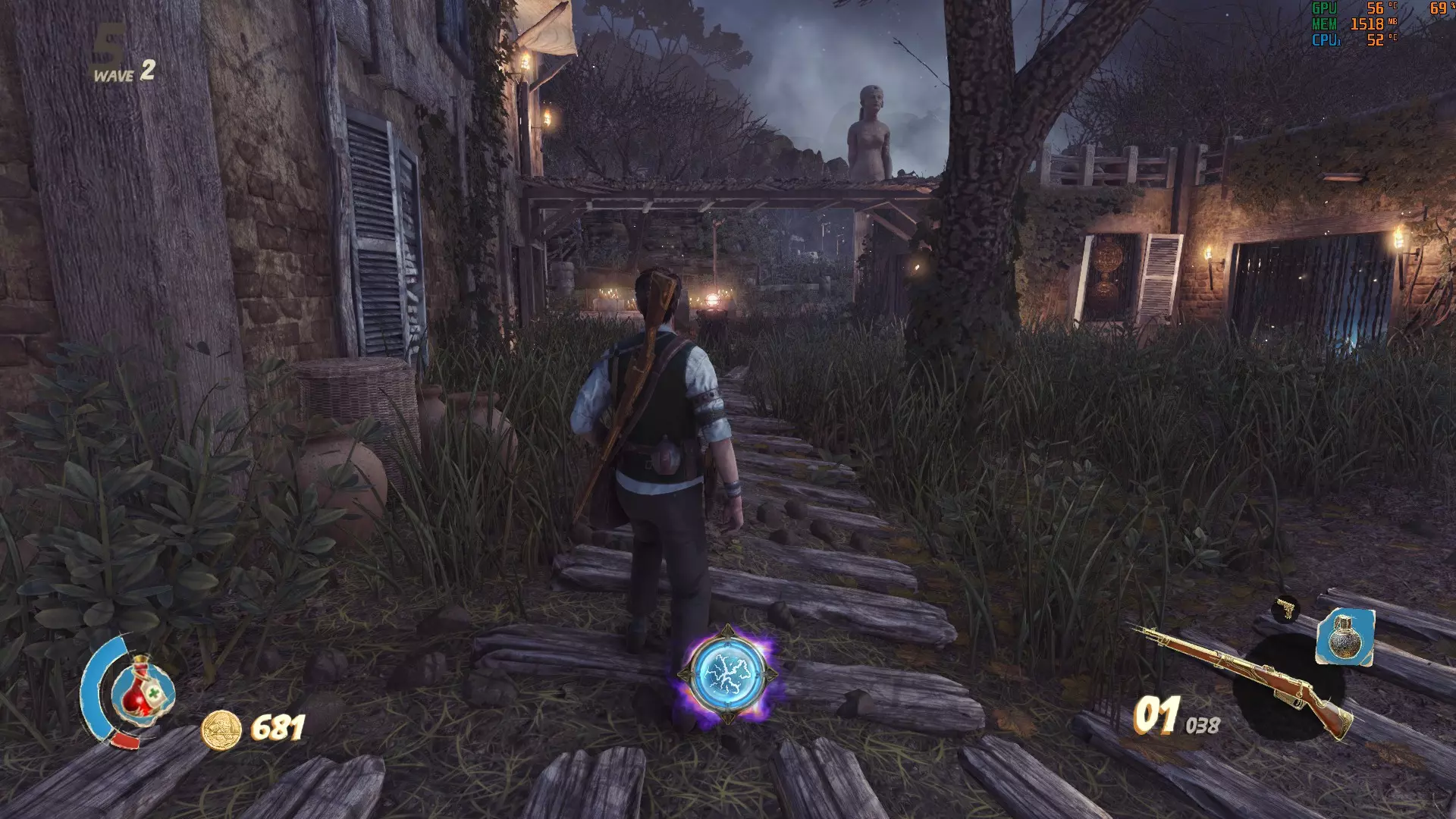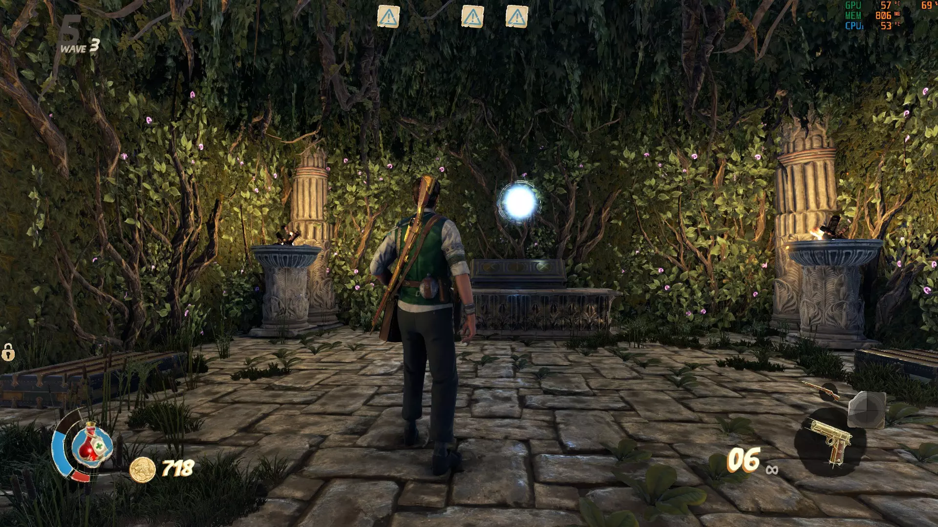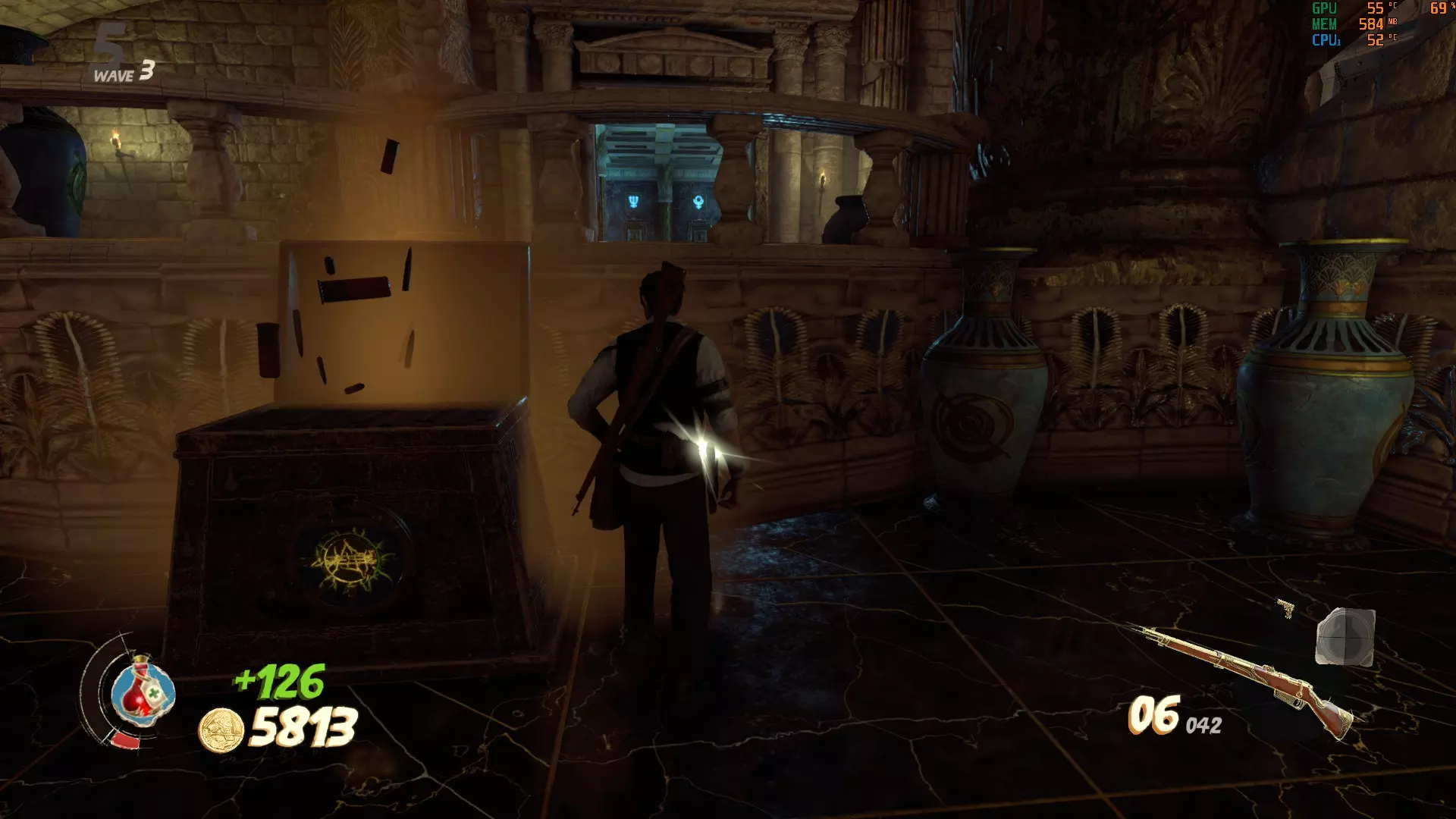 这里的门需要5000金币才能打开。沿着你左边的楼梯下去,就能找到最后一个按钮。记得拉动建筑物内的拉杆来打开后门,这样能更方便地解谜。现在所有门都已打开,你可以开始这场“马拉松”了。【建议只留下一个木乃伊,这样它就不会妨碍你】 我的个人路线: 选择哪条路线当然由你决定,但我发现这条路线最简单。我总是先激活起点的按钮,然后沿着小路跑到前面那栋有5000金币门的房子,激活那里的按钮,接着跑到下一栋房子,最后是河对岸的房子。如果谜题已解开,那扇10000金币的门(也在河对岸)会打开通往奖励的道路。否则会有一道石门挡住你获取奖励的道路。 宫殿 这张地图包含3个这样奇特的谜题,你需要通过射击悬浮在球体上方的3个物体来解开谜题,当你瞄准它们时,这些物体会发出红光。