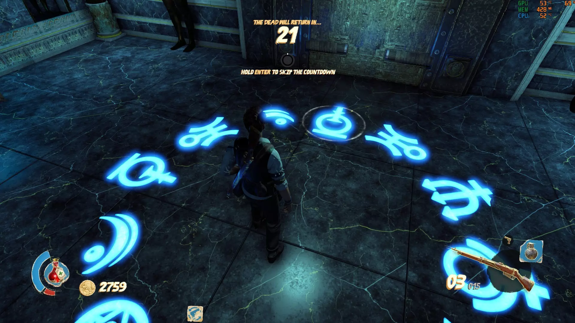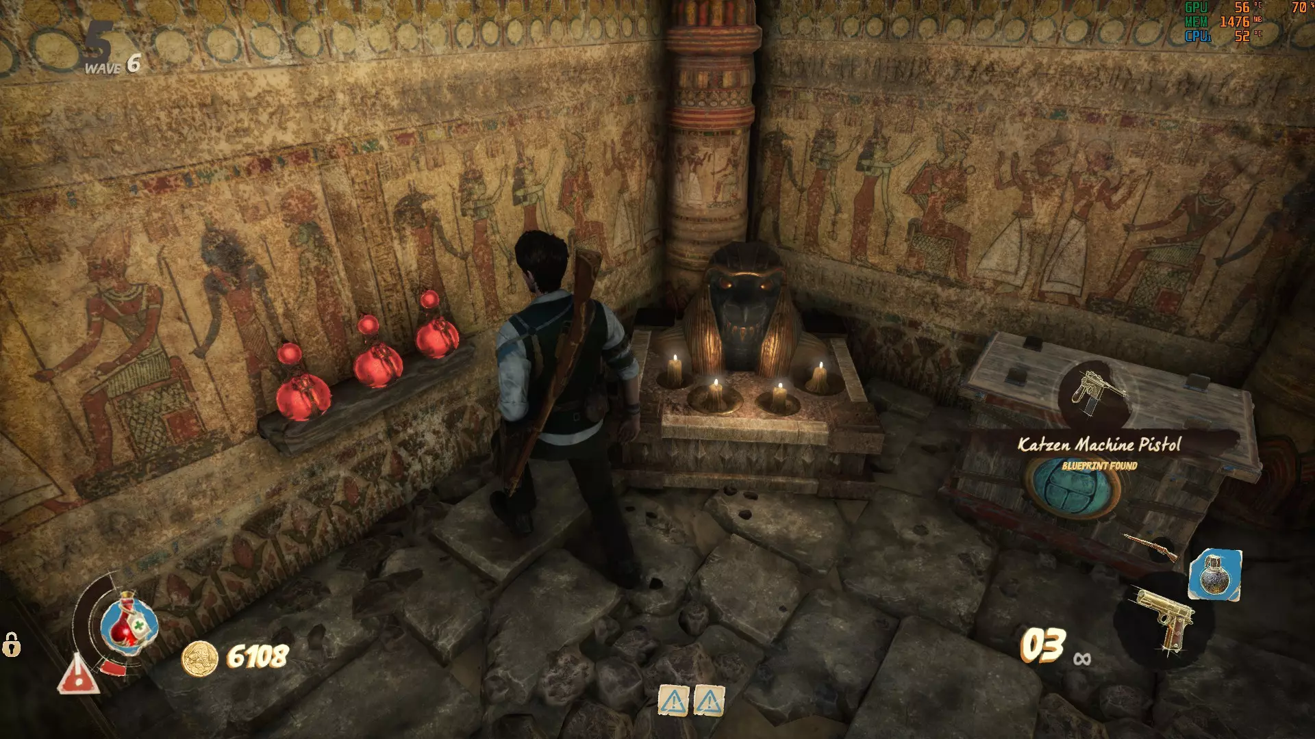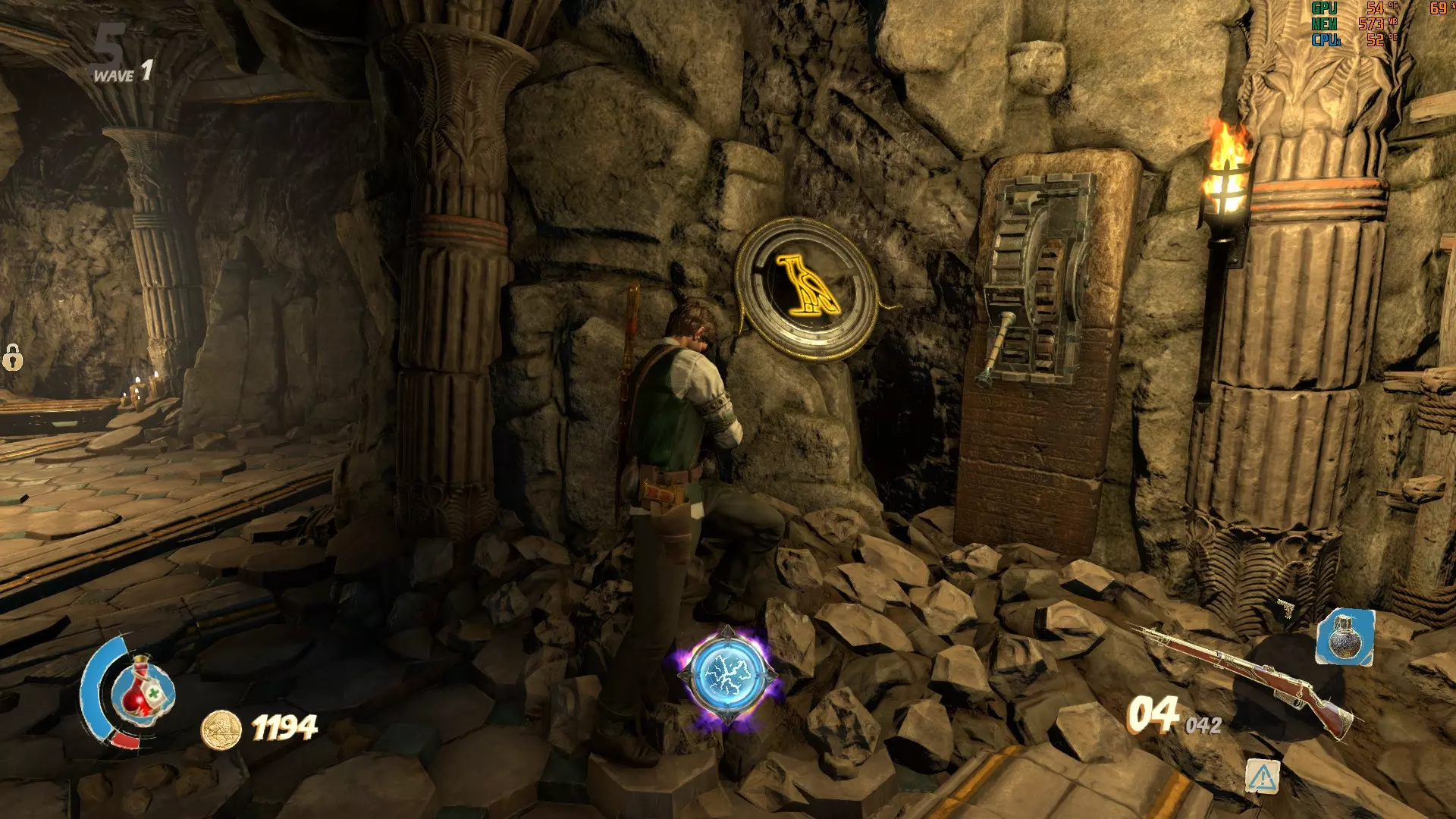 我的情况的解决办法是: 巴斯特:1根蜡烛 赛特:2根蜡烛 阿努比斯:3根蜡烛 荷鲁斯:4根蜡烛 简而言之:巴斯特、赛特、阿努比斯、荷鲁斯。 按正确顺序拉动拉杆后,你的奖励就会揭晓。 注意:每次开始地图时,半身像的谜题顺序都会不同。所以下一次游玩时,赛特可能会从1根蜡烛开始,以此类推。 密室 这个奇妙的密室中有一个包含炼金符号的谜题供你解决。每扇金色大门都会显示顶部带有符号的按钮。在密室中央起始位置左侧的长楼梯上方,有一个需要花费10000金币才能进入的房间,里面会显示谜题的答案。一个符号被圆圈圈住。你需要在其中一个房间里激活显示相同符号的按钮。完成后,圆圈会跳转到另一个符号(回到万号房间),以便你激活它所在房间的按钮。