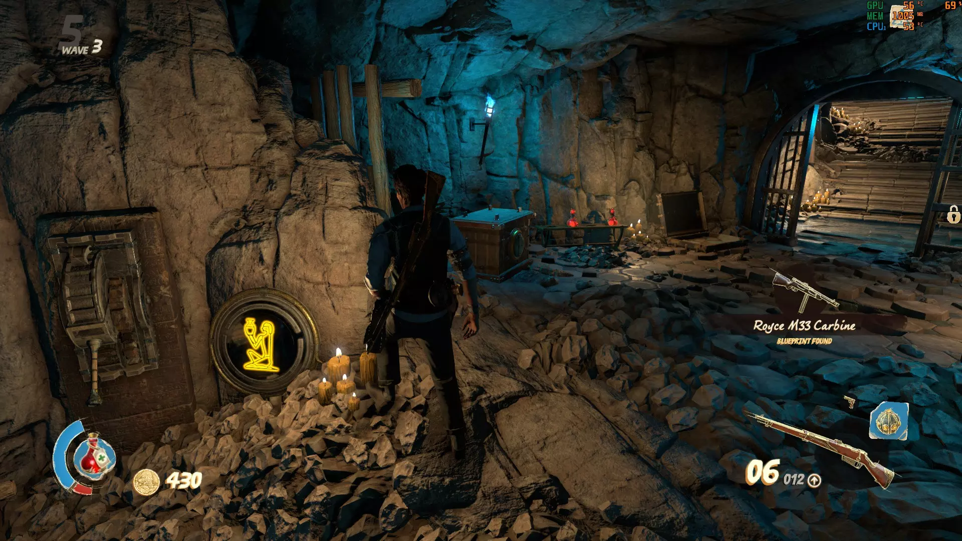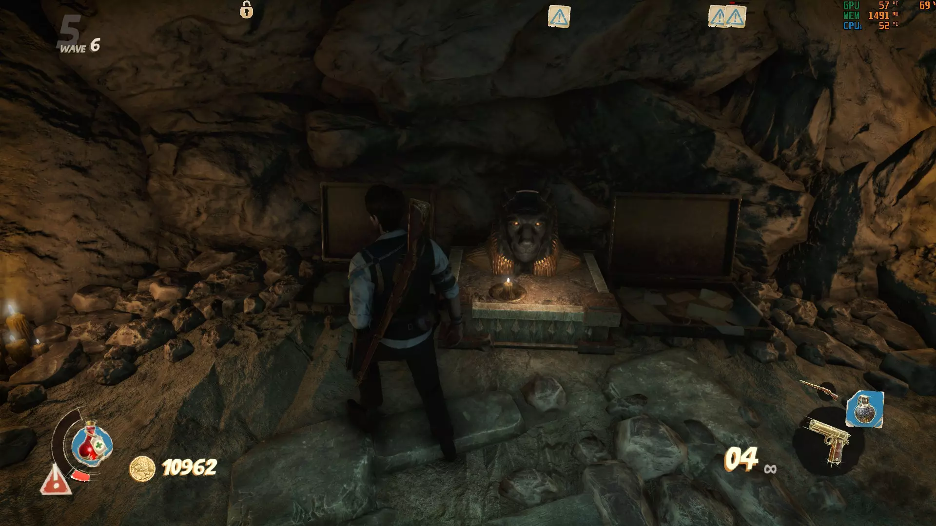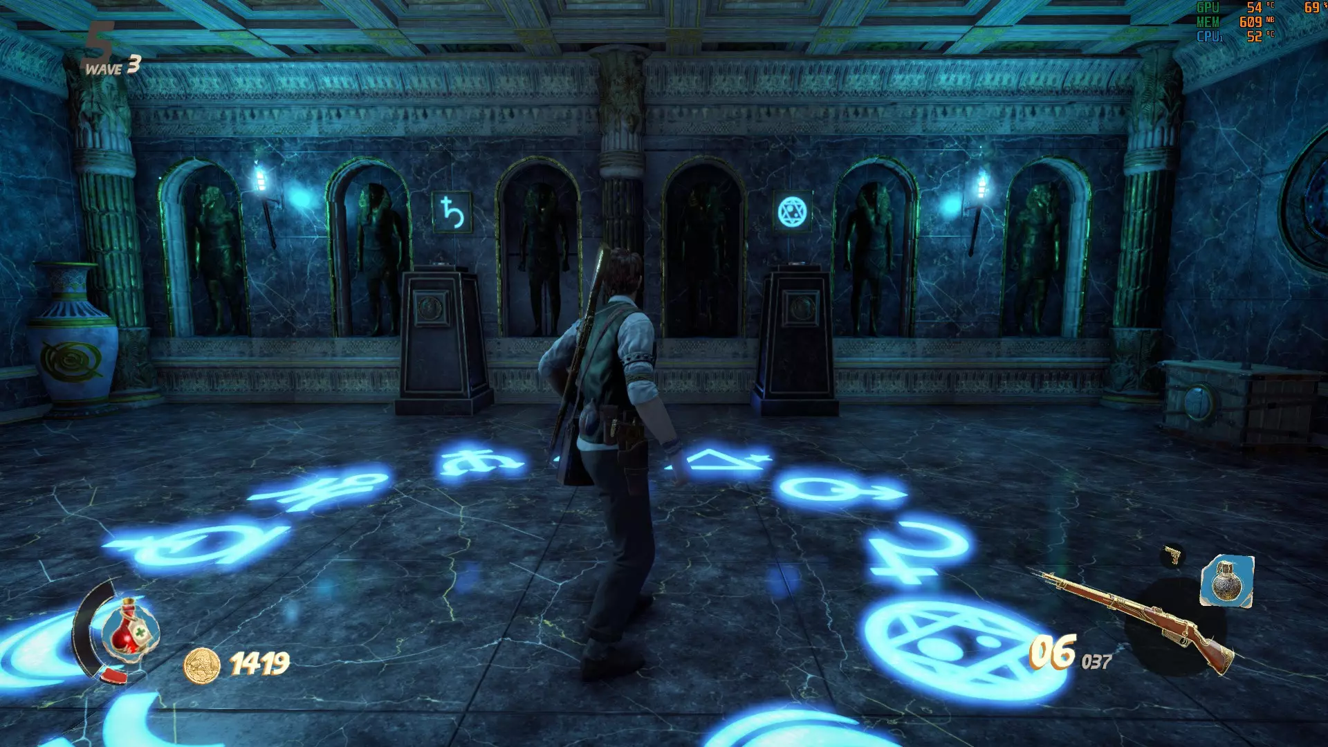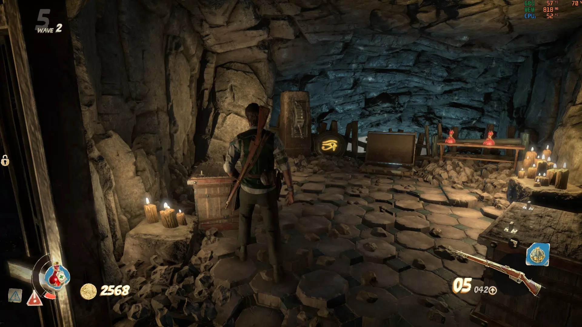 我的情况的解决办法是: 巴斯特:1根蜡烛 赛特:2根蜡烛 阿努比斯:3根蜡烛 荷鲁斯:4根蜡烛 简而言之:巴斯特、赛特、阿努比斯、荷鲁斯。 按正确顺序拉动拉杆后,你的奖励就会揭晓。 注意:每次开始地图时,半身像的谜题顺序都会不同。所以下一次游玩时,赛特可能会从1根蜡烛开始,以此类推。 密室 这个奇妙的密室中有一个包含炼金符号的谜题供你解决。每扇金色大门都会显示顶部带有符号的按钮。在密室中央起始位置左侧的长楼梯上方,有一个需要花费10000金币才能进入的房间,里面会显示谜题的答案。一个符号被圆圈圈住。你需要在其中一个房间里激活显示相同符号的按钮。完成后,圆圈会跳转到另一个符号(回到万号房间),以便你激活它所在房间的按钮。