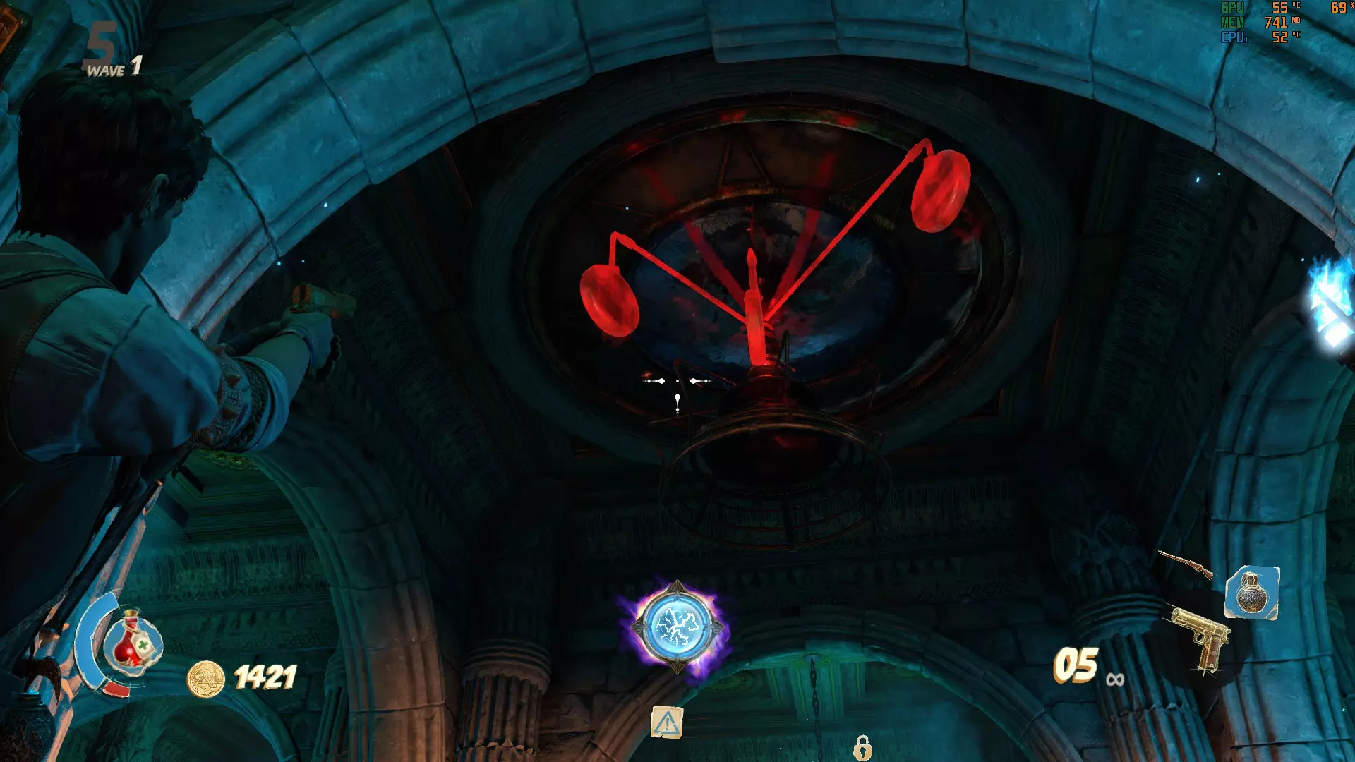另一个在二楼的5000金币门后面,从起始区域的楼梯向上走向桥梁,俯瞰宫殿的其他部分,门会在你的左侧。只需对每个球体重复相同的解谜方法。最后一个在起始区域被水淹没的楼梯上方,向左走,穿过2500金币门。上楼后你会在一个圆形房间里看到4座巴斯特雕像,然后左转,下另一组楼梯走向尖刺门,你的右侧就是7500金币门,最后一块 puzzle 碎片就在那里。包含奖励的10000金币房间位于二楼7500金币门后面的房间里。 虚无 最后一个谜题可能是所有谜题中最难以捉摸的。大金字塔里有你的奖励,但你的道路被挡住了。这里的谜题需要拉动杠杆来改变每扇金色门后的符号,使其与周围环境相匹配。你开始所在的一楼有2500号门,房间的墙上挂着埃及风格的剑。解决方法是多次拉动杠杆,直到门后出现与墙上剑相匹配的符号。
