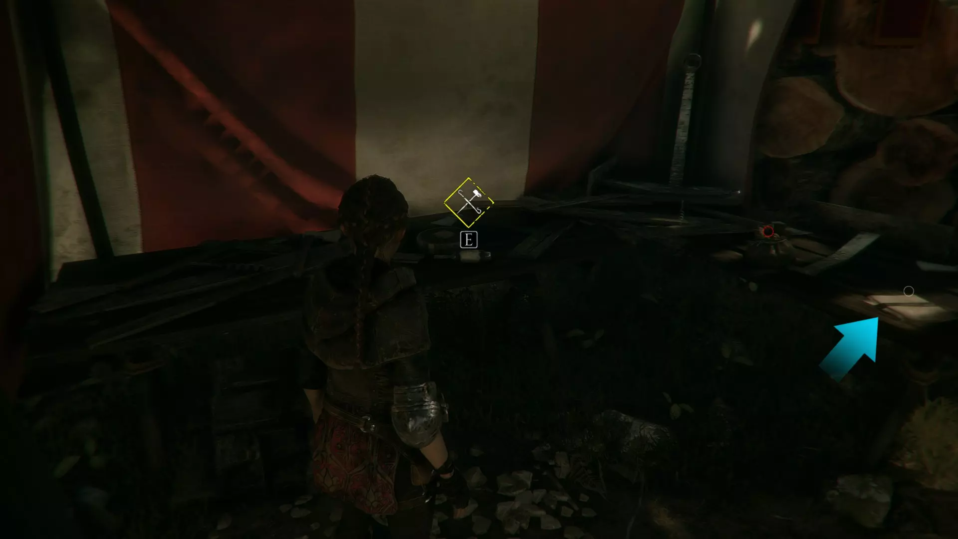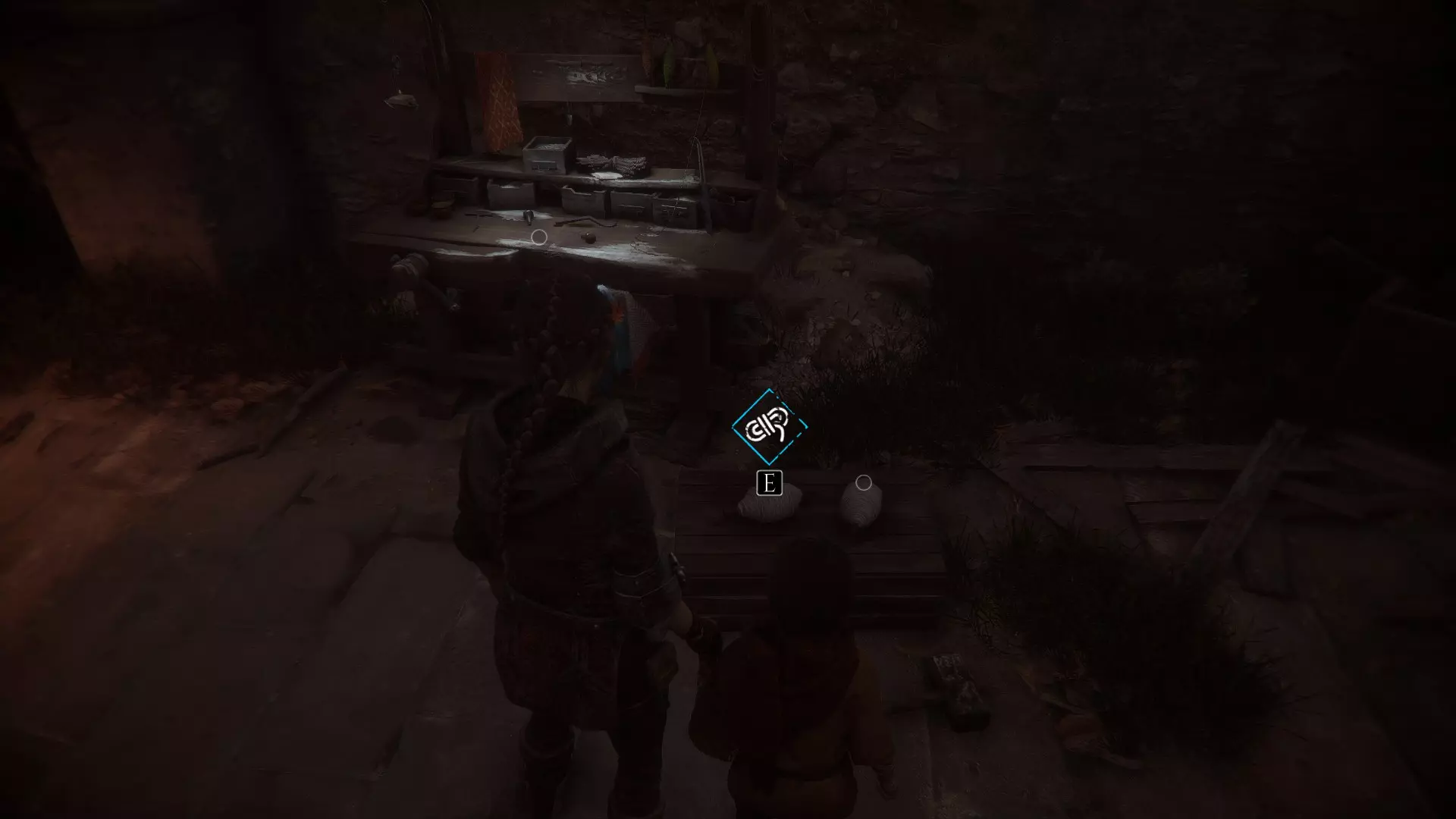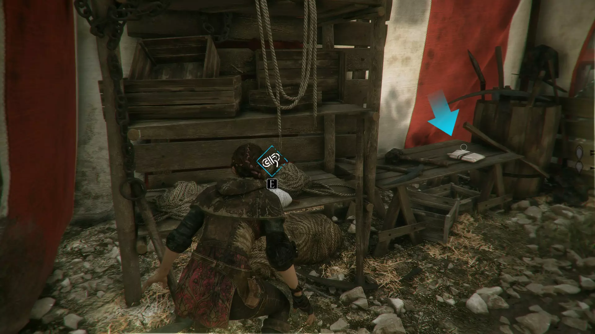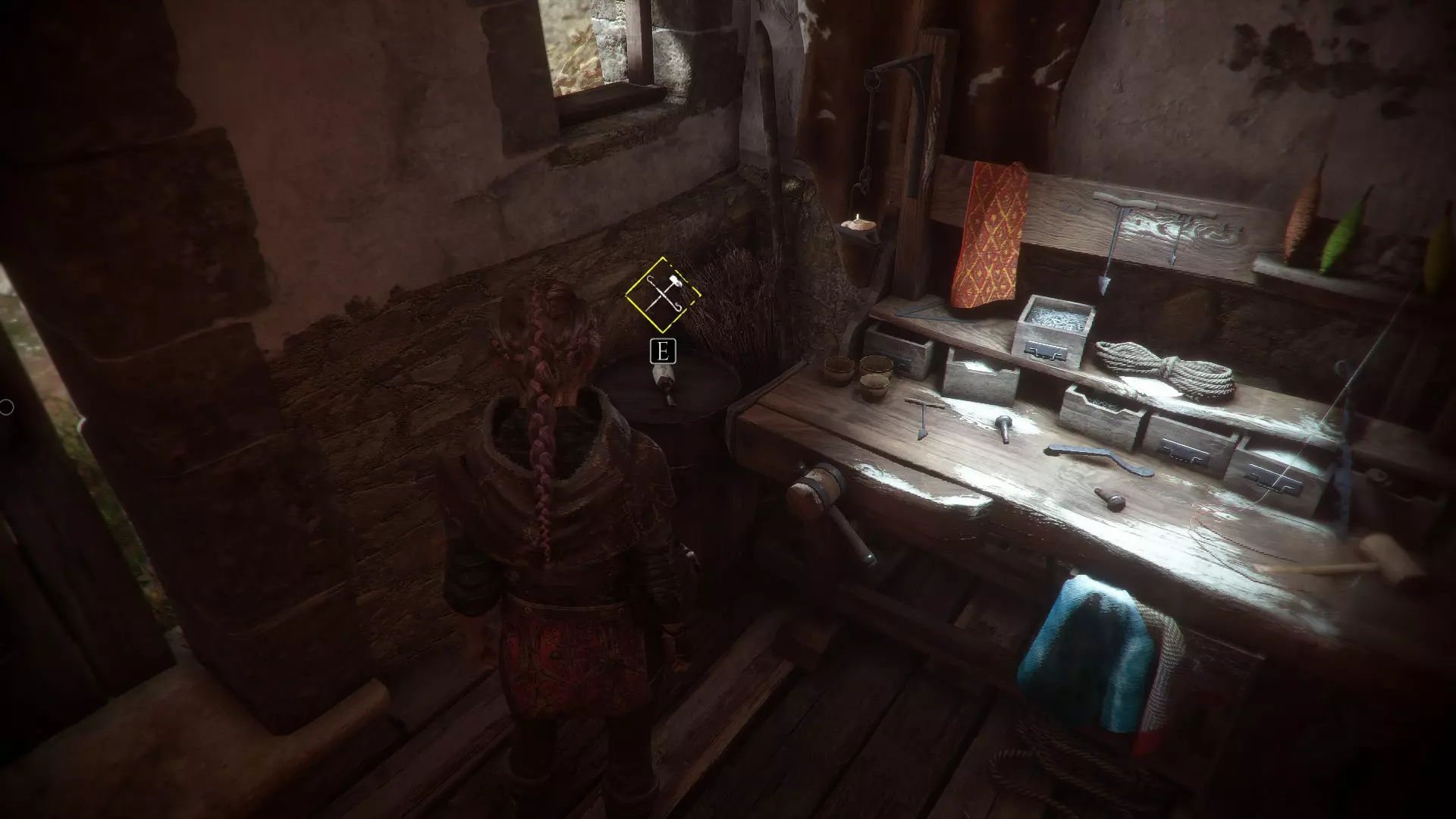 工作台在室外,向右走下楼梯可以找到工具和布料。绳索位于工作台前方墙壁的左侧。