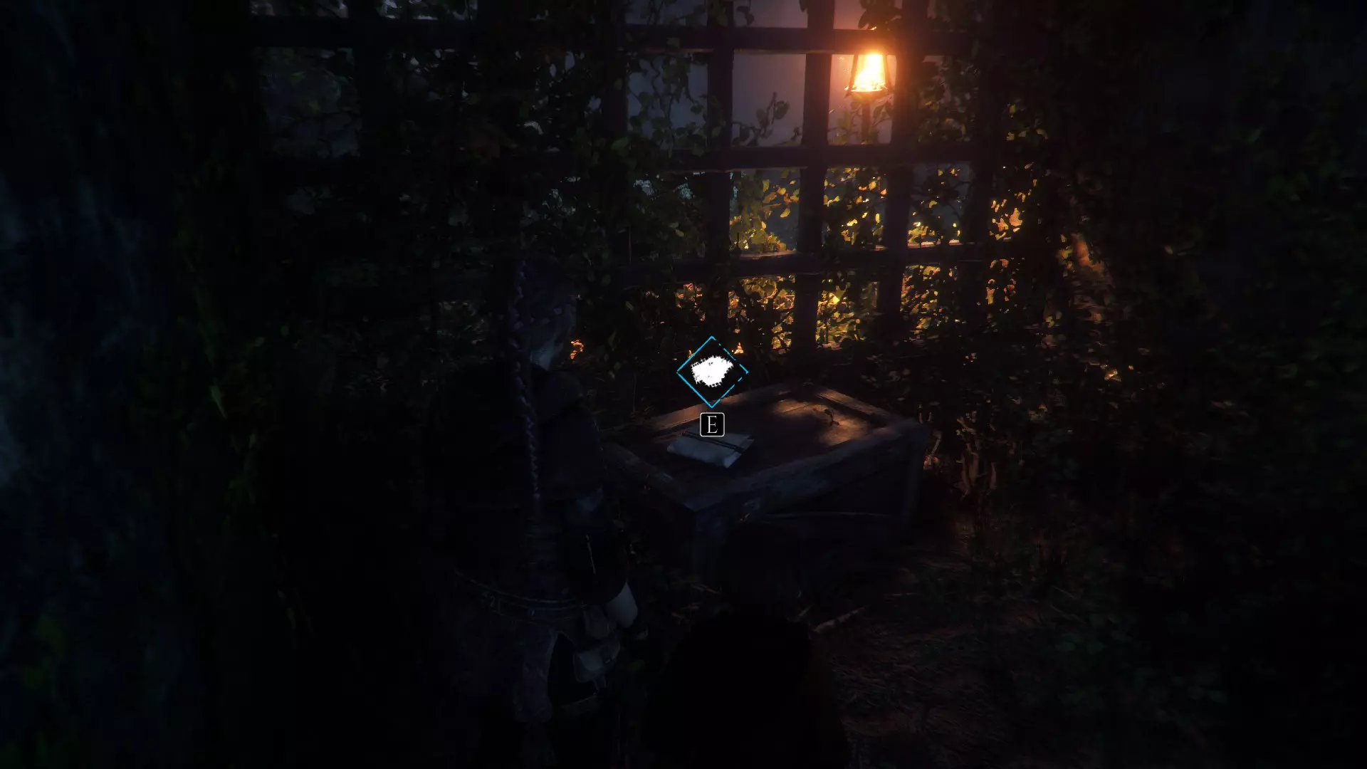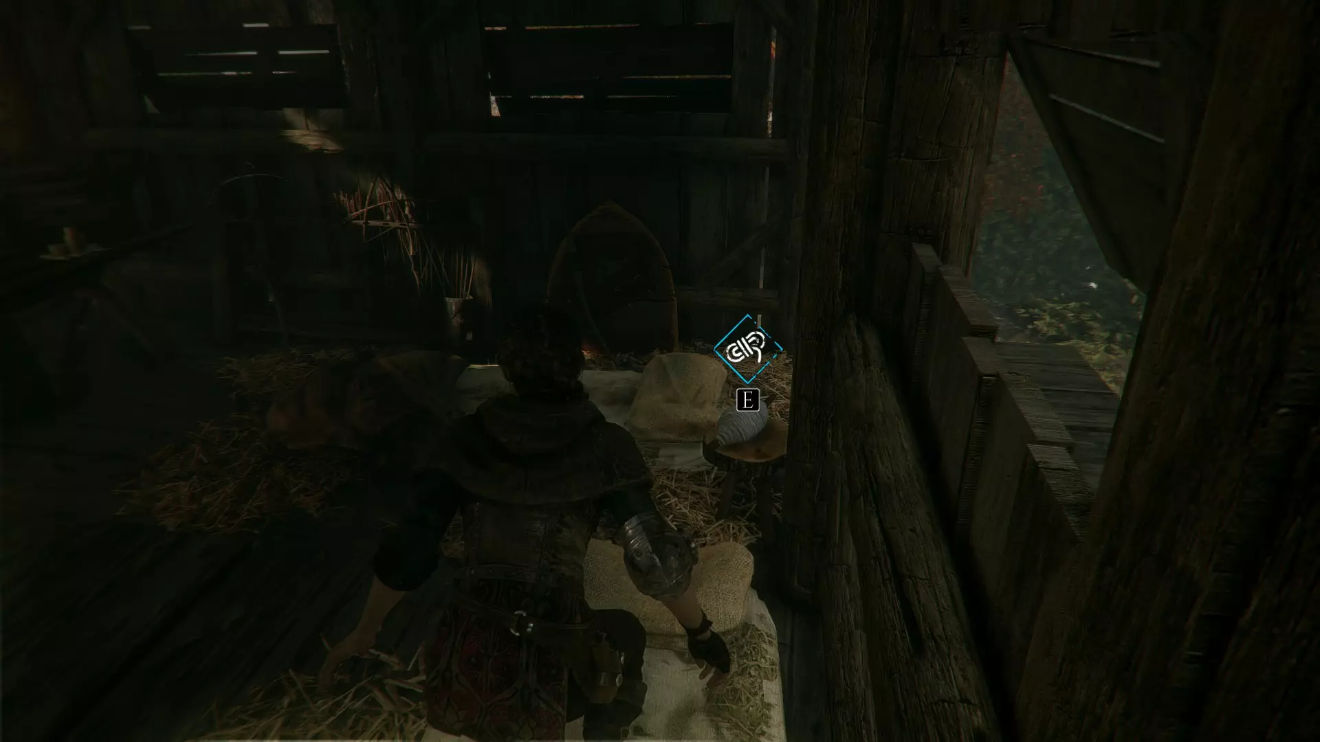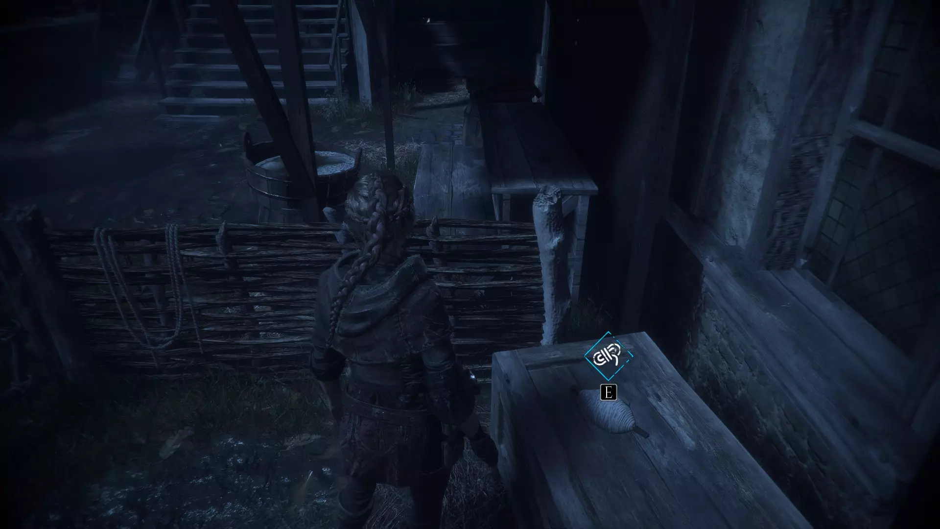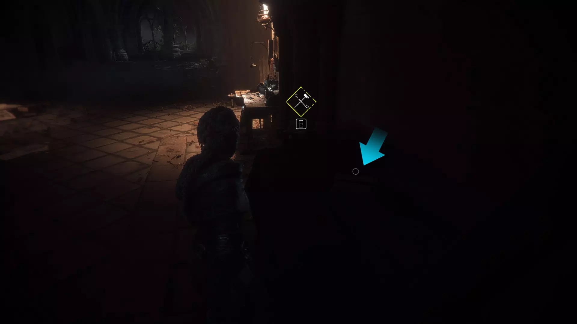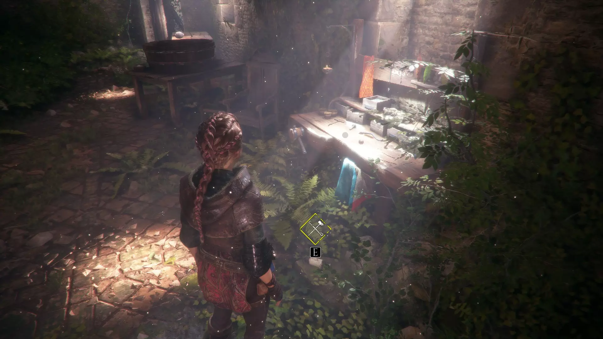 工作台在室外,向右走下楼梯可以找到工具和布料。绳索位于工作台前方墙壁的左侧。