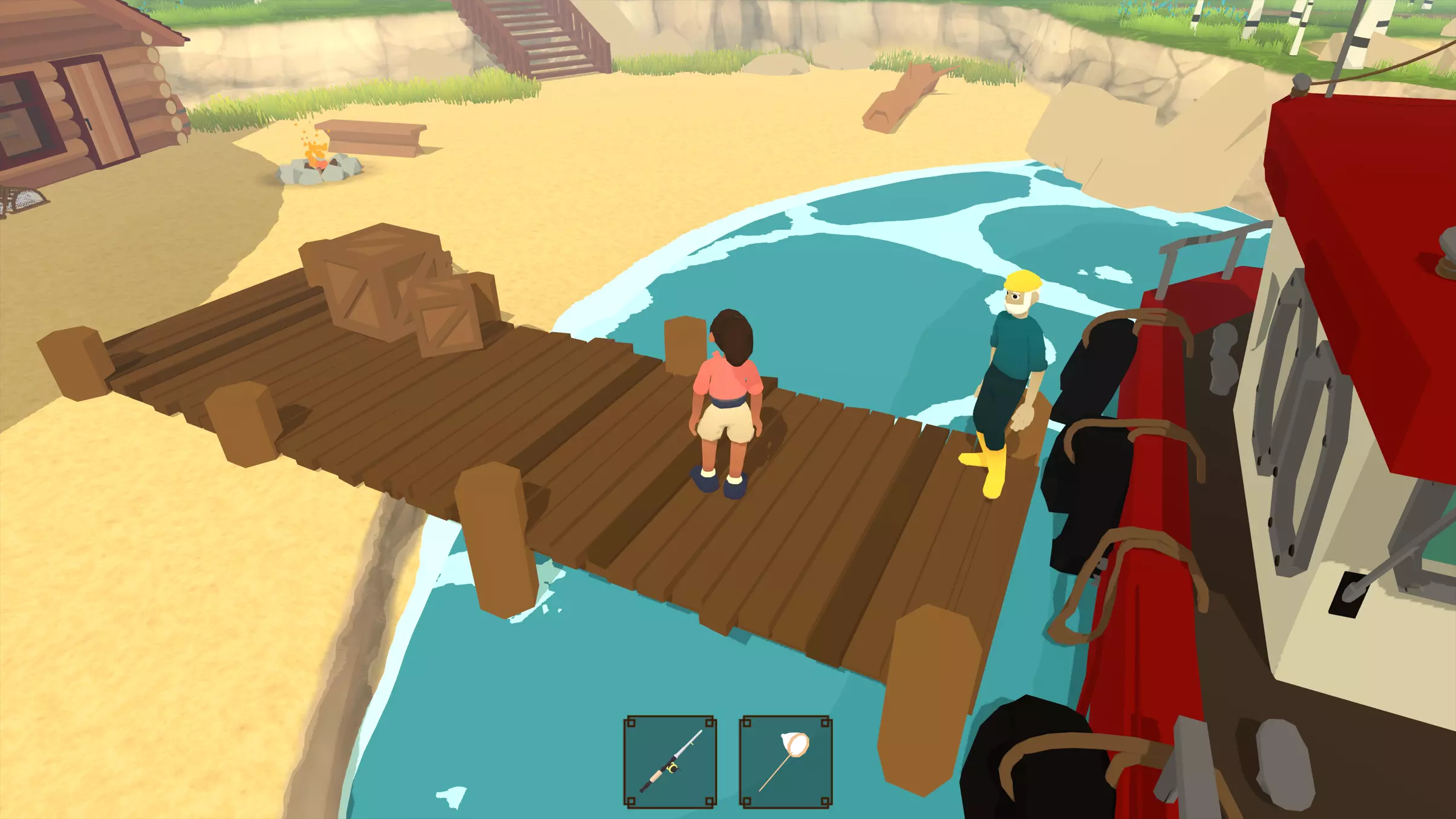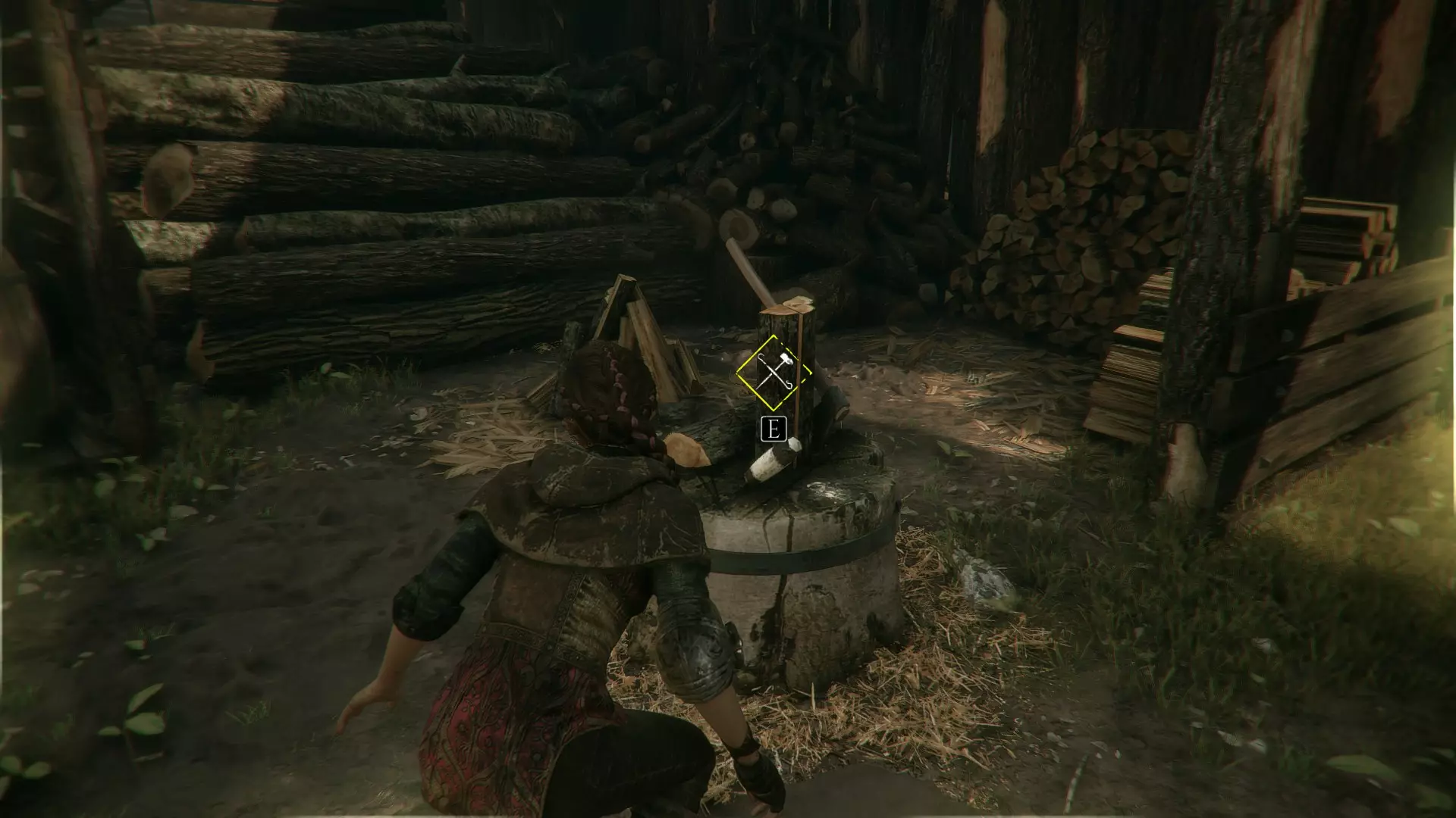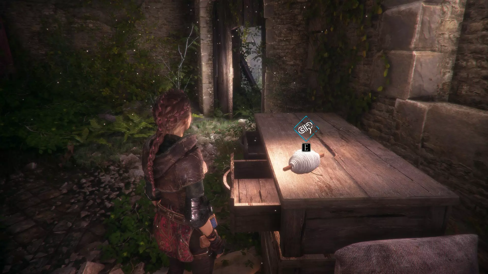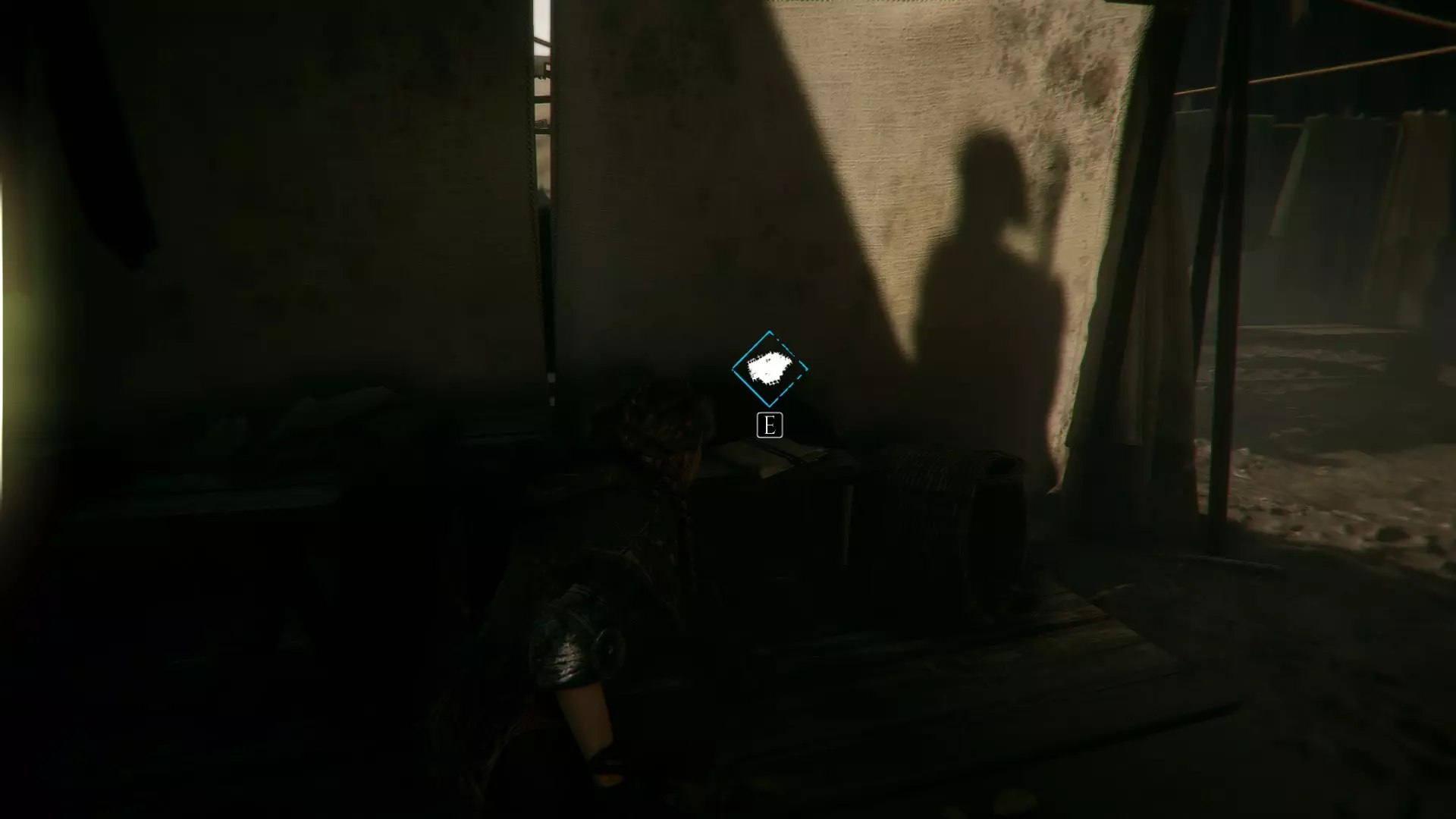 工作台在室外,向右走下楼梯可以找到工具和布料。绳索位于工作台前方墙壁的左侧。