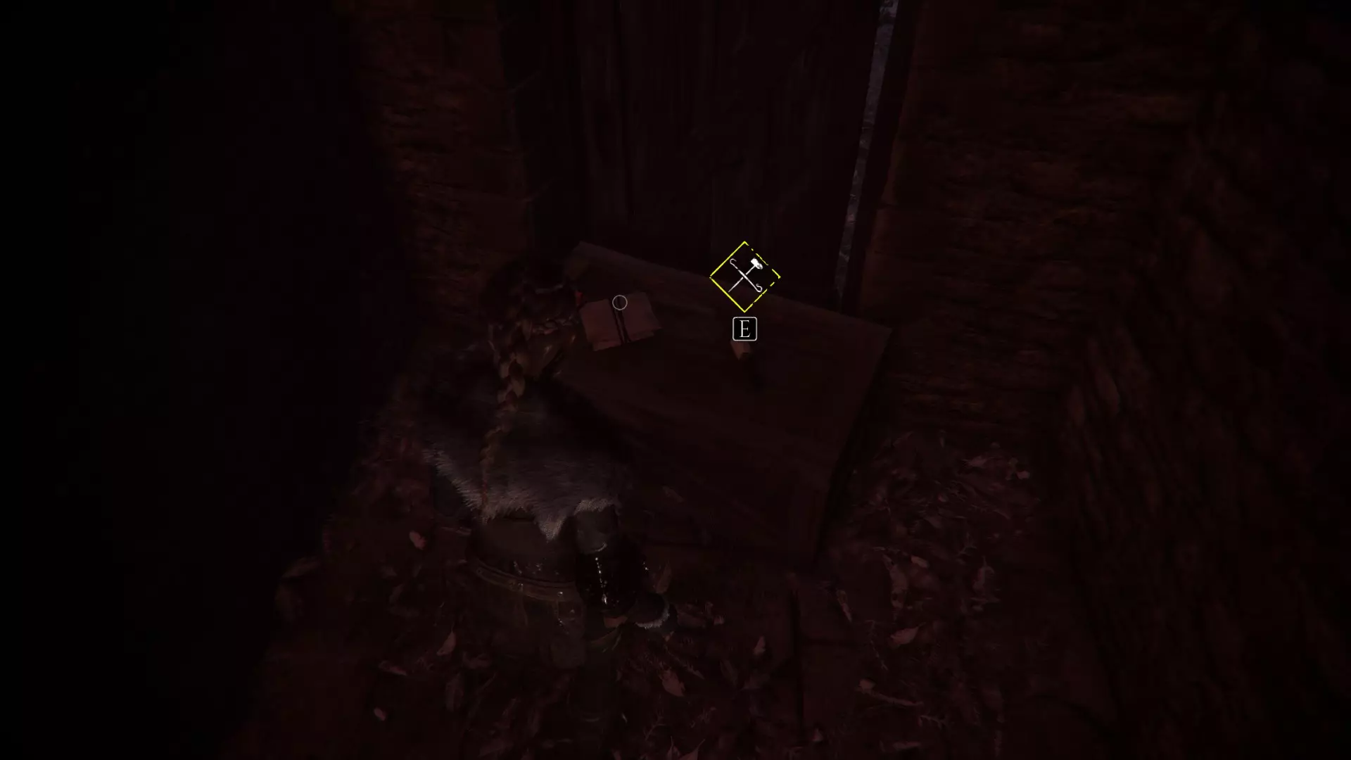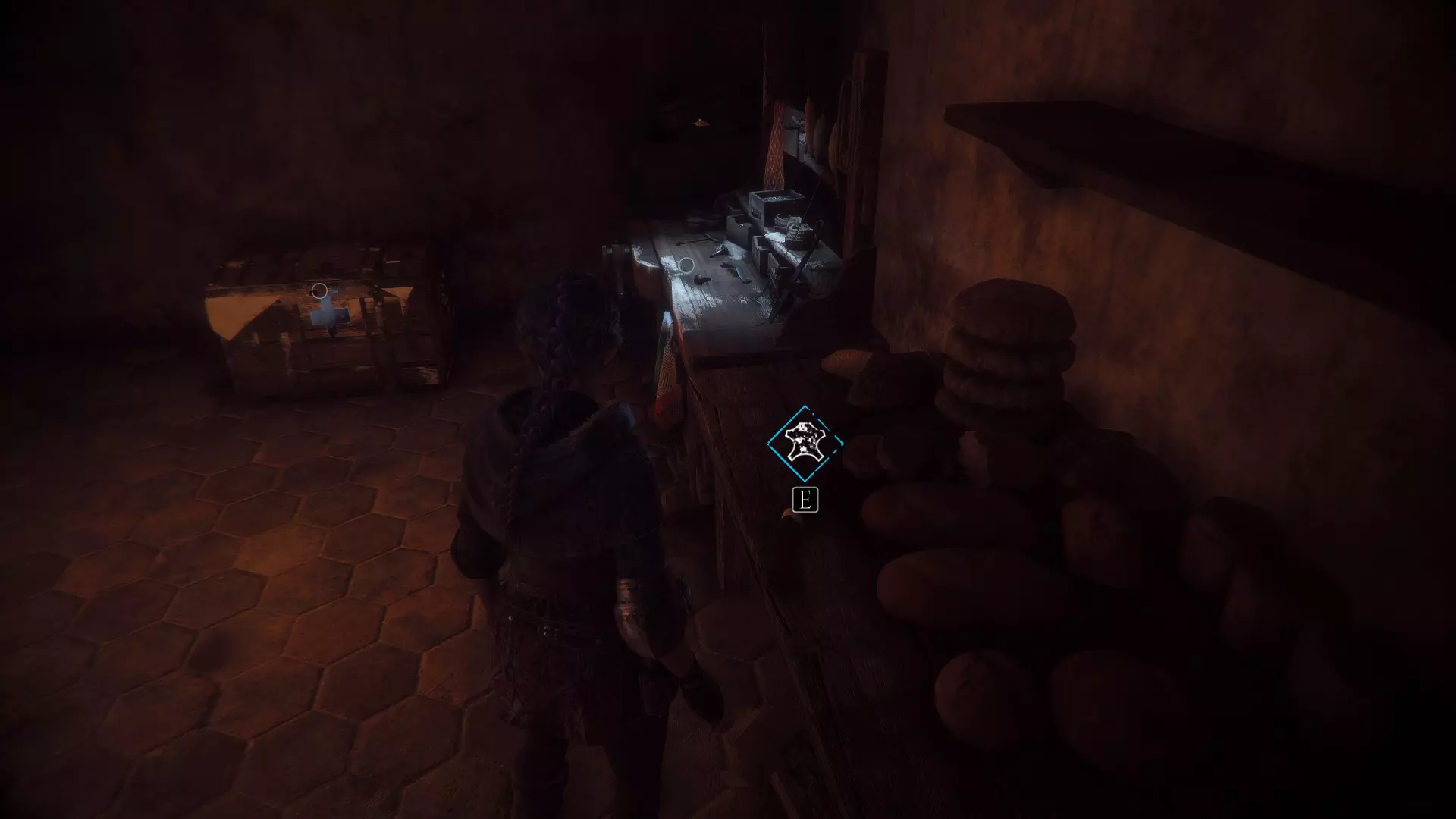 继续向下走并向左转,你会在工作台的左侧找到皮革,右侧则有一个工具。