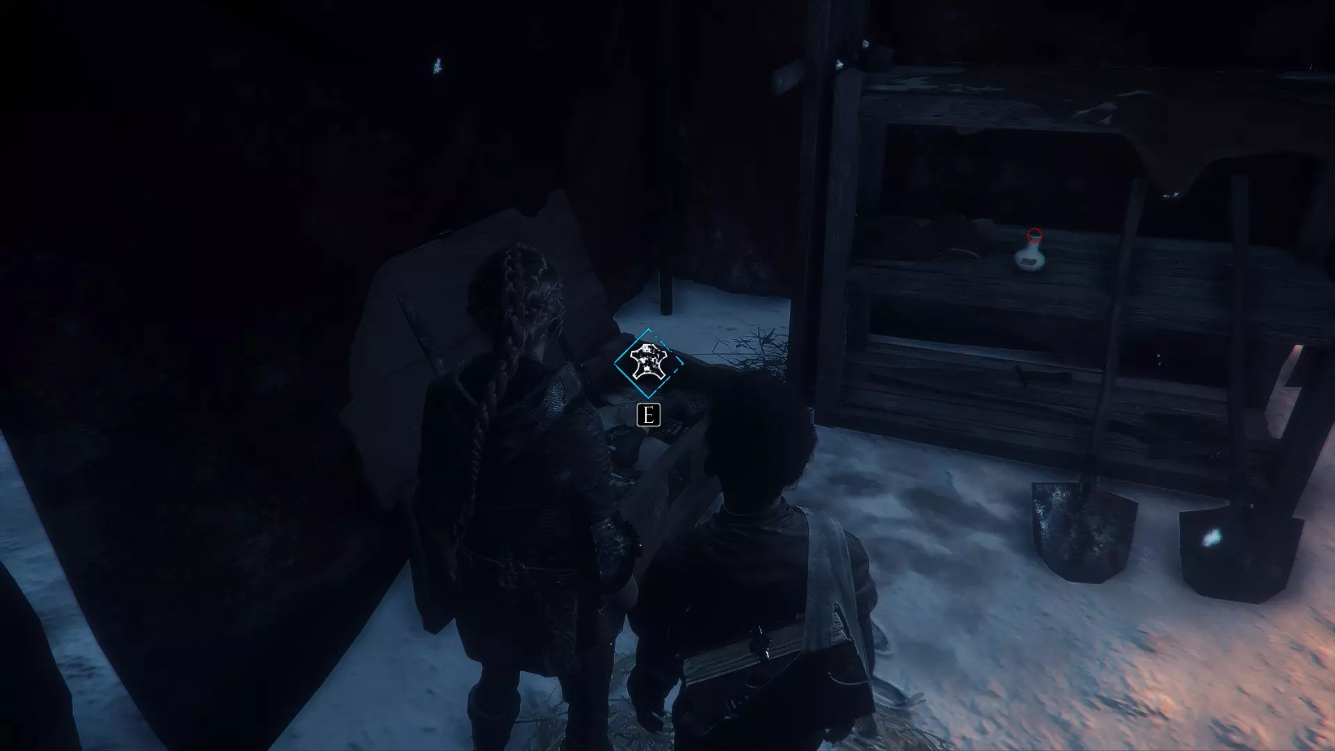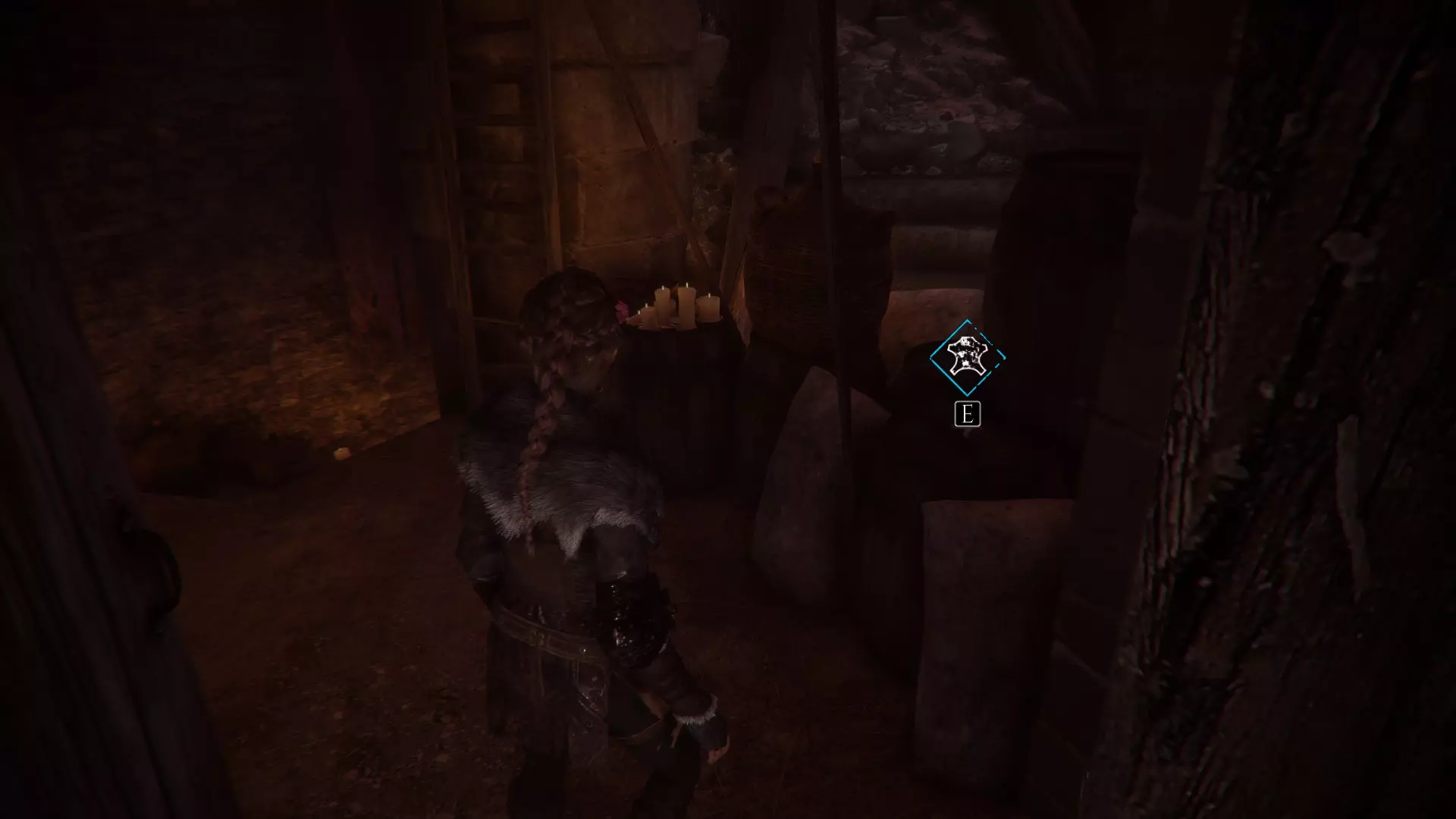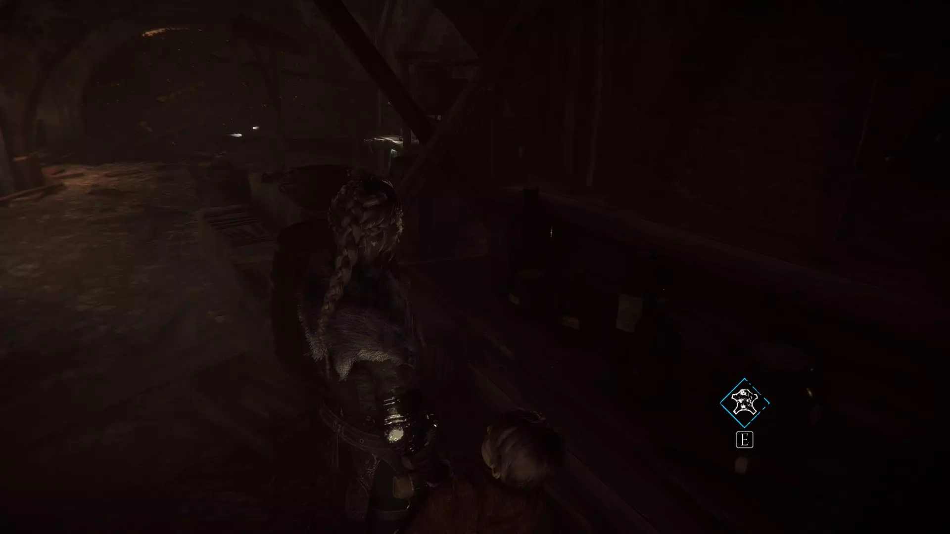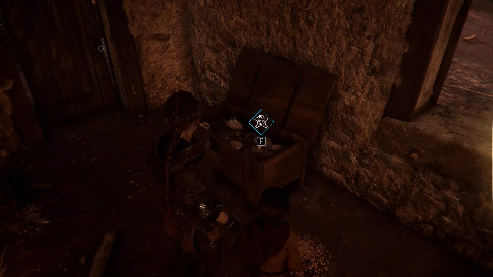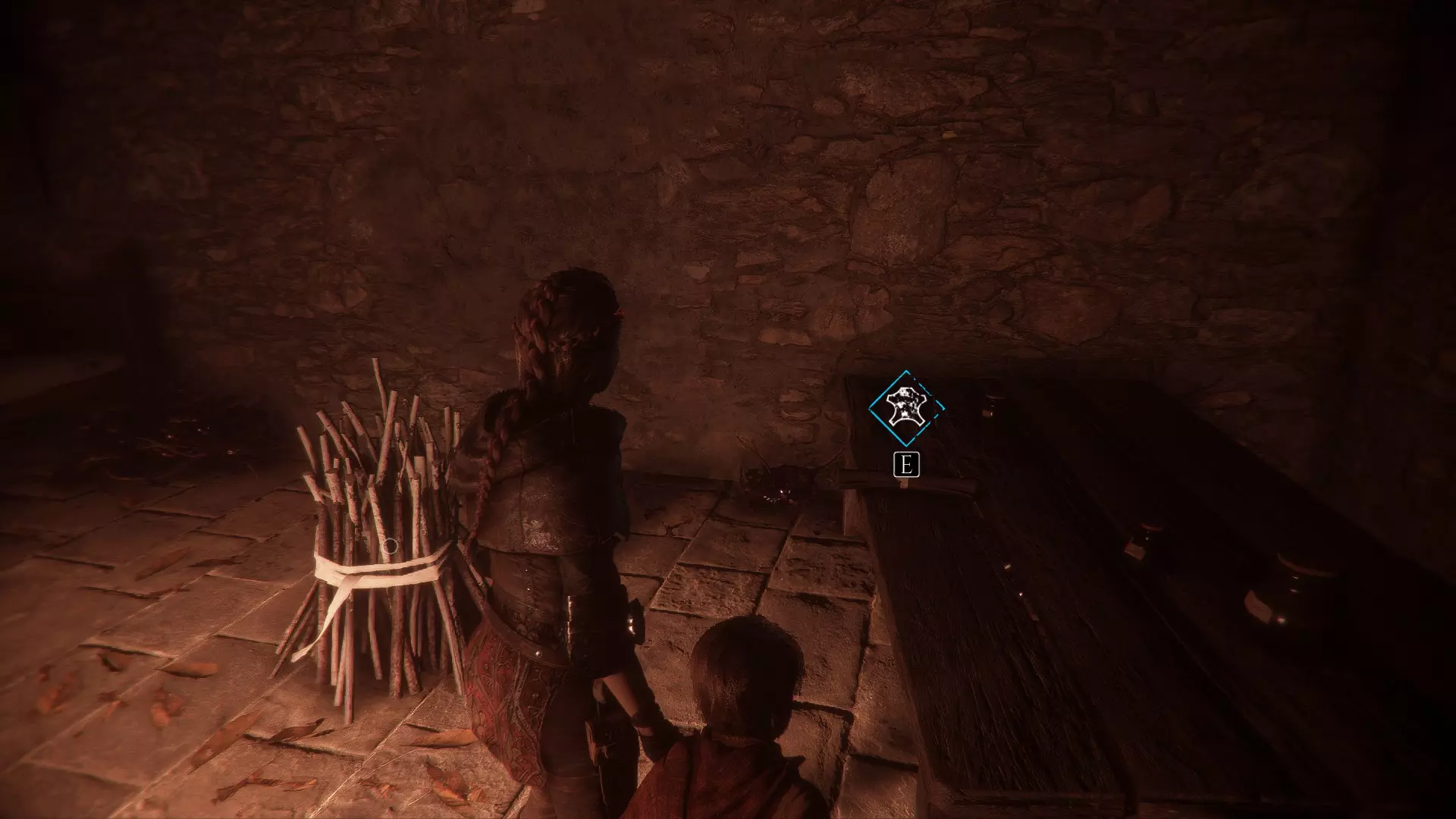 在两个男人离开家的场景之后,当你走下梯子时,向左急转弯可以找到一根绳子。再往下走会有一些树枝,拿一根点燃,用来穿过老鼠群,然后左转点燃墙上的火把。那里会有一个箱子,里面装有工具和皮革。