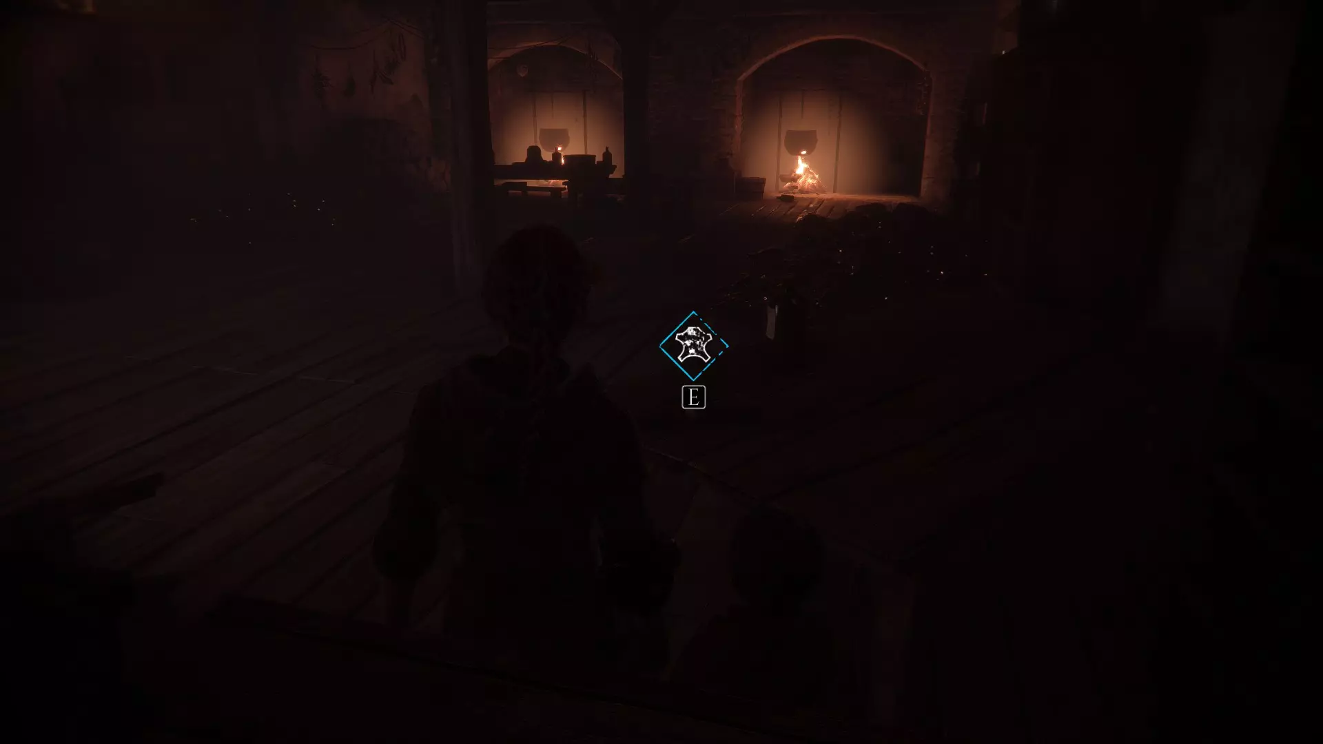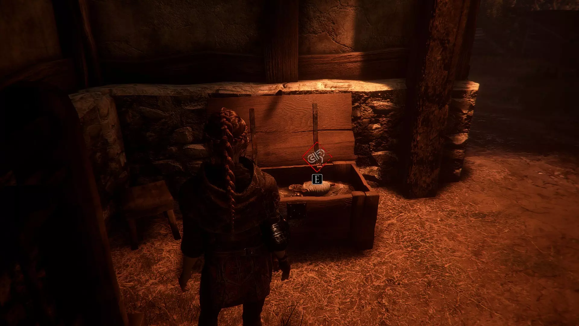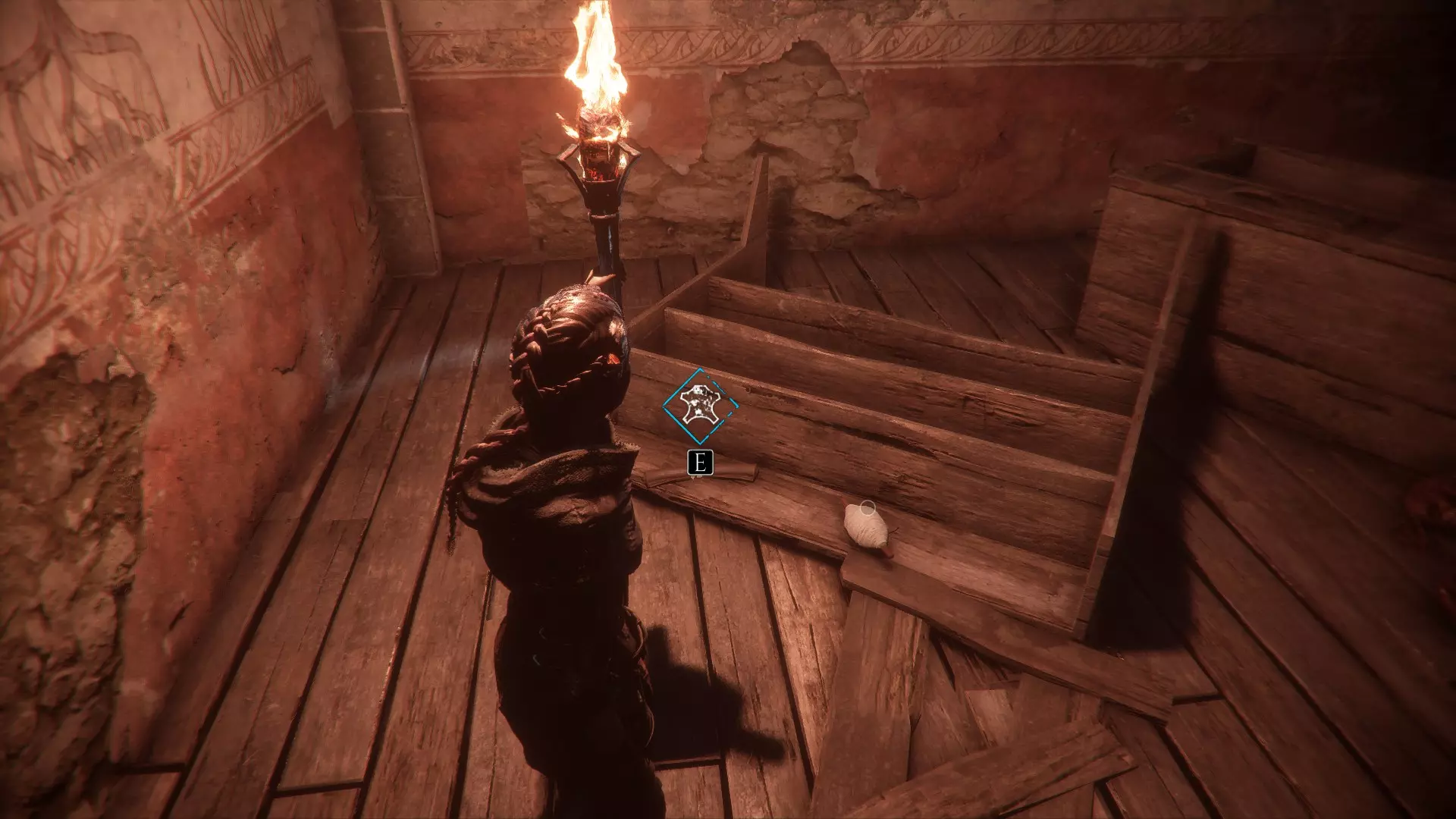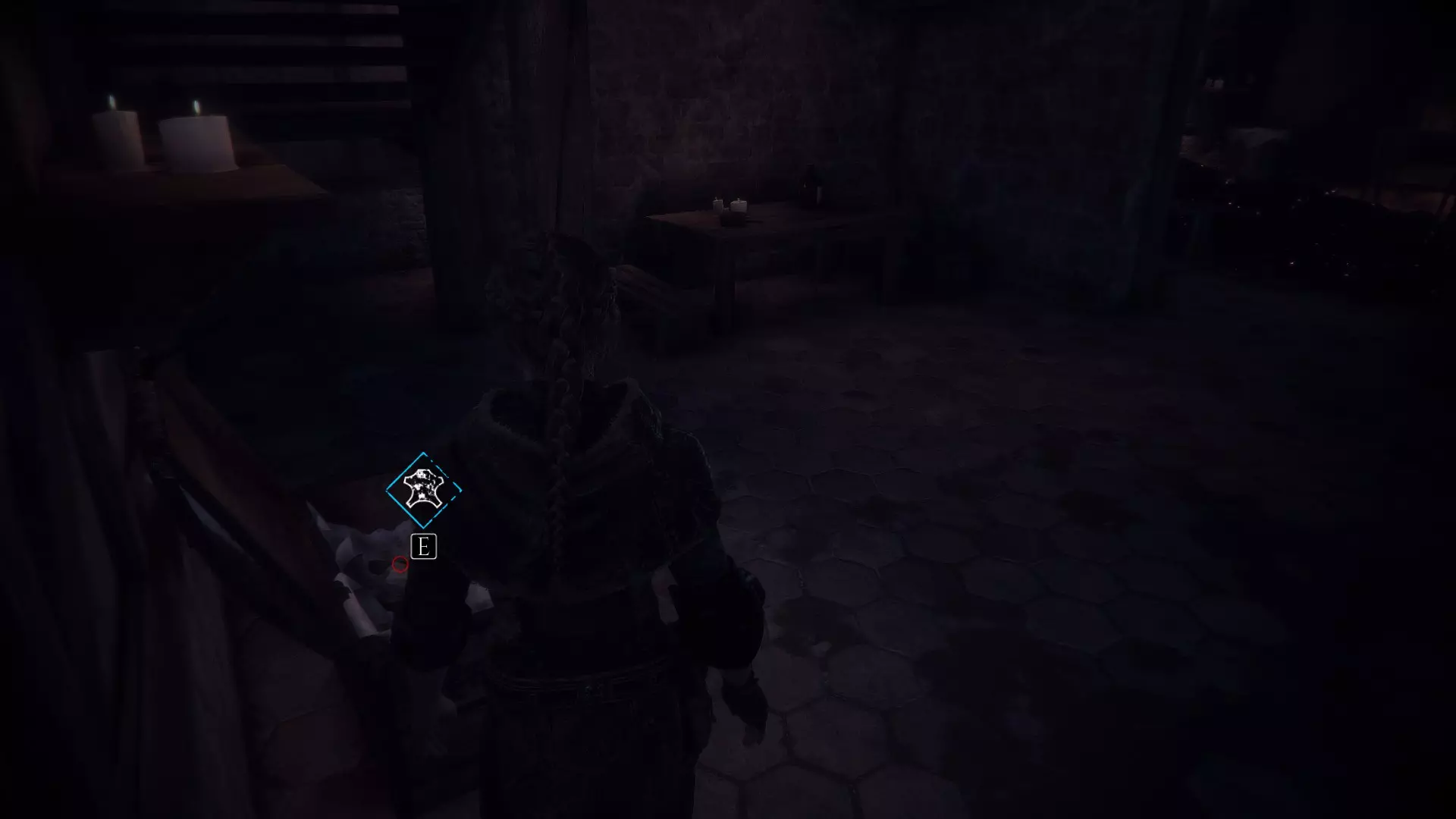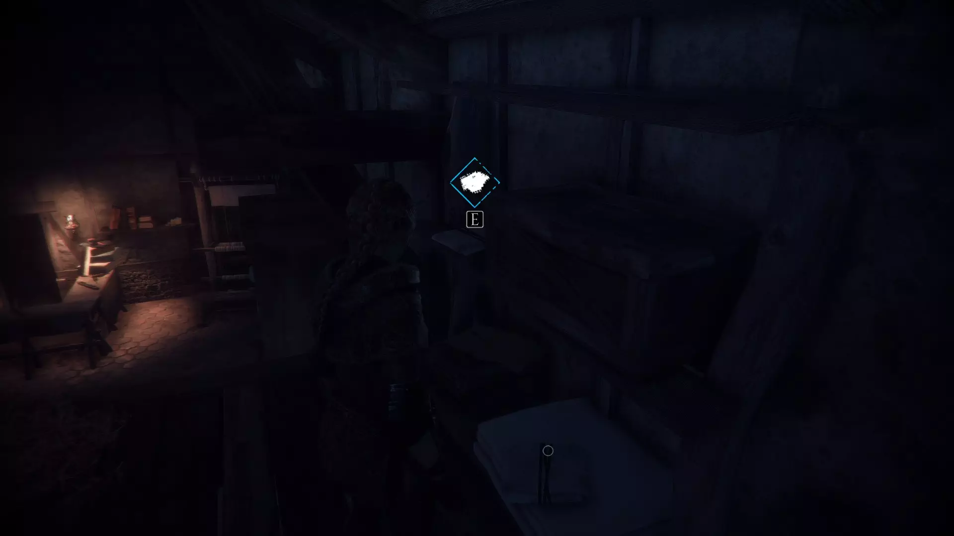 在两个男人离开家的场景之后,当你走下梯子时,向左急转弯可以找到一根绳子。再往下走会有一些树枝,拿一根点燃,用来穿过老鼠群,然后左转点燃墙上的火把。那里会有一个箱子,里面装有工具和皮革。