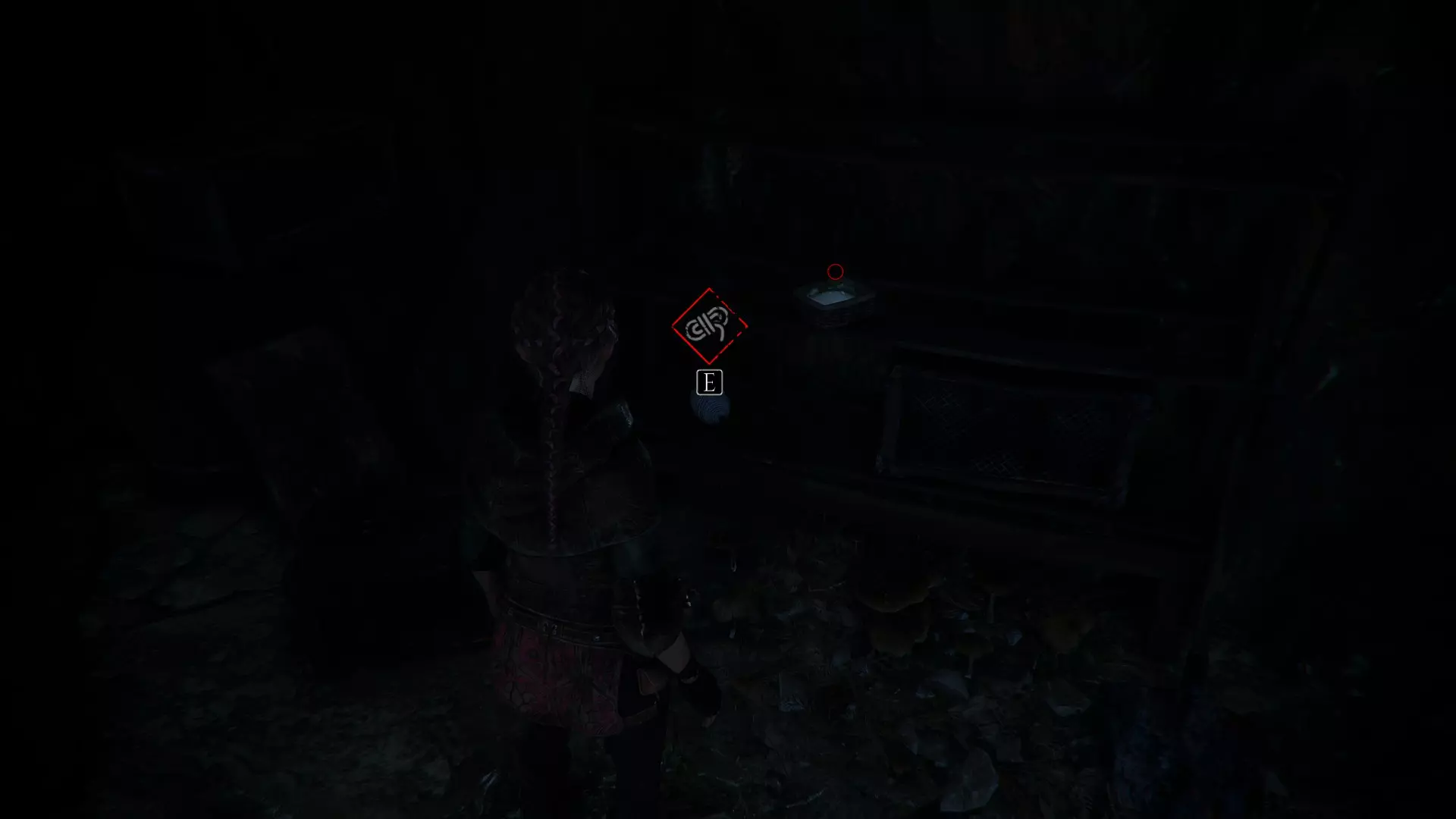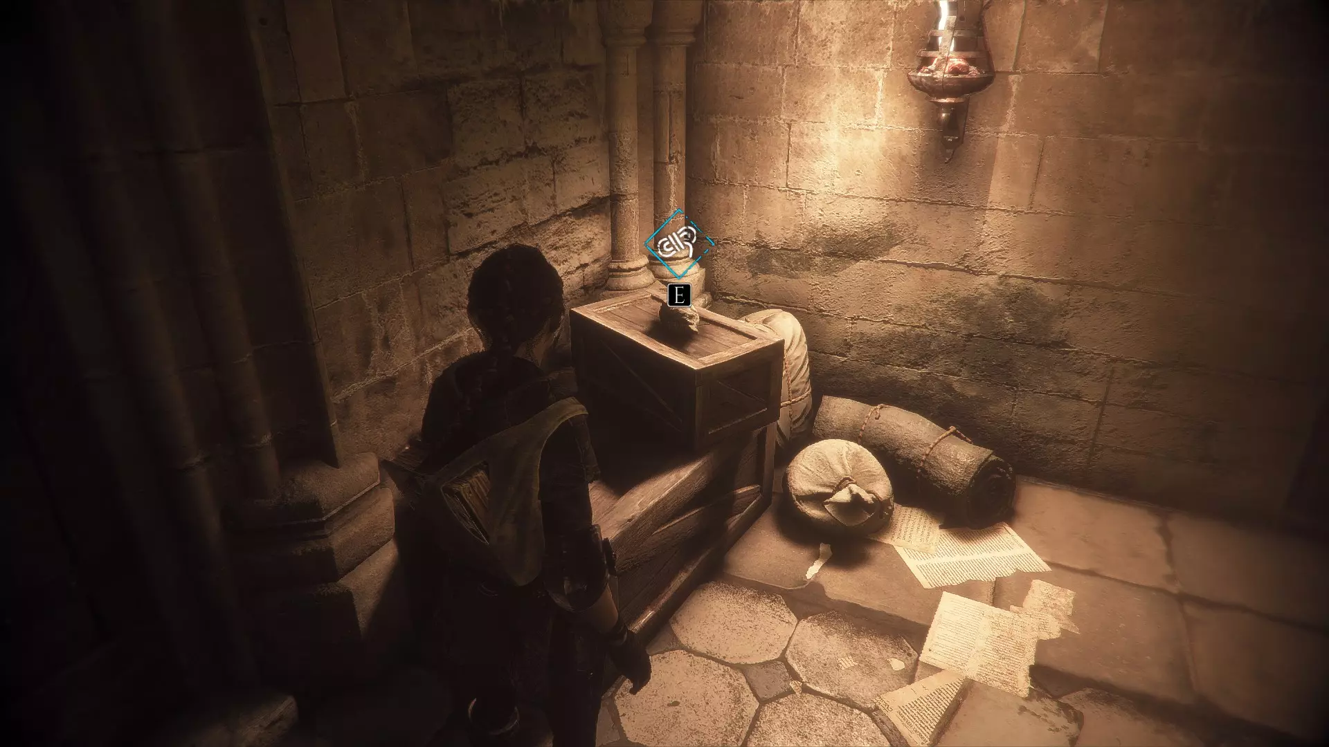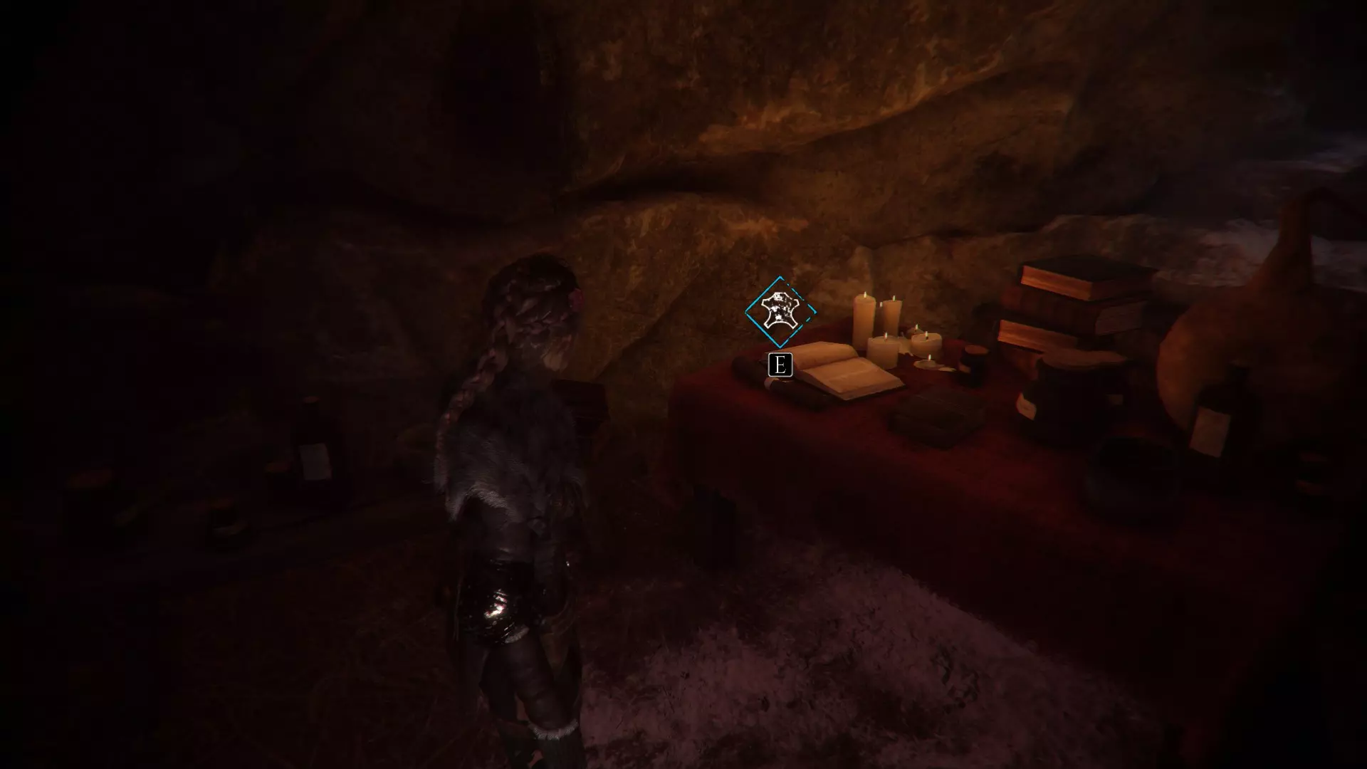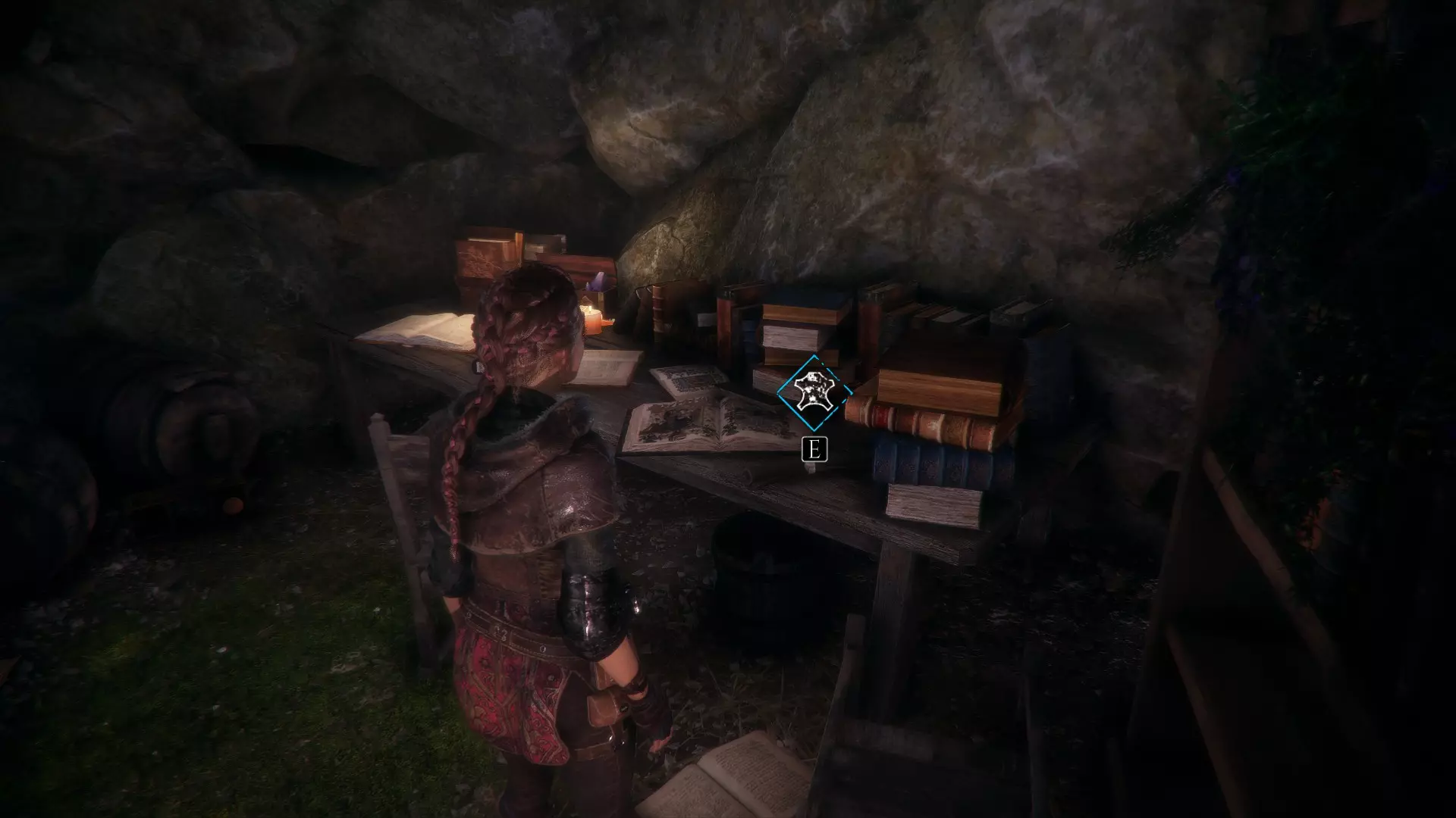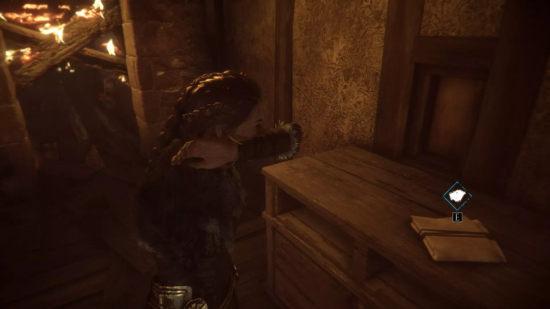 在两个男人离开家的场景之后,当你走下梯子时,向左急转弯可以找到一根绳子。再往下走会有一些树枝,拿一根点燃,用来穿过老鼠群,然后左转点燃墙上的火把。那里会有一个箱子,里面装有工具和皮革。