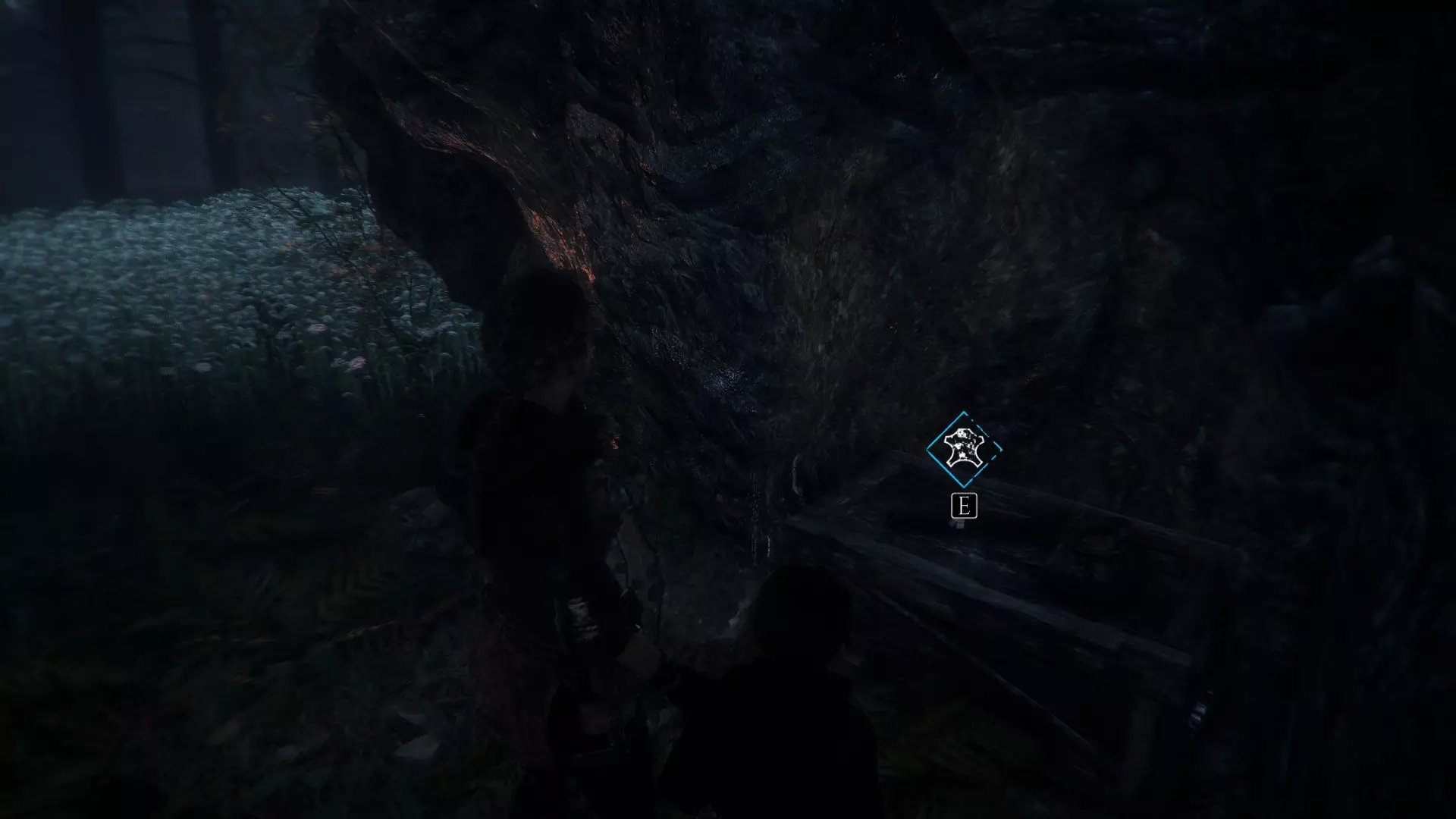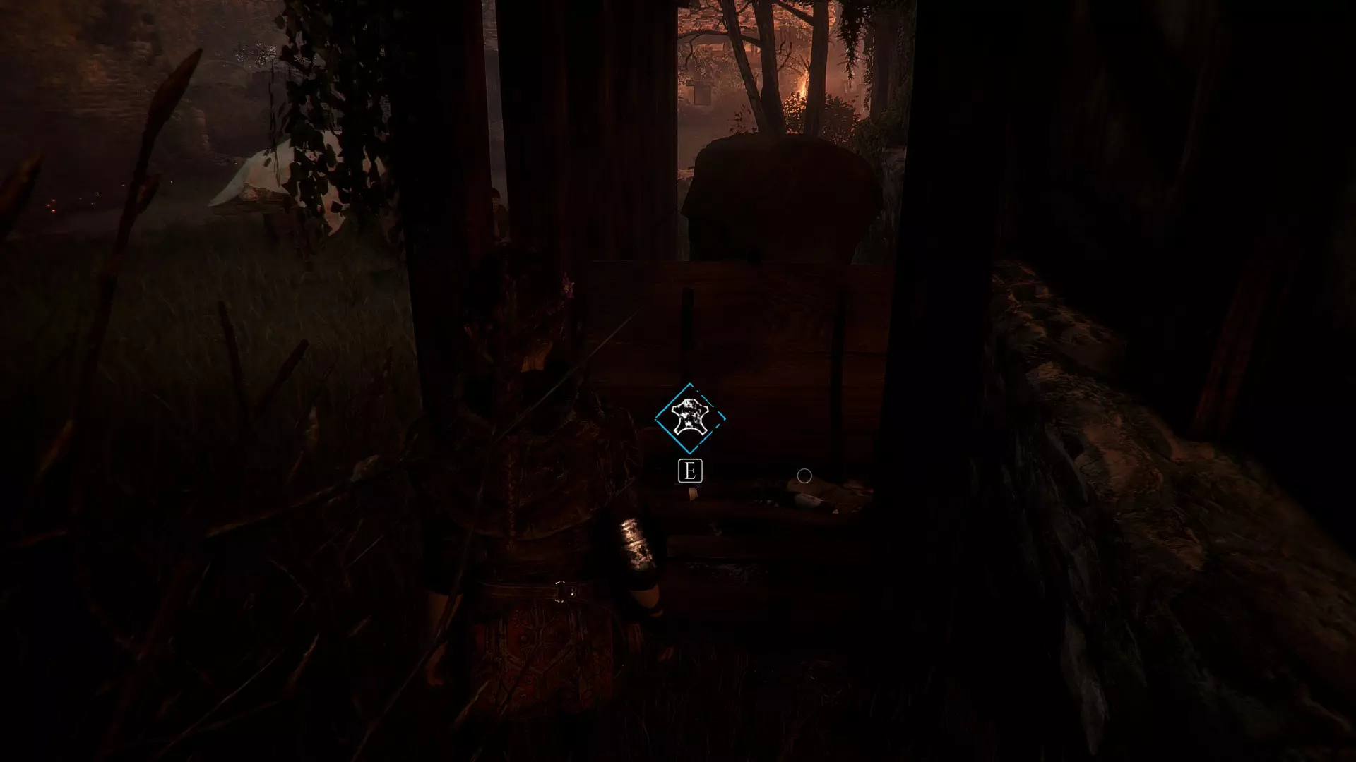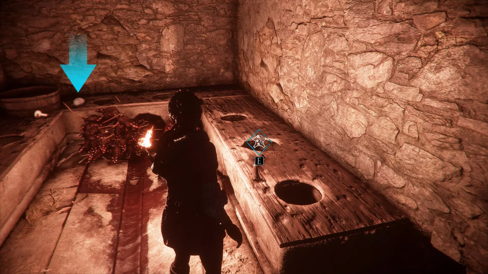 在帮助雨果之前,左边有一个厕所,前往雨果的路上有1块布料。燃烧一根木棍以获取皮革和绳索。