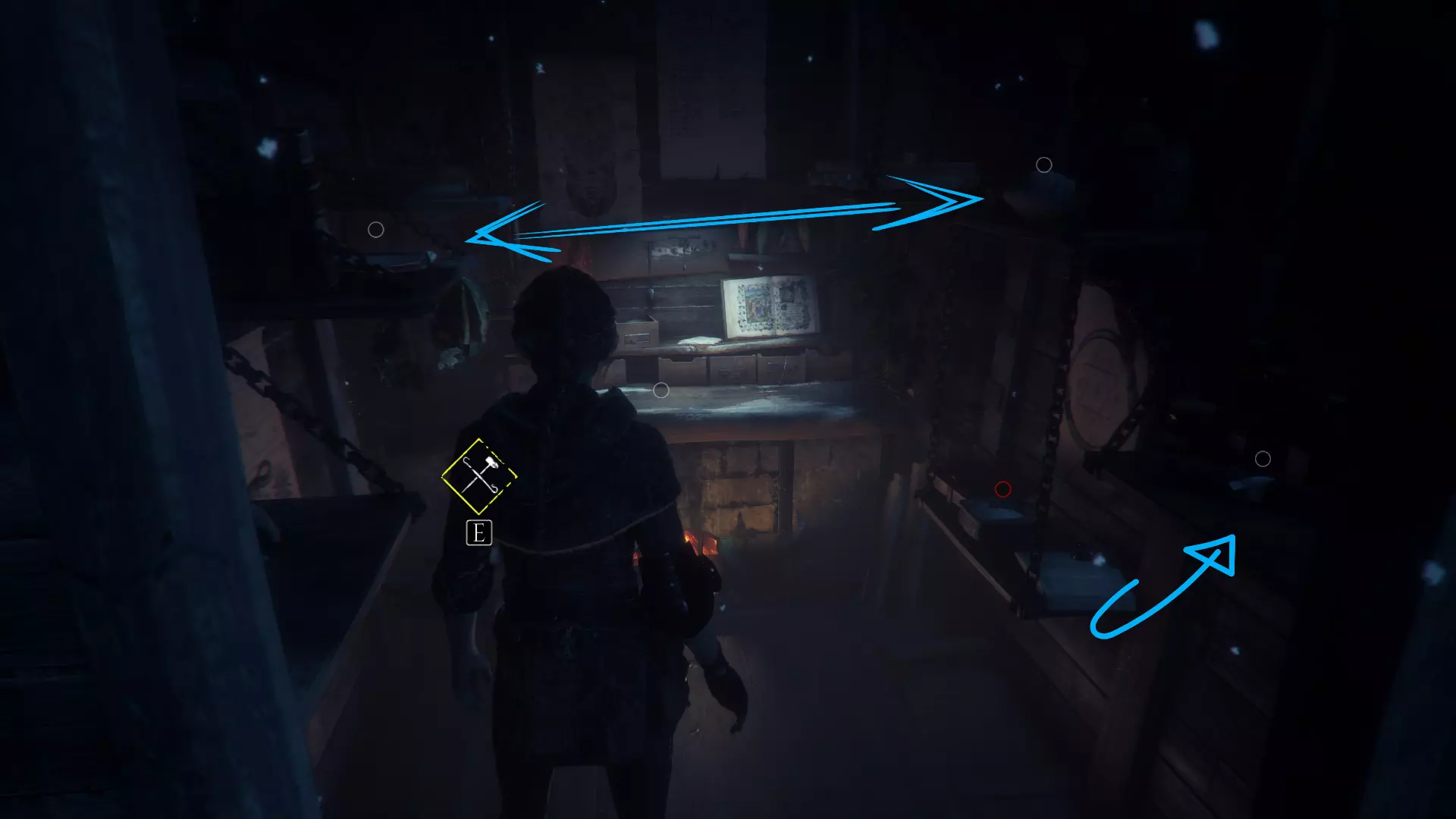 在爬上梯子后,在一个桶上,向吊灯射击使其摆动。在经过摆动的吊灯之前,进入右侧的房间。