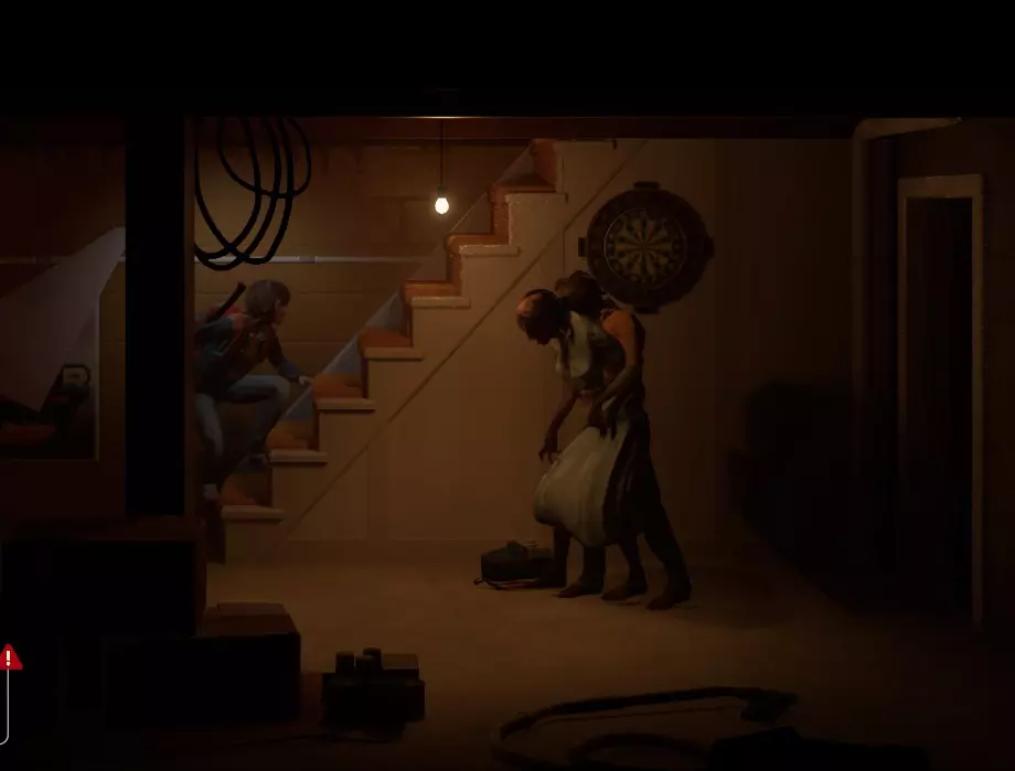 在雨果所在的梯子上方,放着一件工具。在地下室的工作台旁边有两根绳索。