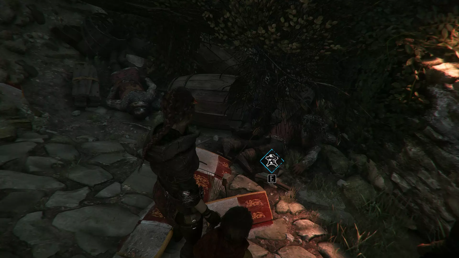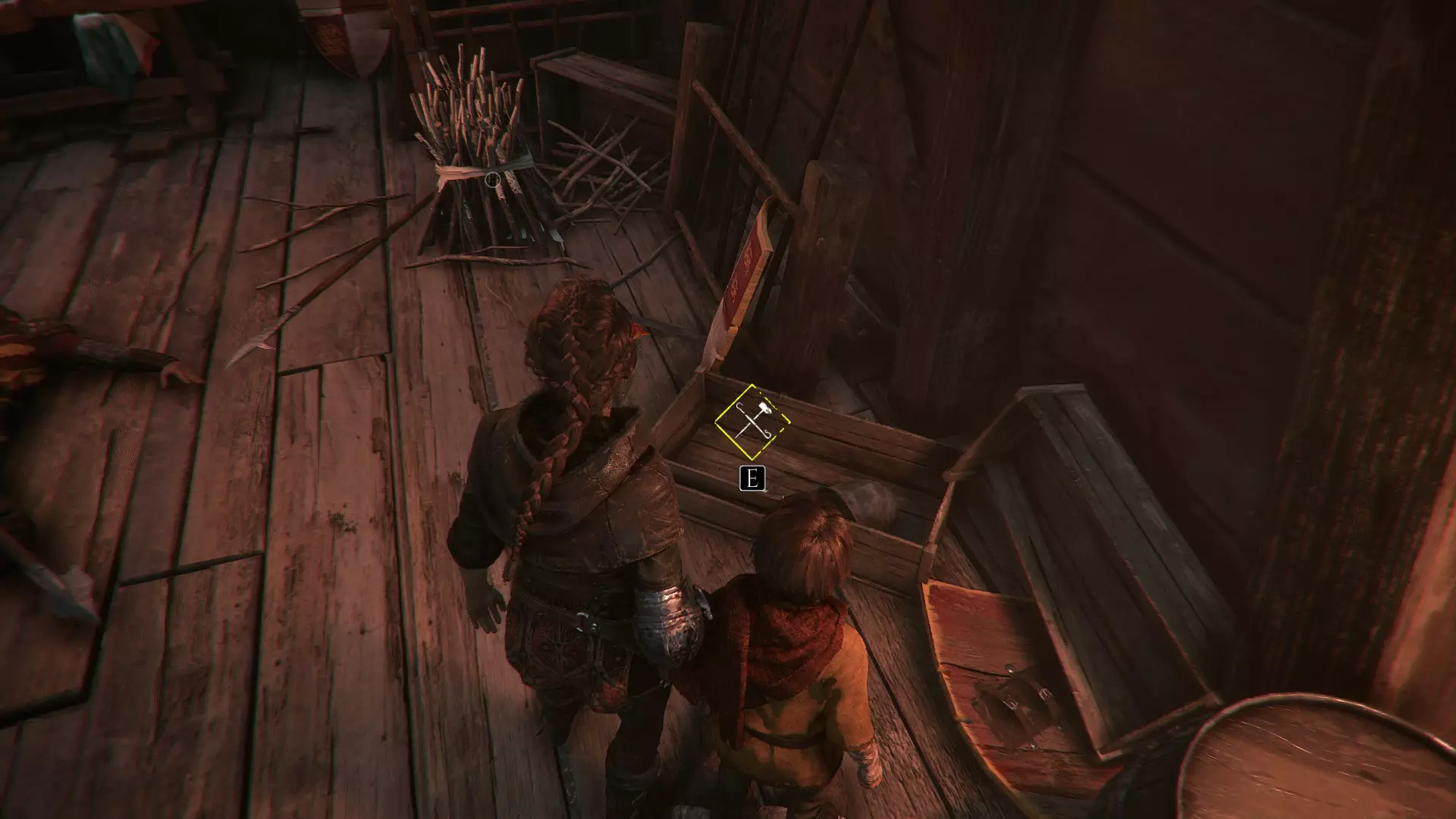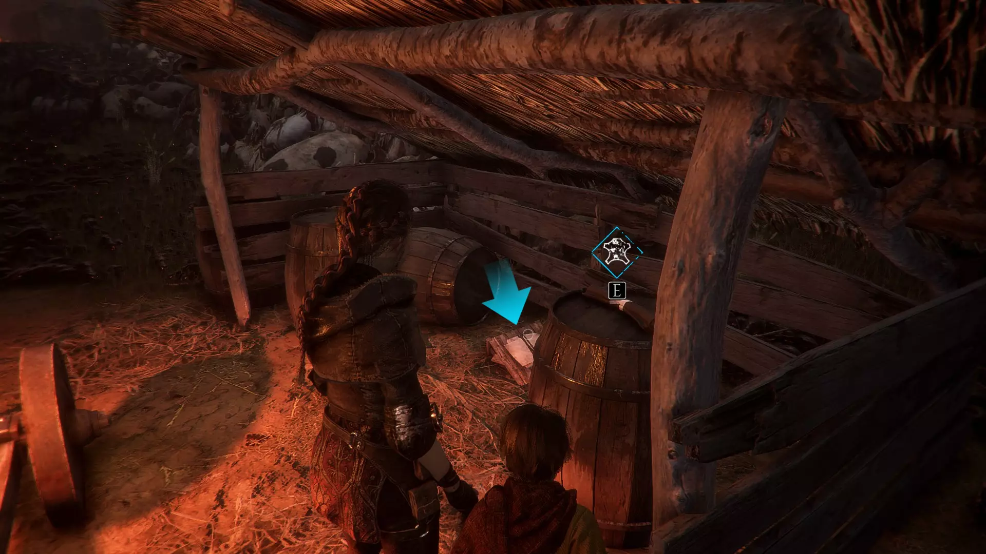 在帮助亚瑟之前,爬上那个需要移动火盆的梯子,在一个木箱上可以找到材料。在那个位置下方的桶上能找到皮革。