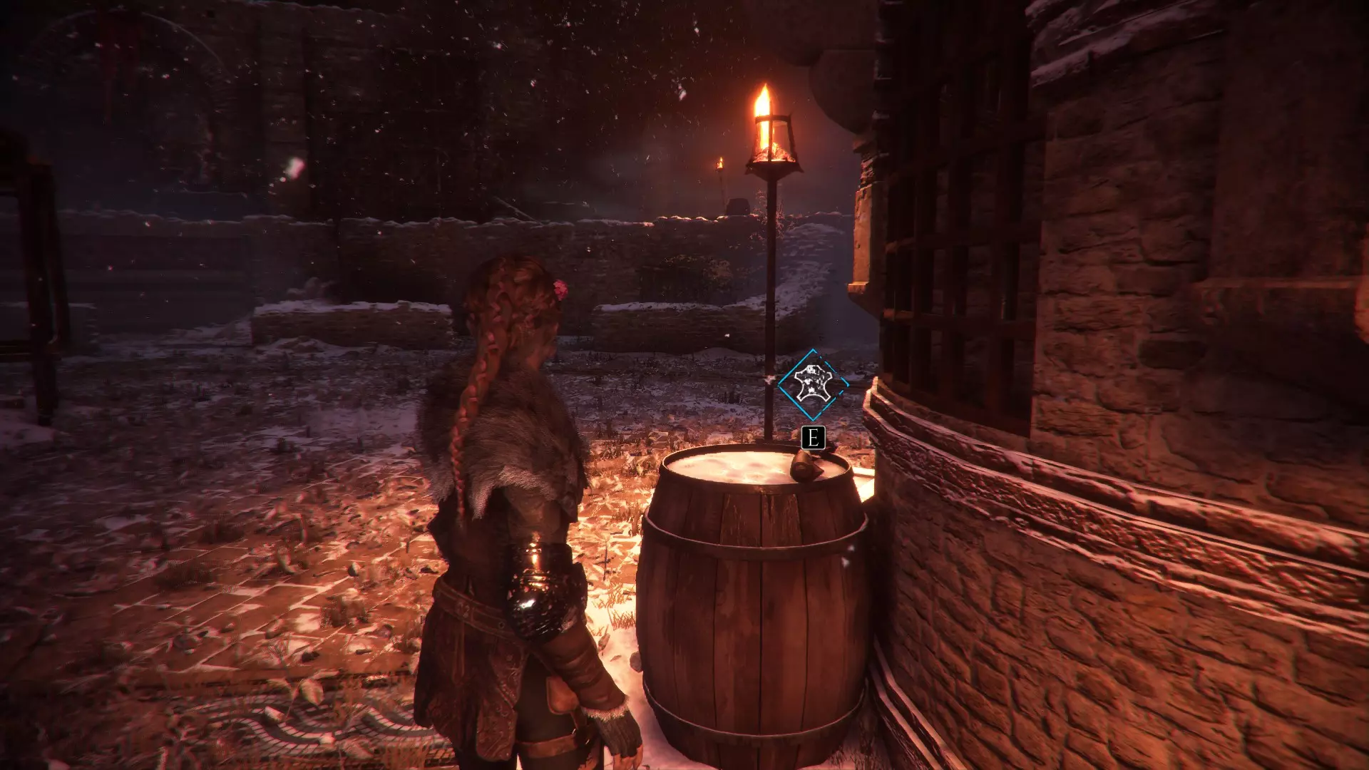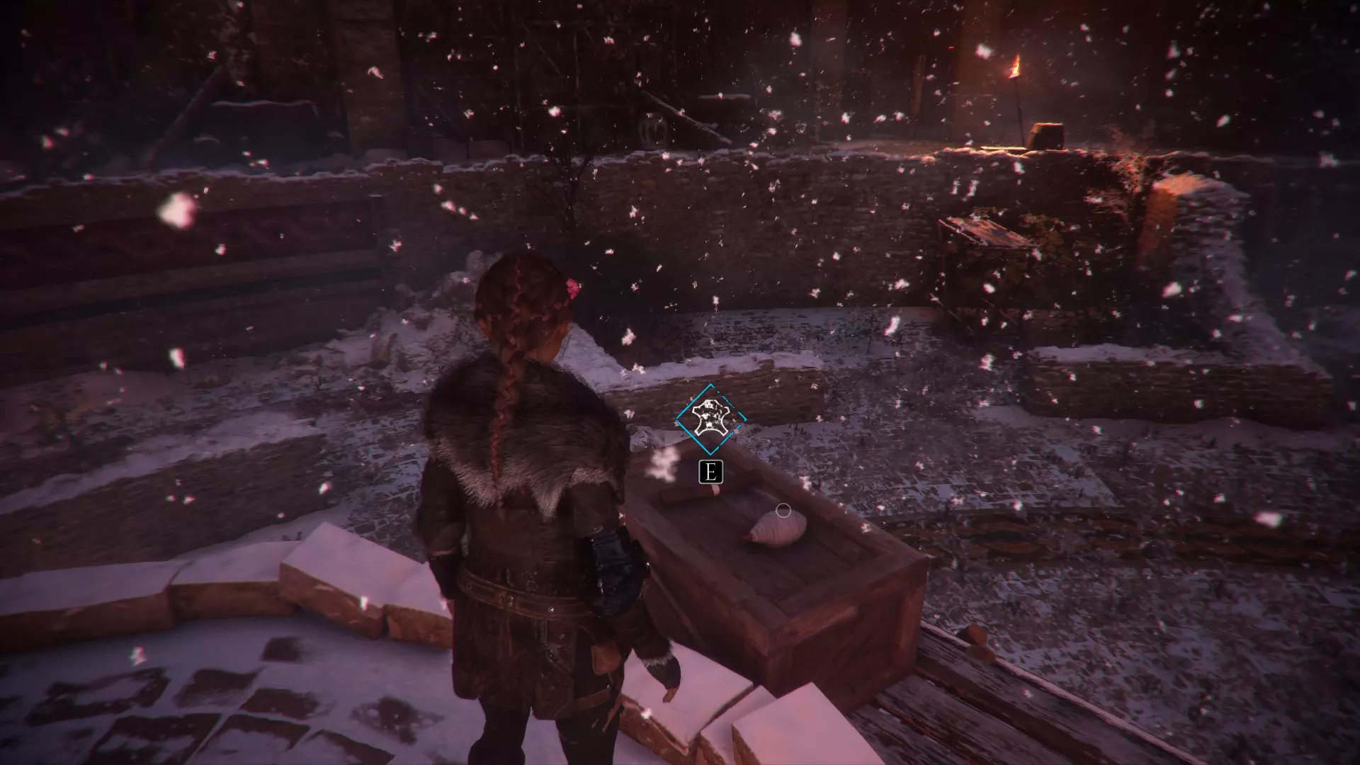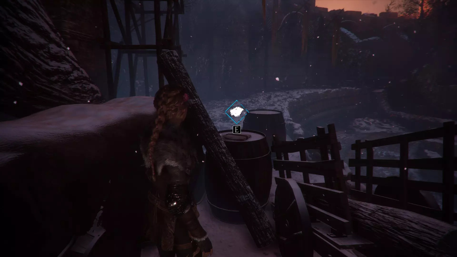 在帮助亚瑟之前,爬上那个需要移动火盆的梯子,在一个木箱上可以找到材料。在那个位置下方的桶上能找到皮革。