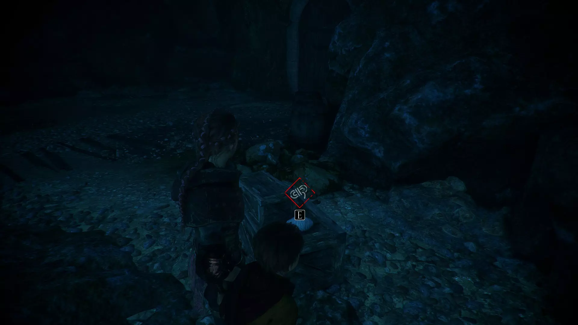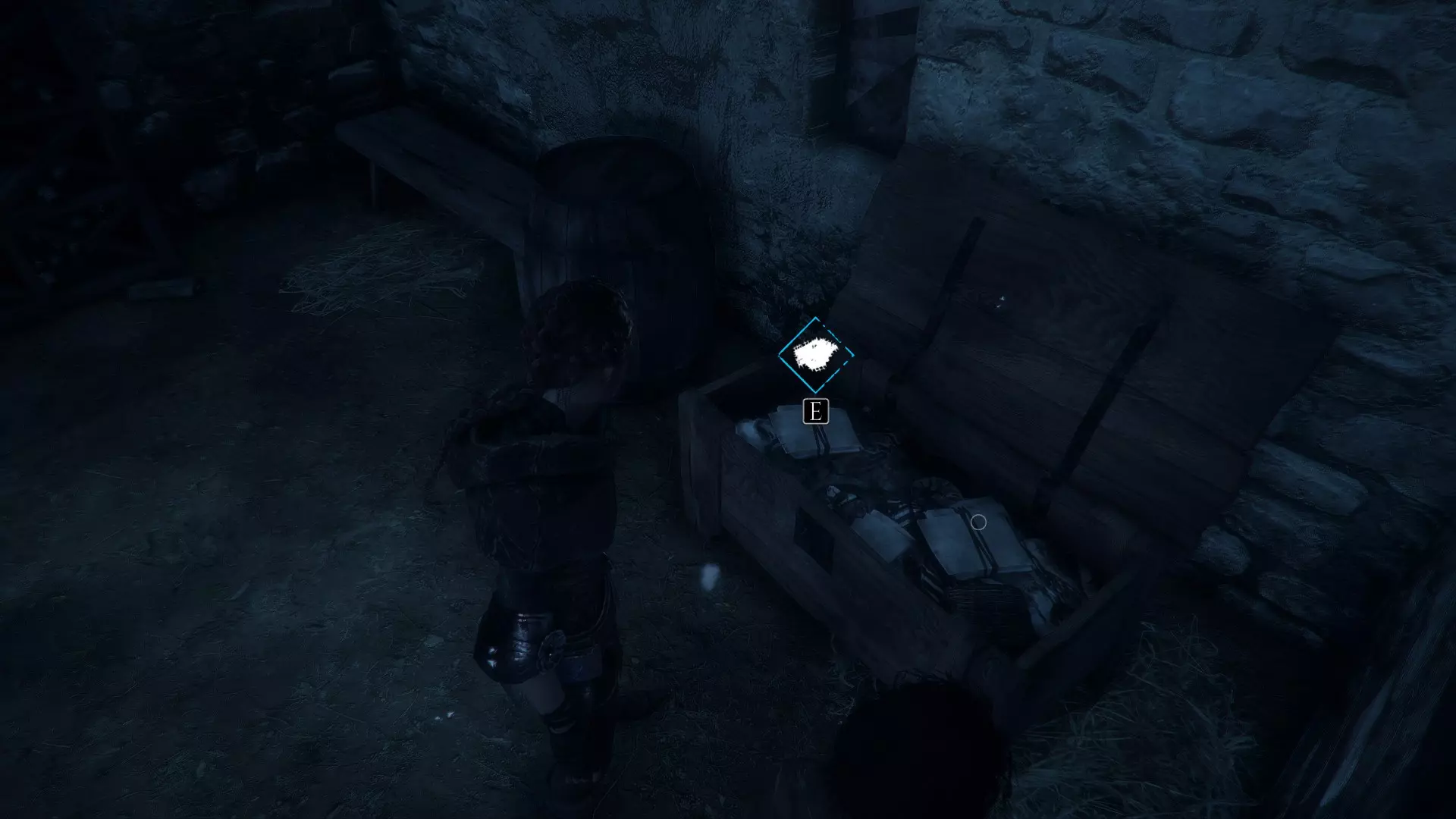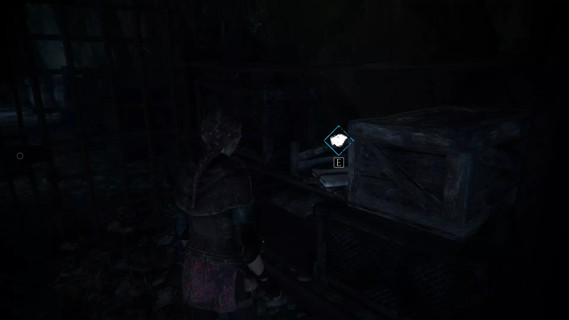 回到雨果所在笼子后面的工作台那里,沿着那条路往下走,你会在一个桶上发现一根绳子。再往桶后面走,还能找到一个箱子。让梅莉把它打开。