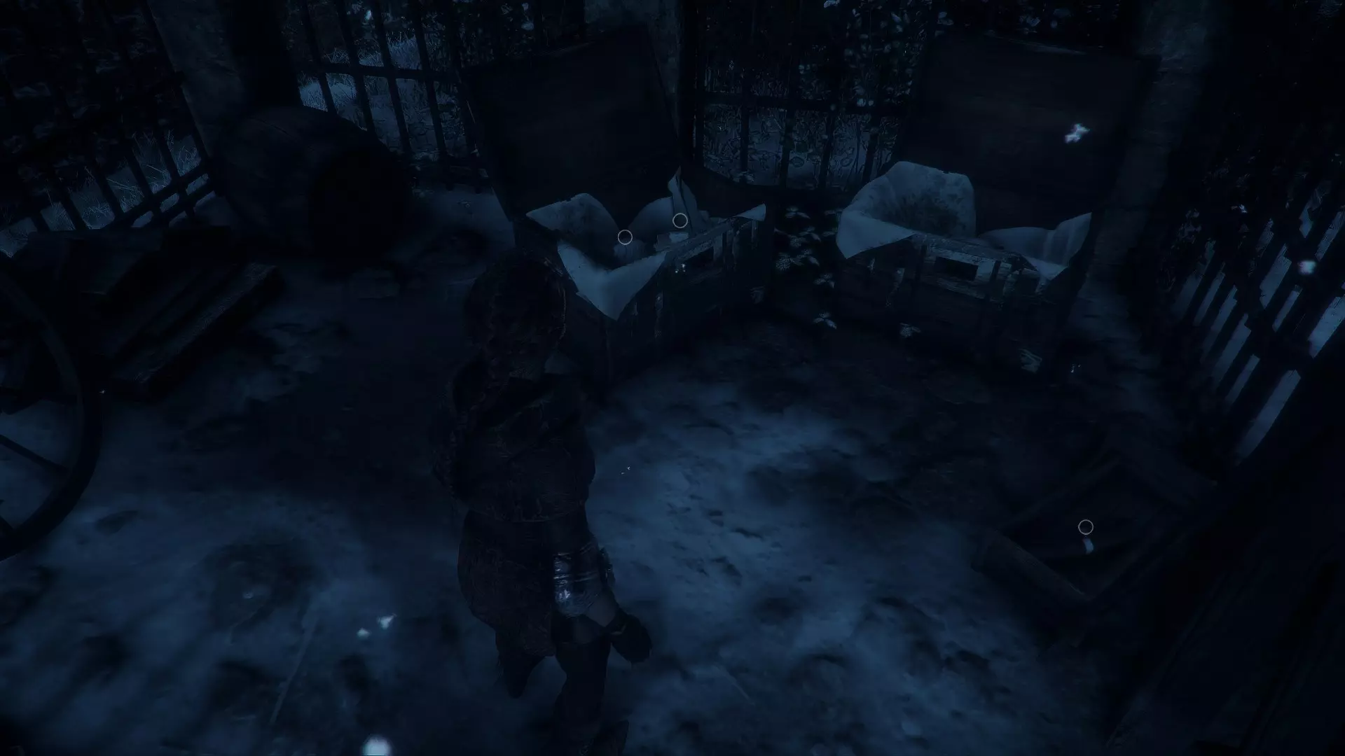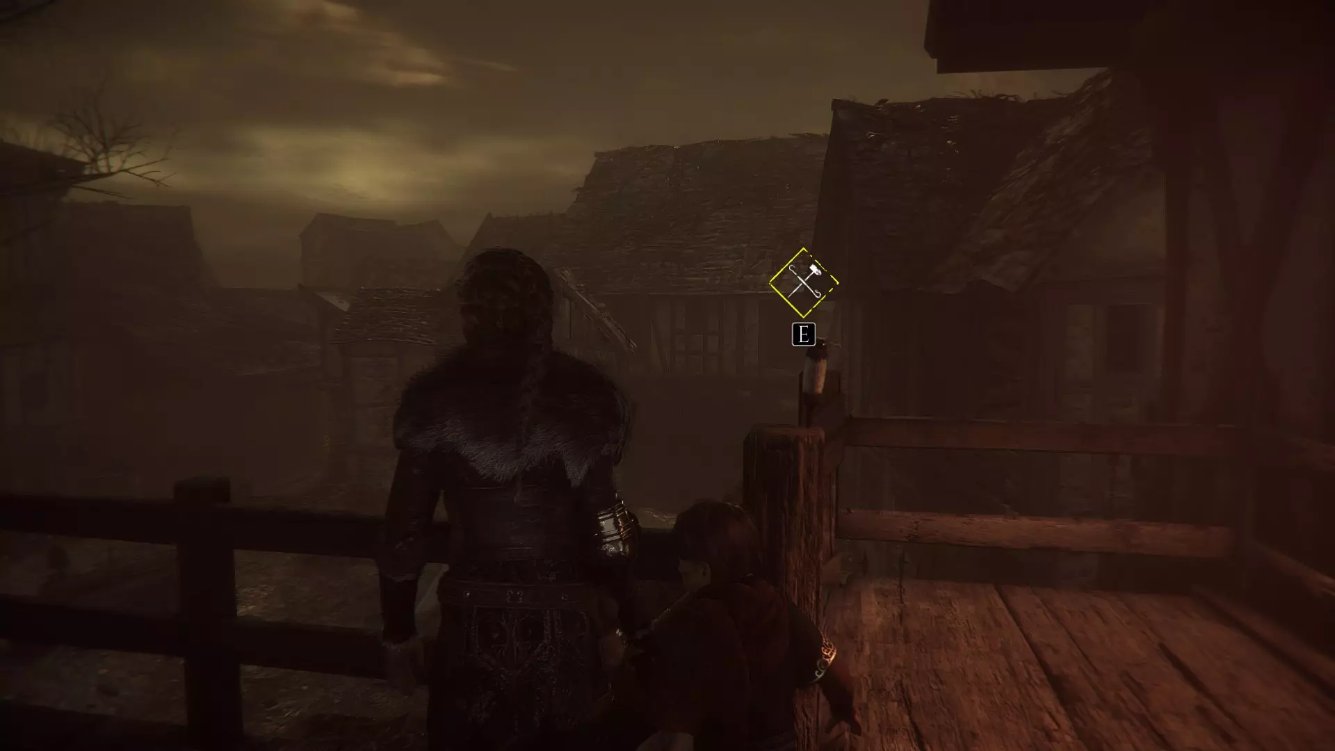 离开房子走下楼梯后,来到守卫站立的位置。在经过悬挂的尸体下方之前,先跳过围栏。
