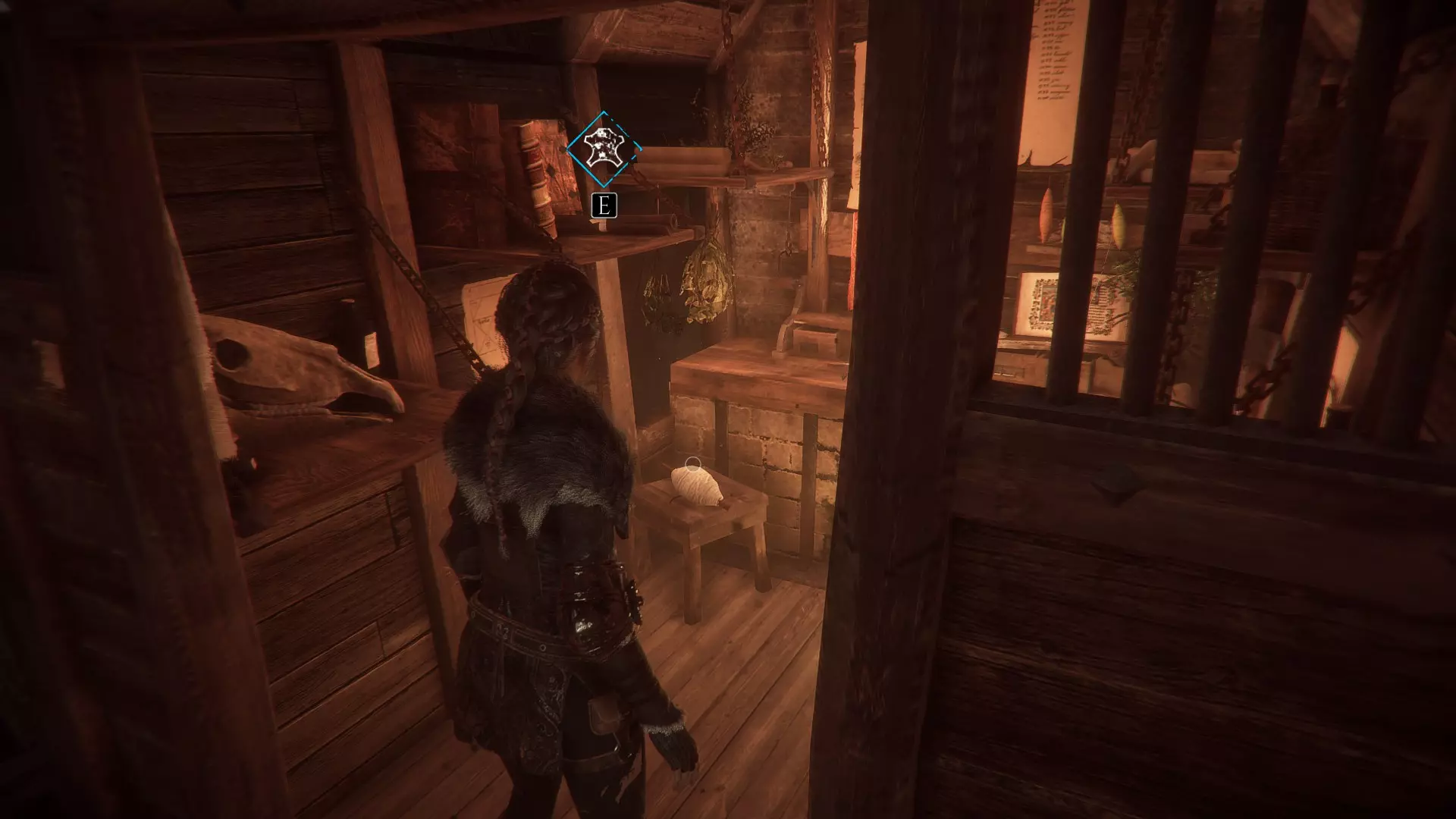 穿过房子里的房间,到羊皮珍品旁。架子上靠近床的地方有2块布料,旁边是皮革。