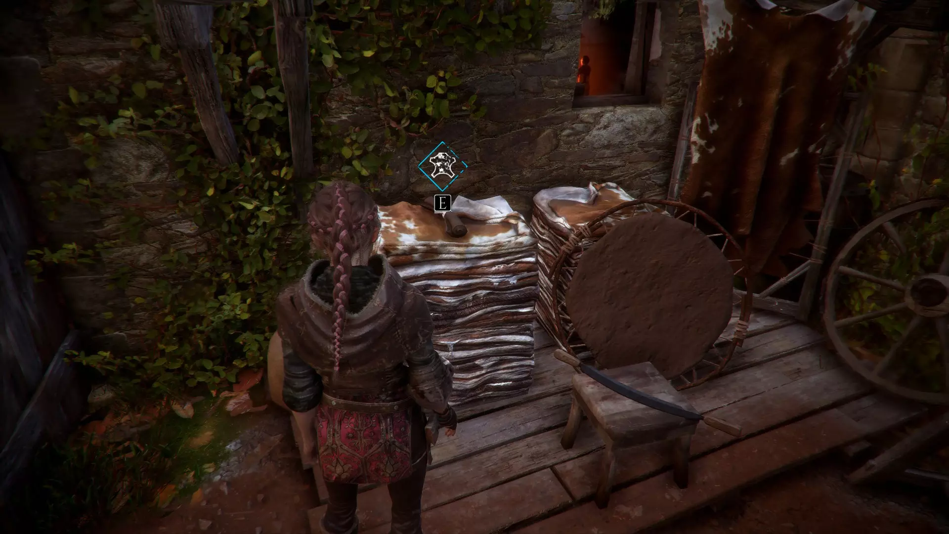 梯子前有布料和绳子。工作台右侧的板条箱上有皮革。