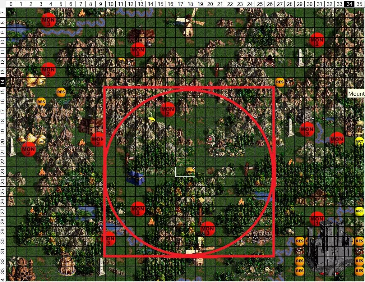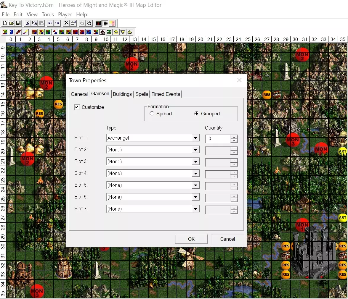 根据地图编辑器显示,圣物位于8格半径范围内,大致情况就是这样。 方法4:地图修改/编辑 这是所有方法中最快的一种,如果你只想要成就而不考虑其他因素的话。只需使用地图编辑器在你的初始城镇添加一支10个大天使的自定义军队,然后直接前往AI城镇。游戏并不将地图编辑视为“作弊”,所以这种方法确实有效。