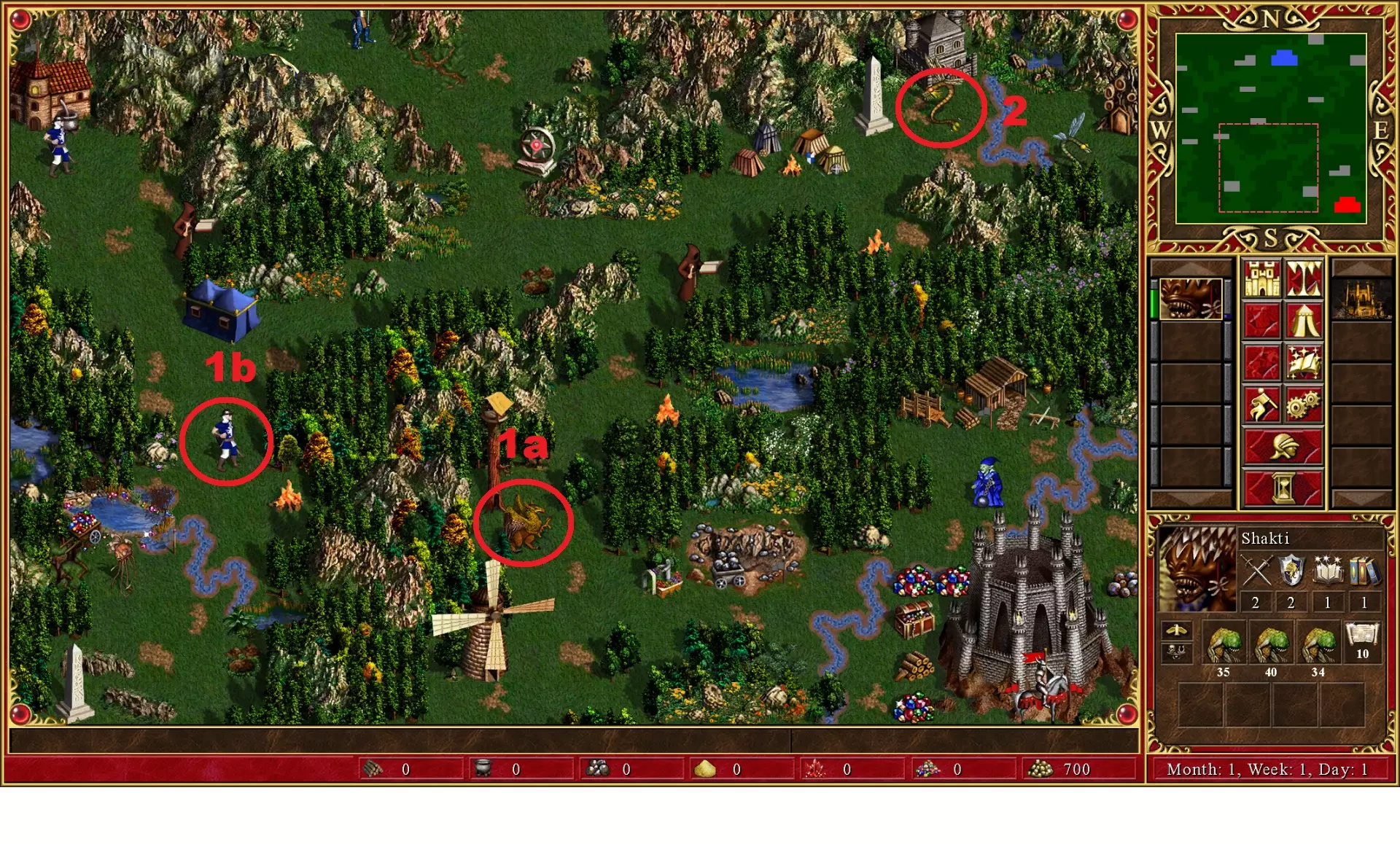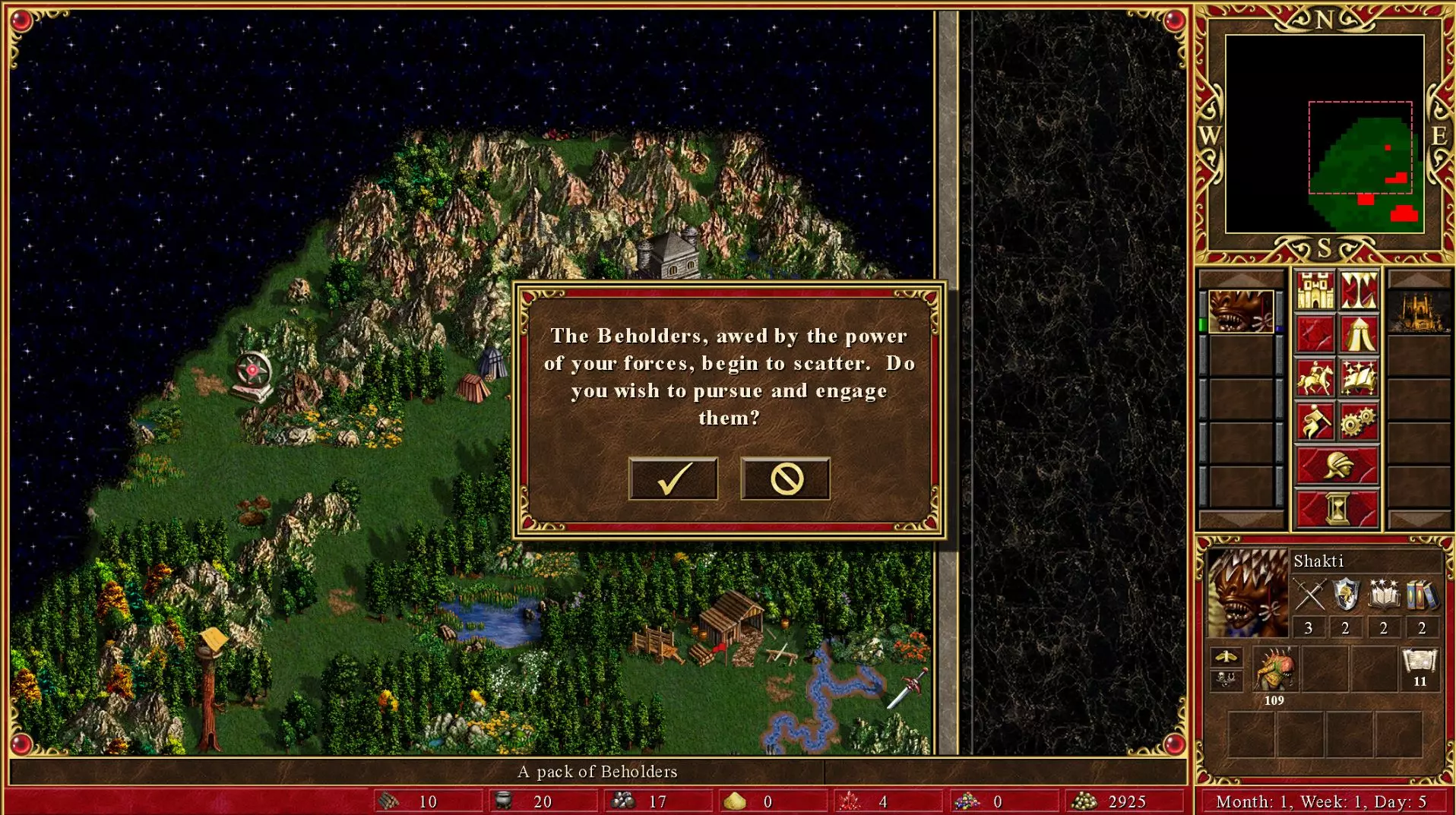 在组建天使大军前,你只需要用穴居人(trogs)攻克两个营地。 1a是一个由随机3级单位组成的营地。或者你可以选择1b,那里是随机2级单位。 监狱处是第二个营地,由一群随机3级单位把守。有时,这些监狱守卫会根据你的单位数量而逃跑。我曾见过一个眼魔(beholder)营地被109个穴居人组成的军队吓跑(有图为证)。