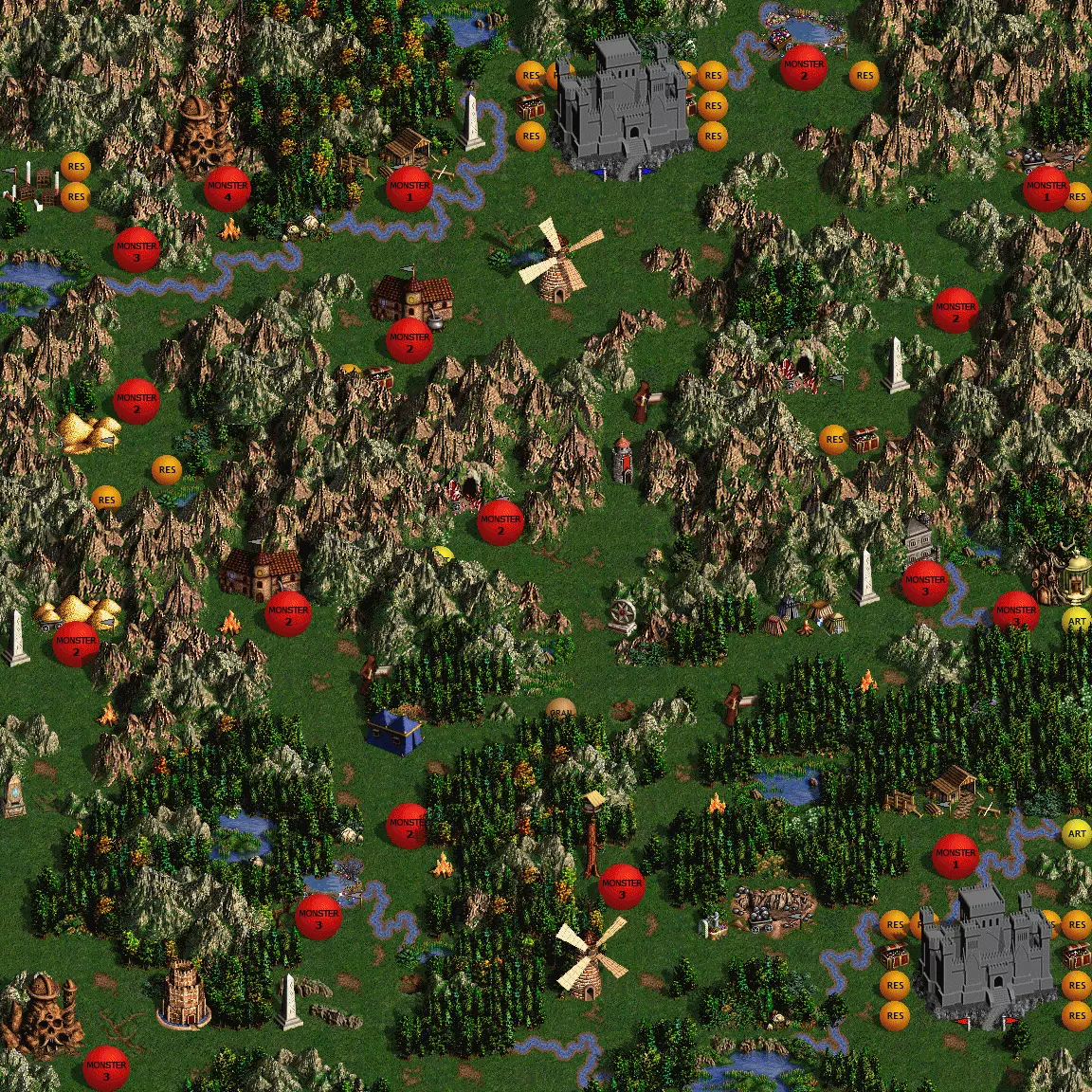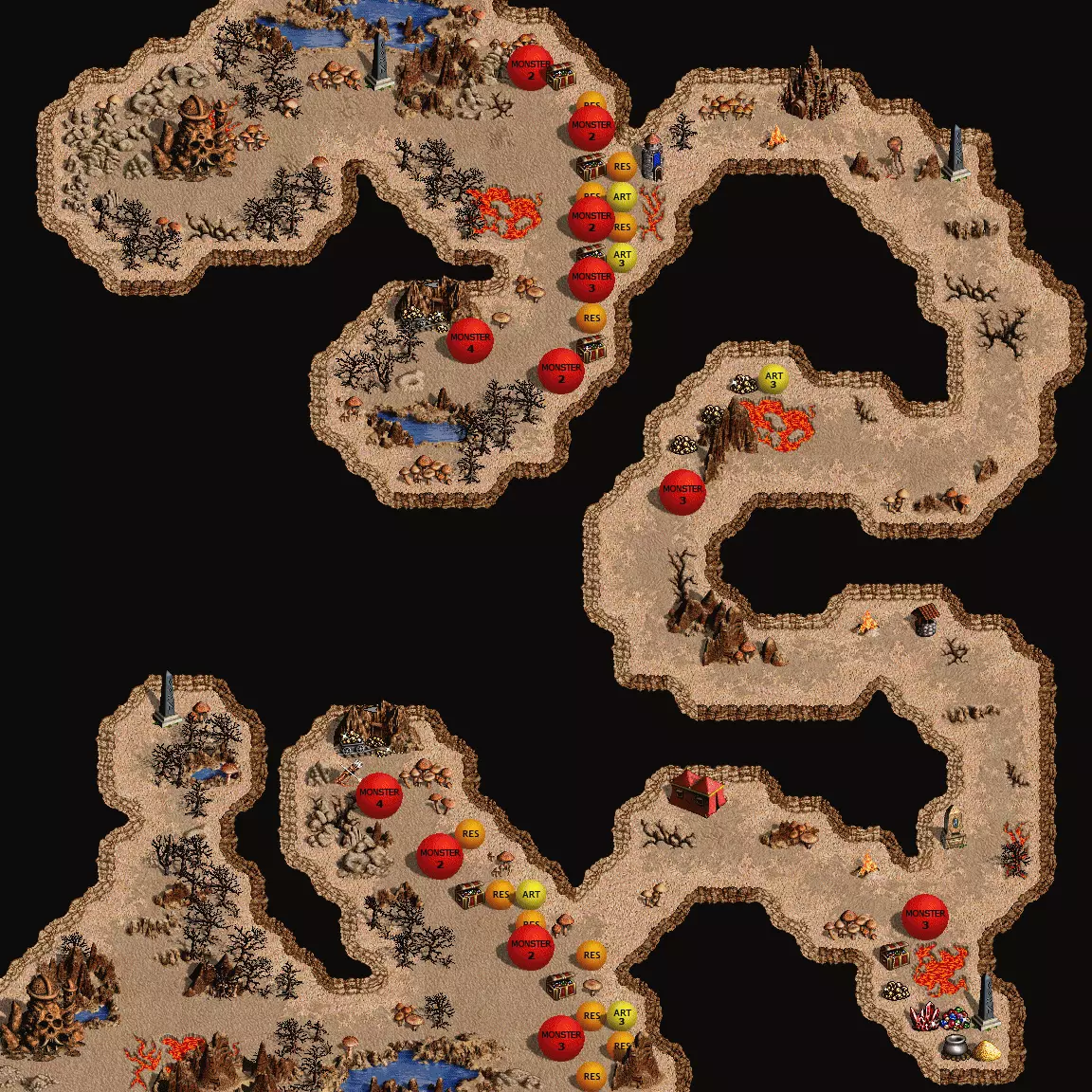 在地图编辑器工具中,点击工具栏中的【城镇】图标。然后双击默认城镇以打开窗口,并点击【驻军】选项卡。勾选【自定义】框,从下拉菜单中选择【大天使】,并将数量改为10。不过10个其实太多了,2-3个大天使就足以在第二周 rush 掉 AI 的城镇。 其他场景 我也能相对轻松地在【不可能】难度下完成【深陷死亡】场景,这得益于其较小的地图尺寸和单一对手。但要注意,此场景中 AI 初始拥有规模大得多的军队,因此根据为 CPU 选择的随机【AI 类型】(探索者、防御者或战士),情况可能会变得棘手。CPU 更庞大的军队和 AI 类型使这张地图更具挑战性且稳定性更低,但仍是一个可行的选择。地图部分 - 胜利的关键 此处包含完整的地表世界和地下世界地图,供参考和存档使用。