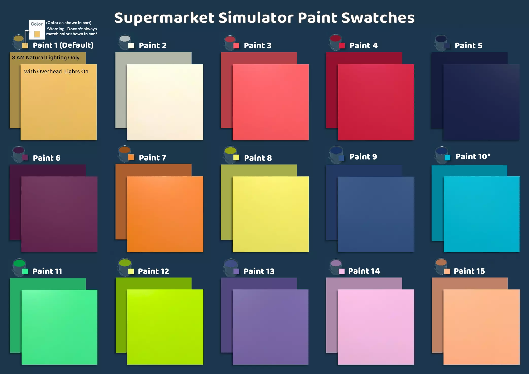 包含所有墙面涂料颜色的色卡,分别在上午8点自然光下和开启顶灯的情况下拍摄。地板色卡展示了上午8点自然光下铺设的地板,包含从 overhead view 拍摄的约1x1平方和3x3平方的区域。 墙面颜色