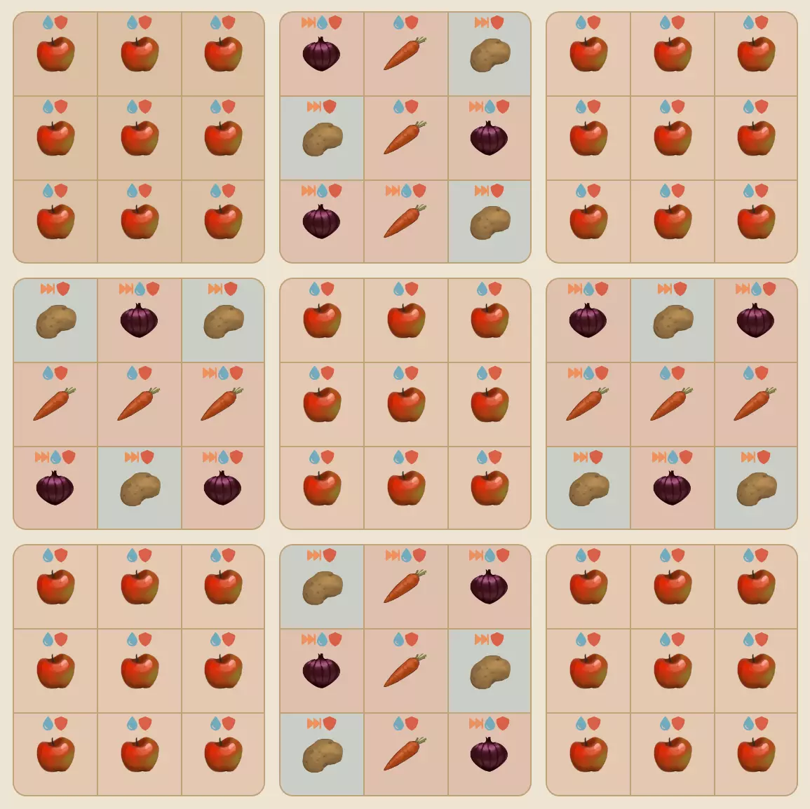 《帕利亚》高效花园布局赚钱指南:助你轻松盈利 最佳赚钱花园布局 以下是在《帕利亚》中赚取大量金钱的最佳花园布局。你可以将花园设为AFK模式,它将持续产出大量星品质苹果。 若你不想在游戏中保持AFK状态,可每小时(现实时间)登录一次游戏,让苹果树生长一个阶段。你只需在游戏中停留一秒钟即可生效。 该花园包含: - 五棵苹果树 - 100%自动浇水的苹果树 - 整个花园100%防杂草 - 完全支持AFK(除了初始设置和重新种植苹果树外) 设置步骤 开始前,你至少需要1颗苹果种子。它可以通过与泽基和奈奥的3级友谊任务获得,或者用园艺勋章从巴德鲁处购买(280枚勋章)。你还需要12个洋葱种子、12个土豆种子和12个胡萝卜种子(非必需,你可以根据需要替换胡萝卜)。最佳数量是5个苹果种子。 是否收获土豆、洋葱和胡萝卜然后重新种植完全取决于你。我只是让它们全部完全生长,只收获并重新种植苹果。 那么布局是什么呢? 完美的布局: