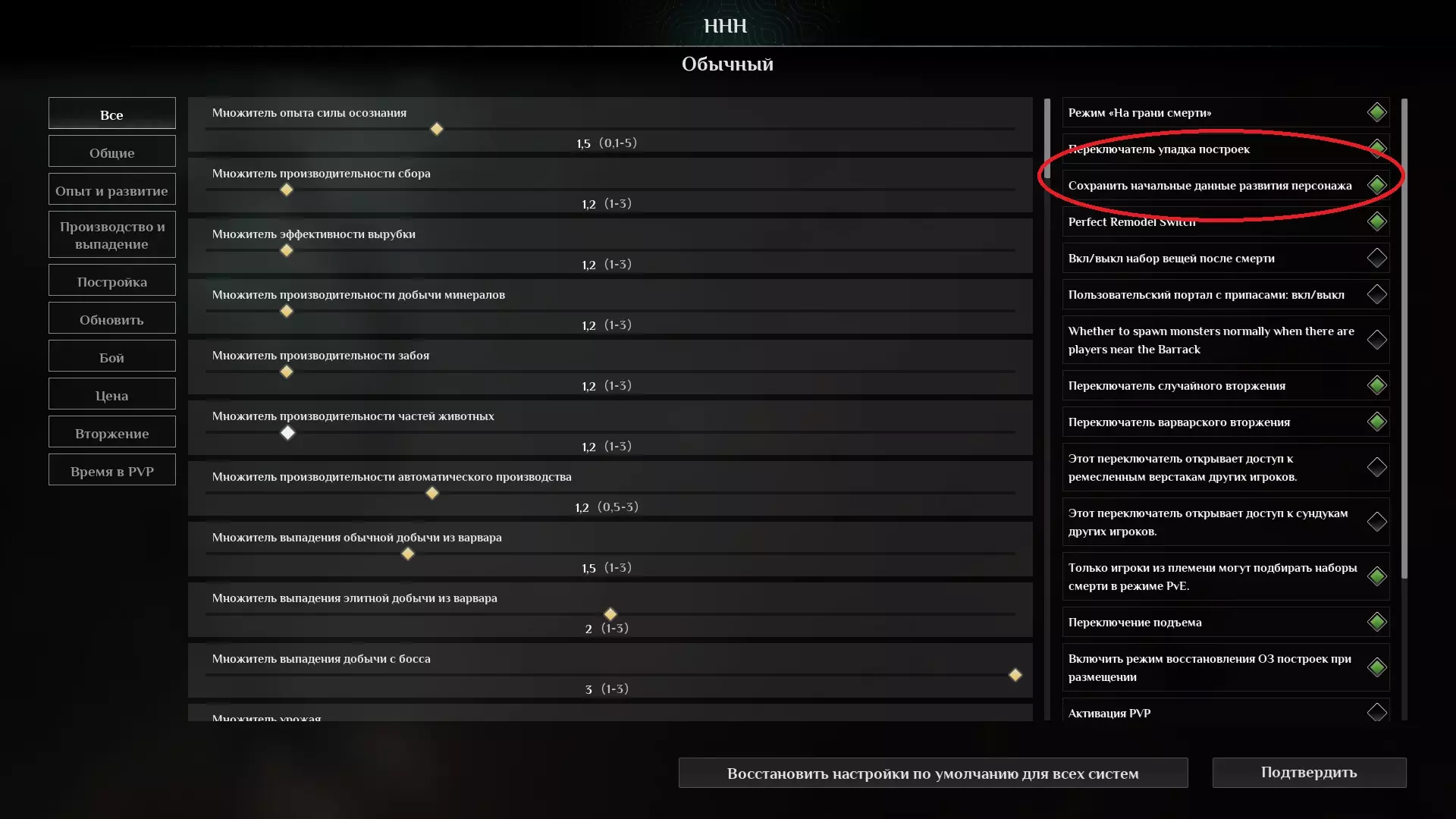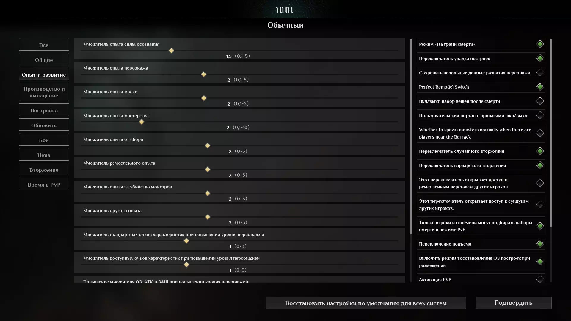 该怎么做?我会逐个引诱敌人——使用盾+剑,在格挡时抓住他们并进行反击,直到把他们的生命值打低。之后就和平时一样处理。 为什么要逐个引诱并用盾牌呢?因为来自队友瓦尔瓦拉的强化箭射向青铜级敌人时,可能会造成2000点伤害。 当然也可以采用更激进的攻击战术,这就看你自己的选择了。 该玩哪些航线?服务器设置。选择游玩哪些关卡取决于以下因素: 是否想按照开发者的设计初衷来体验游戏。 是单人游玩,还是与朋友一同游玩。 有多少空闲时间(尤其是用于游戏的时间)。 如果尚未游玩过这款游戏,且不想破坏初次体验的乐趣。想要了解所有机制、游戏发展流程以及平衡机制的运作方式,建议选择中等难度进行游戏并享受过程。 我在中等难度下游玩了45小时,期间产生了一些疑问。由于我是在自己的服务器上单人游玩,所以决定将倍率从1.2提高到2,因为在这种情况下,角色升级和游戏发展实在太过缓慢和冗长。所以,如果你和我有同样的感觉,以下是我关于这个主题的建议—— 之后我会录制关于这个主题的视频攻略。 不过简而言之,对于在自己服务器上的一两名玩家,为了获得舒适的游戏体验,又不会有作弊之类的感觉。 【经验与发展】、【生产与掉落】选项卡。初始设置为中等难度。