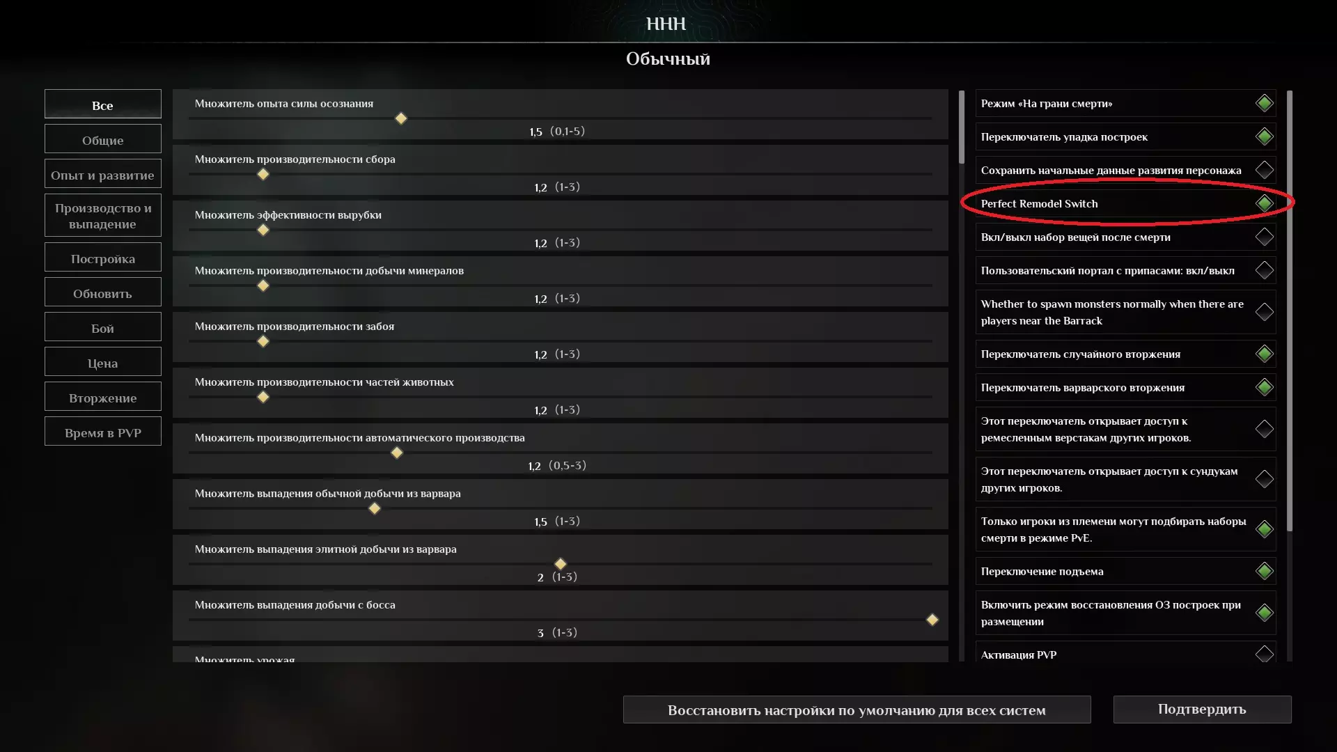 为防止已驯服的NPC(奴隶)在死亡后等级重置,需在游戏设置中(创建服务器时)勾选【高级设置】里的【Perfect Remodel Switch】选项。