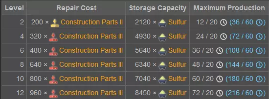 你的岛屿被硫磺淹没了?煤炭又脏又珍贵,舍不得用在发电厂?柴油产量越来越低,而你又忙着没时间去弄蒸馏厂? 别担心,各位船长,我做了些简单计算,会给你们指条明路!硫磺(几乎)是清洁能源,能成为你从煤炭过渡到核能/太阳能的桥梁。 更新3后的变化 2025年7月编辑: 各位船长! 更新3带来了许多新东西,这套装置的一些数据也变了! 我不会调整指南的其他部分,因为P.O.O.P仍然能用,而且每个人都得为自己的岛屿做计算。 以下是计算所需的关键数据: 厌氧消化器: 从每60秒7.5单位FG小幅提升到8单位FG,算是个小加强。堆肥产量翻倍,请注意这一点。 污泥转燃气比例: 2.25单位污泥可转化为1单位燃气 1单位污泥可转化为0.44单位燃气 硫磺转燃气比例: 此处有较大削弱: 1单位硫磺可转化为1.32单位燃气(对比更新2中的1:1.84比例) 合约: 8个模块下,1500单位硫磺可转化为4500单位污泥,比例为1:3 每船燃气产量(8个模块): 此处有大幅增强: 4500单位污泥可转化为2000单位燃气(之前为2160单位污泥转化885.6单位燃气) 硫磺矿: 维护成本从10增加至16,增幅60% 每班硫磺产量从36增加至54,增幅50% 总体而言,尽管维护成本增加了10%,但我认为这是一次增强。 现在可以通过办公室提升维护产出,但硫磺矿数量上限仍为1个。 存储似乎被削弱了?但在我看来影响不大。办公室: 你可以让市民处理一些表格工作(就像现实中负责人计算时那样),从而提升全球矿山效率!这会影响矿山的产量。 我认为最多能额外提升20%的产量。 结论: 【燃料气中的硫磺产出量】这一关键数据遭到了约28.26%的大幅削弱,起初我觉得情况不妙,但总体而言,我认为P.O.O.P变得更好了! 主要原因在于货船存储量的增加以及硫磺矿产量的提升: 为了抵消28.26%的损失,我们需要39.38%的增长,而硫磺在价值上的损失,在数量上得到了弥补:矿山每班产量提升了50%。因此,虽然单位硫磺的价值降低了,但硫磺的总量却大幅增加了。船只的增益效果应该会对工人的使用数量产生积极影响。由于缺乏旧数据,我还没有计算单位货物的燃料消耗,但也许你们中有人已经做过相关计算。不过货物量几乎翻了一番,单这一点对这种配置来说就是一个巨大的增强。我认为合约的团结点数成本大致保持不变。看起来它从2.2增长到了4.5,这与船只存储容量几乎翻倍的情况相近。 这么多硫磺该怎么处理? 这看起来眼熟吗?