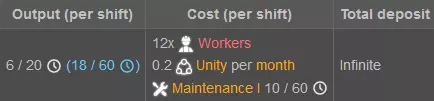 裂解装置可以轻松将其转化为柴油和一些水(这总是好的)。只需添加氧气! 这里的比例是1.5燃料气=1柴油 我们的885.6燃料气可以裂解成大约590.4柴油。该过程不会产生明显的废物,只需要一个空气分离器,该分离器需要6名工人/250千瓦功率以及一些维护。这几乎是免费的。即使扣除进出口设备的柴油使用量,最终柴油仍会是净盈余。 记住,1硫磺=1.84燃料气。这意味着你可以将1硫磺转化为1柴油,并剩余0.34燃料气用于其他用途。当你愤怒地挥舞拳头,哀叹那些从所有储存设施中渗出的“金色粉末”时,请再想想这个比例。这让我想到最后一个值得思考的问题:硫磺矿。 硫磺开采 如果你想最大化P.O.O.P的理念,就需要有宏大的规划。仅将硫磺作为副产品是不够的,你必须进口硫磺。这也是此设置的一个重要注意事项: 你需要联合体来运营矿场,还需要另一艘货船(货船同样需要柴油和劳动力),这就涉及到货运站更高级的使用方式了。 但在默认设置下,矿场是无限资源的! 不过无论如何,如果你想在石油化工或农业之外更多地使用燃气,那么这样做是值得的。 你可以亲自尝试一下。