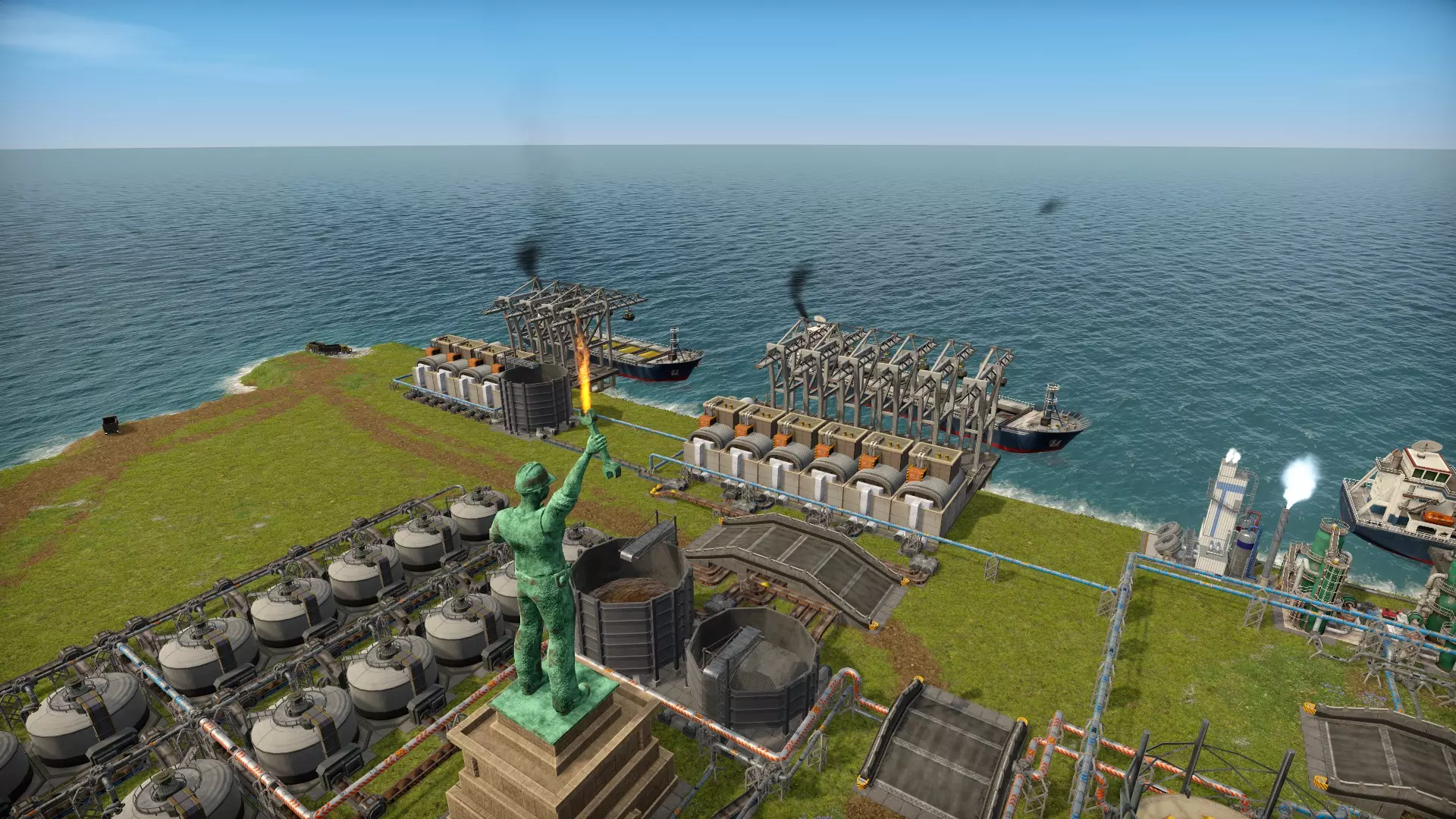 你手头有数据,可以随意计算。我们可以看到,如果你全力以赴,那个硫磺矿大约能产出39744燃料气/60。你需要自己决定这是否值得(以及你是否真的能出口这么多硫磺)。 我的配置和结论: 我在最后一个岛上有1个6号货运站执行合同,还有20个消化器在海岸线运行。听起来数量很多,但厌氧消化器的好处是它们的需求不高。1个消化器需要4名工人和50千瓦电力。 1台燃气锅炉仅靠进口气体就能持续运行,另一台则需要大约每30分钟手动操作一次。 硫磺矿采用“设置后自动运行”的配置。进口码头旁的货物实际上通过优先排序的平衡器接收了所有岛屿的硫磺产量,并且也装满了。我懒得相应地调低矿场的班次/产量,这样或许能节省一些统一货币和工人。我只想确保进口船只不断运行,为我的岛屿带来更多免费能源,同时确保我的岛屿不会被硫磺淹没。目标达成。 气体被导入我的石油化工储罐,该储罐设有过满/过空警报,我会相应地开关第二个燃气锅炉。但这真的取决于你的设置和情况。我附近还有两个很棒的装置,它们也能补充我的柴油产量,省得我费心扩建蒸馏器列(我太懒了,想避免这么做)。 我认为这种设置是燃煤和核能之间的有效过渡方案。在我的测试中,我甚至根本没启动反应堆,因为太阳能板的发电量逐渐接管了供电,最后我几乎不需要烧煤了。进口的燃气足以满足我基地的基本电力需求。 燃气是一种不错的能源,因为通过管道运输比用传送带运煤要好,而且在某些方面它更灵活、更清洁。希望本指南对你有所帮助,最后附上我制作的【便便米修斯】雕像图片,它手持永恒之火,守护着我的消化器装置。