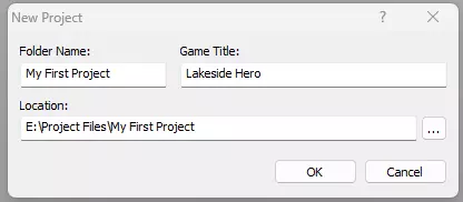 左键点击此图标,将弹出“新建项目”对话框。另外,你可以通过左键点击带有绿色箭头的文件夹图标来打开已保存的项目,这将打开文件夹资源管理器,你可以在其中找到已保存的项目。 接下来这部分很关键。屏幕上的对话框有三个文本框:文件夹名称、游戏标题和位置。文件夹名称为“我的第一个项目”,游戏标题为“湖畔英雄”。 你会注意到我的文件路径是E: Project Files My First Project。