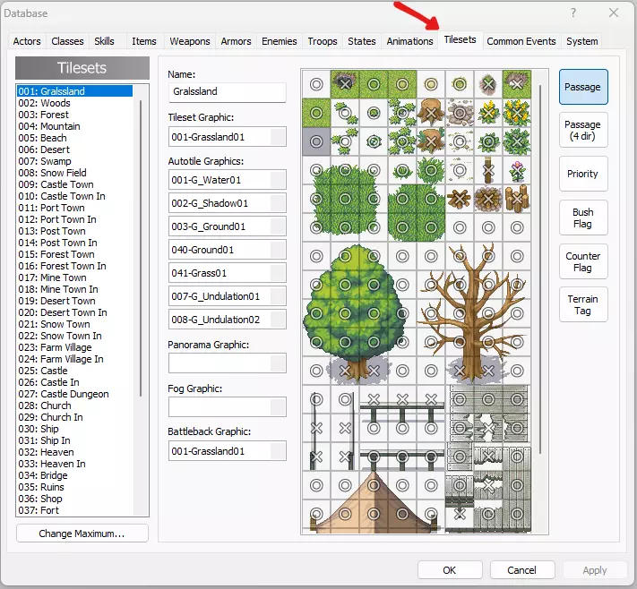 现在你应该能看到数据库对话框了。数据库并非独立窗口,而是一个对话框,这意味着在数据库打开时,你无法编辑地图或事件。不过,还是请点击【图块集】选项卡,位置如图所示。