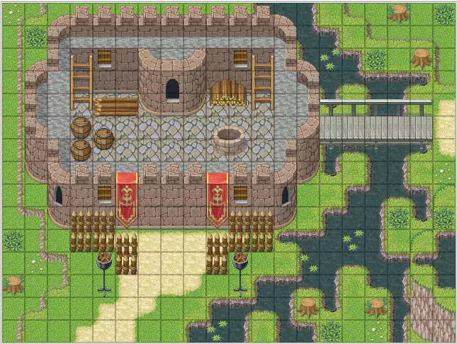 随着最后一部分的完成,桥梁守护者 boss 现已制作完毕。简单回顾一下,我们已经涵盖了:变量、开关、基本事件、条件命令、创建敌人、玩家在地图间的传送、战斗处理、地图编辑以及一些设置部分。到目前为止,你绝对拥有制作几款简短有趣游戏的知识了。当然,真正让 RPG 游戏焕发生机的是 NPC 和任务。 猎杀巨龙的任务 我们的玩家目前有一个安全的中心区域和一座危险的桥梁。我们需要一种方法来让他们升级和获取装备,以应对这个艰巨的挑战。要做到这一点,我们需要派他们去执行一项任务,在这个项目中,我们将派玩家去获取一把可以轻松斩杀巨龙的剑。为此,我们需要有人来给我们发布任务。还有谁能比骑士更合适呢?设计一张属于你自己的堡垒地图,并将其命名为“堡垒”。别忘了图层是如何运作的!不过,在制作了前几张地图之后,我相信你一定能打造出一座和下图中我的堡垒一样出色的堡垒。