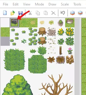 需要记住的是,哪些区域可通行以及通行方向是由图块集决定的。图块集中每个单独图块的设置可以在数据库中找到并编辑,我们将保留所有默认设置。 现在我们要让玩家能够到达地图的两侧。记住,玩家在第一层和第二层上方行走,但在第三层后方。有些图块,比如桥梁图块,不是完整的图块,所以如果我们把它们放在第一层,相邻图块之间会留下空白。这就是为什么玩家在第一层和第二层上方行走,这样部分图块可以在有背景的同时,仍然作为玩家的路径图块。现在我们知道了这一点,从 tileset 的人行道地砖中选择地砖,然后用制作湖泊的相同方法建造一座桥。作为额外的挑战,给你的桥添加栏杆和支撑结构。