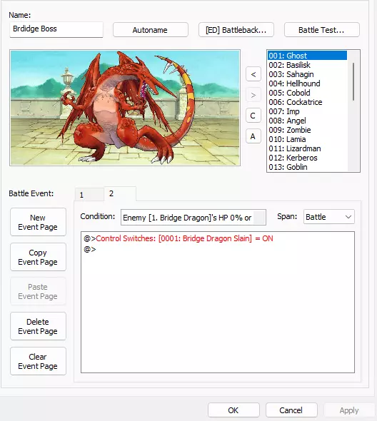 不过我们仍然需要激活这个开关。为此,我们需要在数据库的【Bridge Boss】队伍中添加一个事件页,并添加命令,以便在战斗期间敌人生命值降至0%或以下时,开启【0001: Bridge Dragon Slain】开关。
